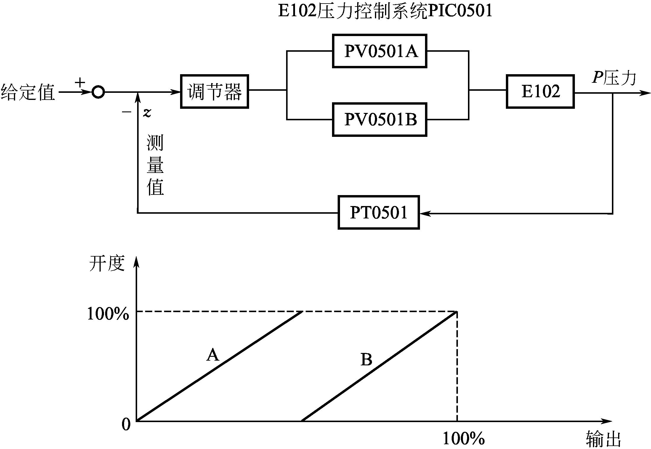 b.分程控制系统 所谓分程控制系统就是一个调节器分别控制两个或更多调节阀构成的控制系统。例如图2-36甲醛装置废热锅炉E102蒸汽压力控制系统,PIC0501A/B为分程调节系统。甲醛装置废热锅炉E102产生的蒸汽,由PV0501A阀送出,PV0501B阀是一个放空阀,锅炉蒸汽压力调节由PV0501A/B两个阀进行分程调节。