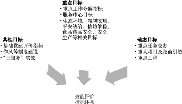 机关综合绩效评价的指标体系由重点工作目标、动态工作目标和共性工作目标三部分组成,机关党建工作指标包含在共性目标之中,机关效能党建效果体现在重点工作目标、动态工作目标上,可用图3加以说明。同时,在目标制定上,实行源头控制,从严审核把关,并将部门制定目标的态度和水平、目标实施的难易程度,作为考评工作的第一环节,与定档打分直接挂钩,确保制定的目标体现高点定位、争先创优的要求。