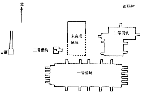三号坑与一号坑相距25米,东距二号坑120米。坑的平面呈凹字形,坐西面东,东边有一条斜坡形门道。三号坑的面积较小,东西长28.8米(含门道长),南北宽24.57米,距现地表深5.2~5.4米,面积约524平方米。为摸清坑内埋藏情况,1977年3月至12月,我们对该坑进行了试掘。坑内有木质战车1乘,陶俑、陶马72件。该坑是地下坑道式的土木结构建筑,因木质腐朽造成俑坑塌陷。在坑的北部西侧发现一个直径约1.5米的盗洞,在俑坑塌陷前盗贼从此盗洞进入坑内,把青铜兵器等重要的器物盗去,并把陶俑、陶马打碎,许多俑头被拿去,因此很多俑仅存残破的躯干。这是在什么时候被什么人盗掘和破坏的,当时还不易做出准确的判断。