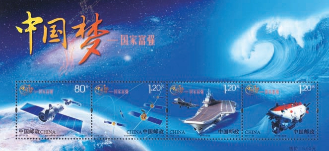 2013年9月,中国邮政发行《中国梦——国家富强》特种邮票。邮票图案分别为:“神舟九号”飞船与“天宫一号”交会对接、“北斗”卫星导航系统、“辽宁号”航空母舰、“蛟龙号”载人潜水器