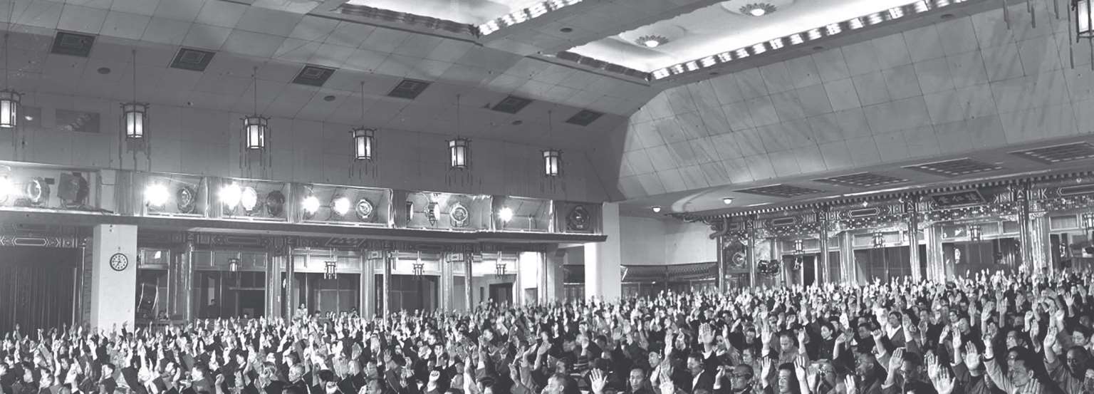 1954年9月,北京中南海怀仁堂,中华人民共和国的缔造者们,同经过普选产生的1 200多名全国人大代表一道,召开了第一届全国人民代表大会第一次会议。大会通过了《中华人民共和国宪法》,明确规定:“中华人民共和国的一切权力属于人民。人民行使权力的机关是全国人民代表大会和地方各级人民代表大会。”一个人民当家作主的新型政治制度,由此在古老而崭新的中国落地生根、开花结果……