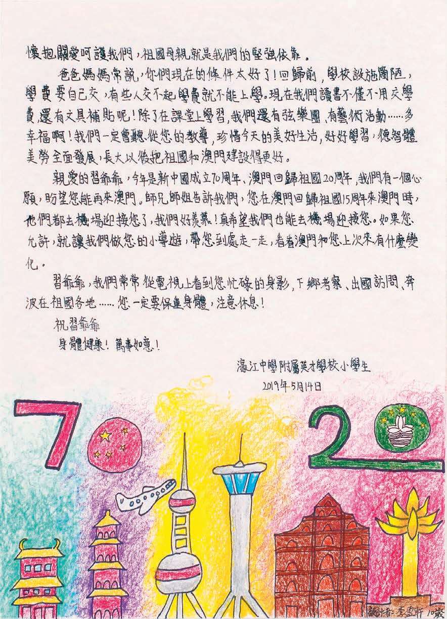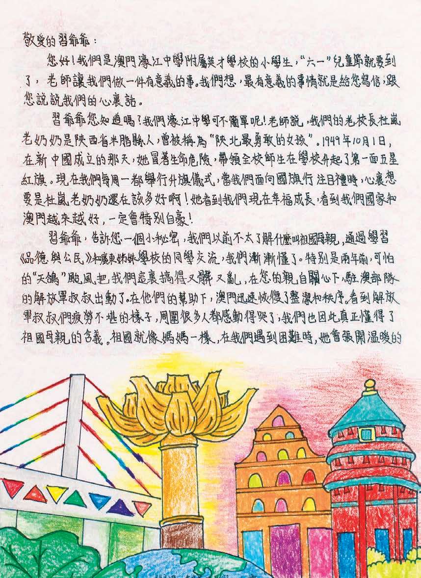 2019年“六一”国际儿童节前夕,澳门濠江中学附属英才学校的小学生给习近平爷爷写信,讲述他们对“祖国母亲”含义的理解,表达长大后把祖国和澳门建设得更美好的决心。