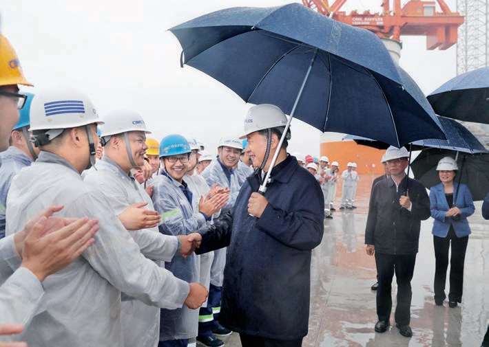 2018年6月,习近平爷爷冒着大雨来到山东省烟台码头,察看海洋工程设备建设场地,同现场的工人们亲切握手。