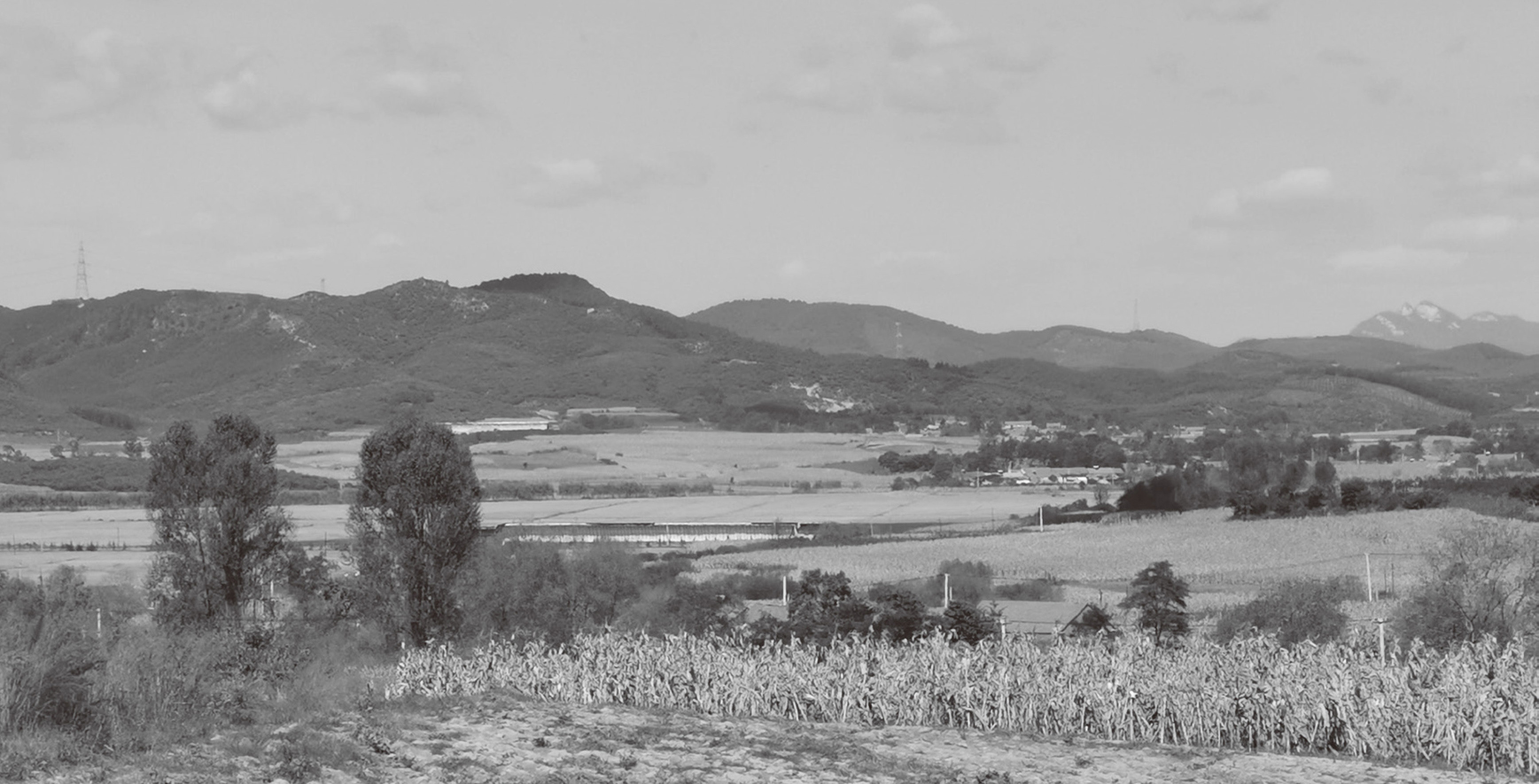 这张照片是在大队最南端的杨岚子小山上拍摄的,收入画面的是大队东半部的土地,包括中间的小盆地和东部的荷包口部。右部中间的小村就是南房身。远处的青山就是凤城市的土地了。