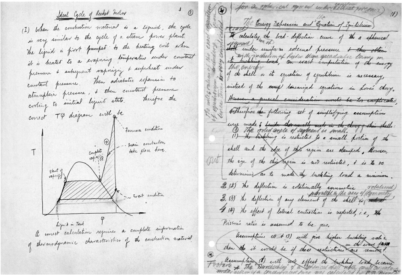 1940年,在冯·卡门的具体指导下,钱学森的研究工作有了进一步的深入,他发表了《球壳外压屈曲》论文。在26页的手稿上,工整秀气的字体是钱学森的,而飞逸花哨的字体则是他老师的,师徒二人的智慧浑然一体。
