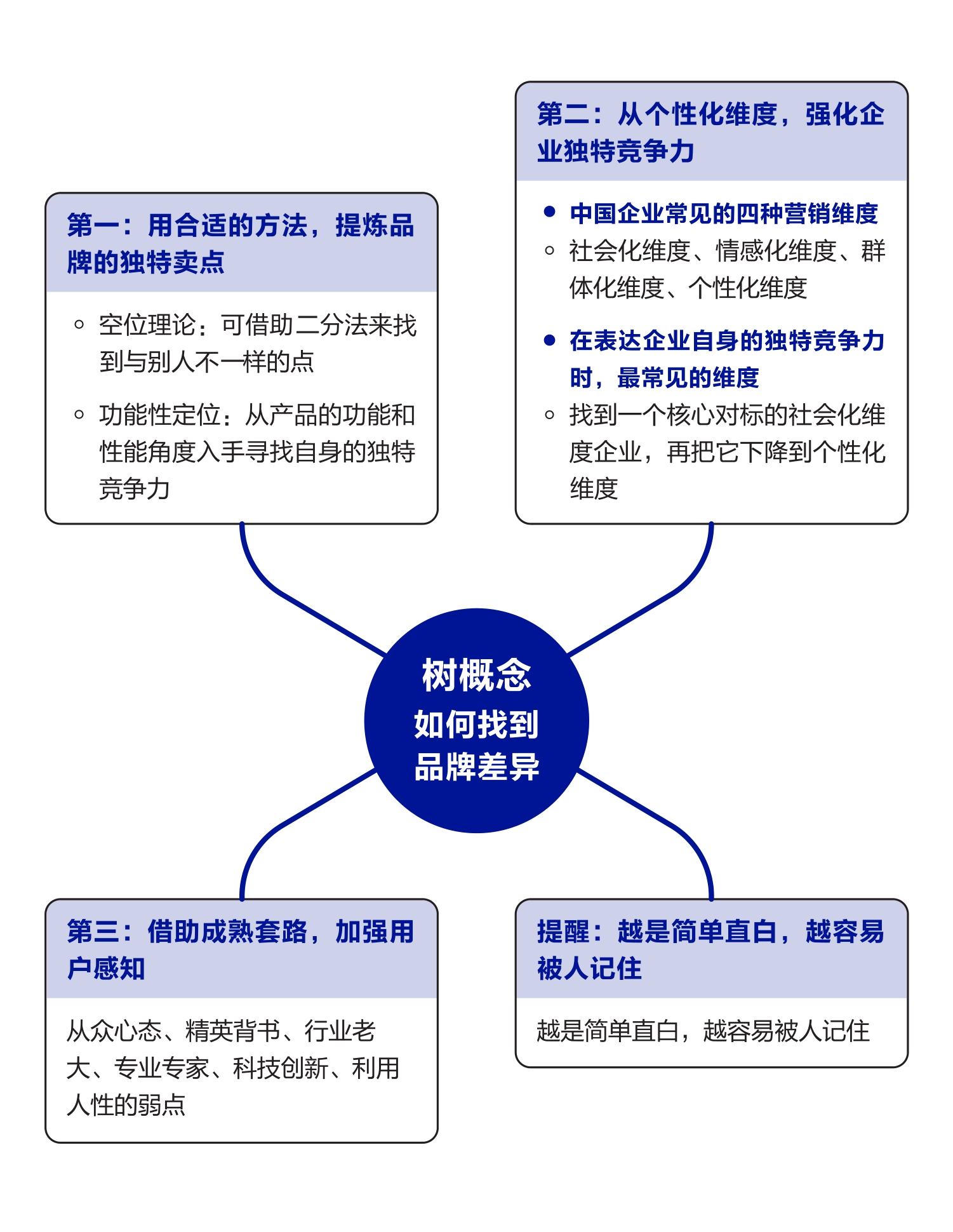 接下来,我们从第一步树概念开始讲起。所谓“树概念”,简单来说就是明确企业的核心竞争力到底是什么,别人为什么要选择你而不是其他同类型企业。很多企业的老板一听到关于核心竞争力的问题,总是会回答说企业有原料优势、供应链优势、产品研发优势、团队优势等。
