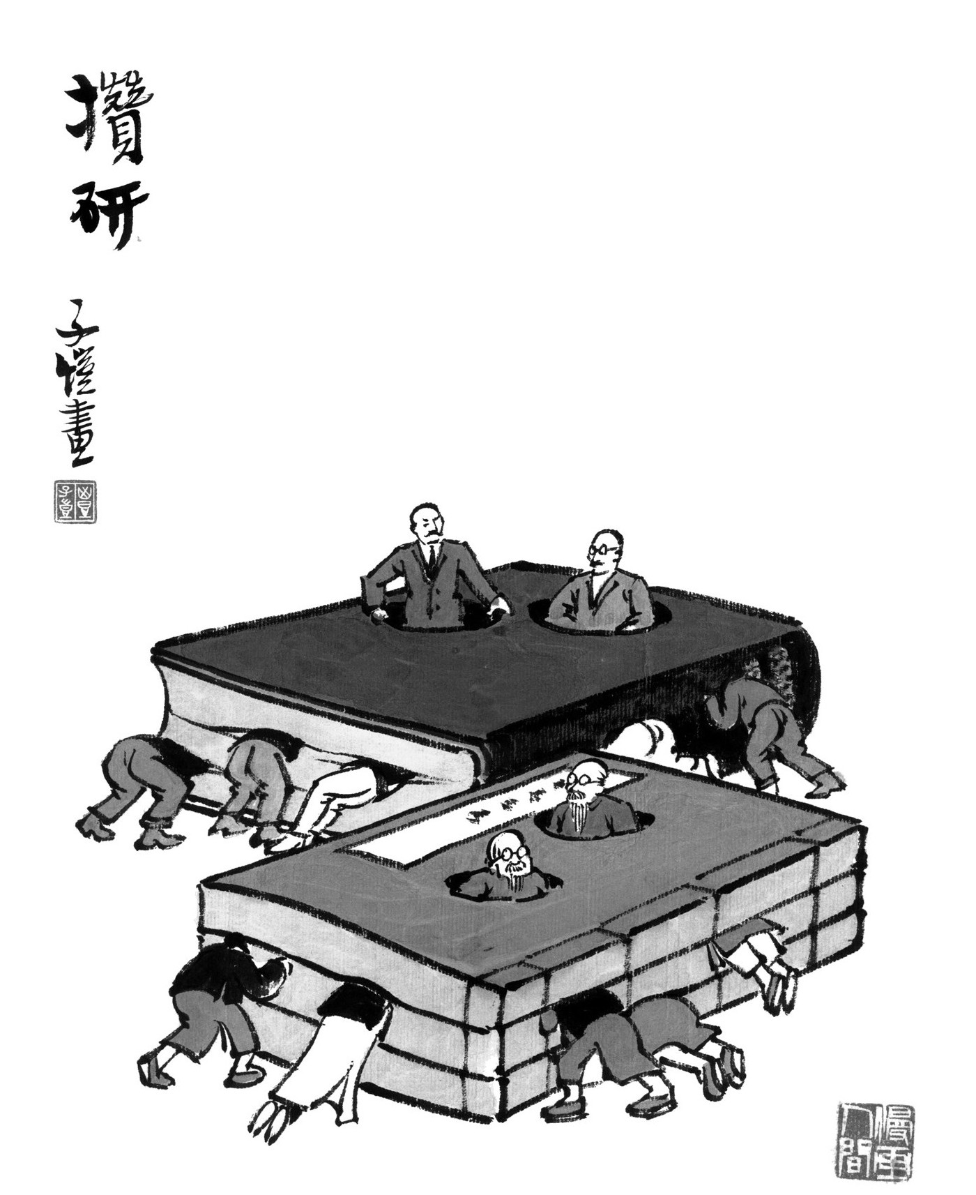 第三个横死的叫W,是石门湾首富Z的独子。Z开米店,其店就在我家染店的斜对河。Z每天从对河走过,人们都说他走路时两手掉动像龟手,是发财相。他既发财,对W这独子当然宠爱,W在校中,衣裳穿得最漂亮,上海初有皮鞋,他就穿了,上海初有铅笔,他就用了。沪杭初通火车,他首先由父亲伴着去乘了。乘了回来吹牛给同学们听,说火车走得极快,两旁的电线木同栅栏一样。听者为之咋舌。辛亥革命了,他把辫子盘在头顶,穿一件淡蓝色扯襟长袍,招摇过市,见者无不啧啧称赏。总之,那时的W,是石门湾的天之骄子。小学毕业之后,我赴杭州求学,难得回乡,对W日渐生疏。但闻知他的父亲死了,他当了家,在家里纳福。有一个无业游民叫Q的,也是小学的同学,不过年级比我们低。此人做了W的跑腿,天天在他家里进出,沾点油水,所以人们称他为“火腿上的绳”。抗战开始,我率眷西行,W的情况全然不知。抗战胜利后我回乡一行,才知道W已迁居城内,没有见面。解放后,我居上海,传闻W为壁报作画,获得好评。原来他在小学时就以善画出名,人们称他为“小画家”。后来,听说Q到浙江某地劳动,在那里揭发了W的一件命案。于是W被捕入狱。他一向是养尊处优、锦衣玉食的,哪里吃得消铁窗生活,不久就死在牢狱里了。他有一个女儿,昔年我曾见过,相貌很像她父亲。听说是个很能干的医务工作者。