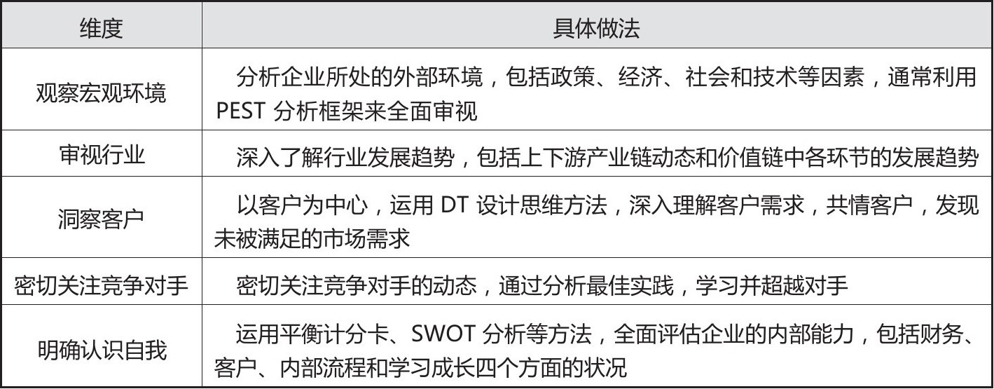 机会,是指企业未能充分利用的潜在增长点,是企业未来发展的关键。为了帮助客户有效洞察未来发展机会,导入“五看”模型,即观察宏观环境、审视行业、洞察客户、密切关注竞争对手、明确认识自我。如表2-1所示。