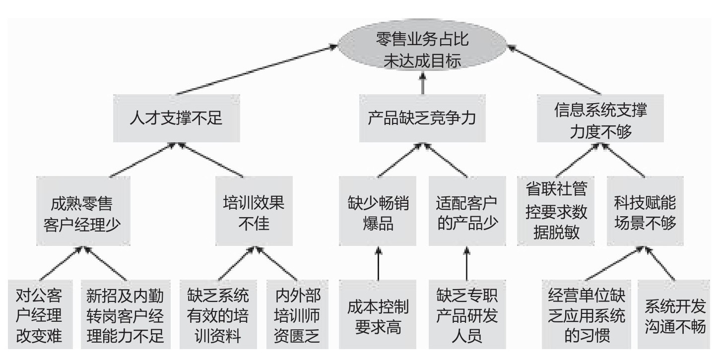 以某银行为例,他们的目标是使零售业务占比达到50%以上,而实际是零售业务占比仅为30%,用“问题树”(图2-4)引导各级业务管理人员进行问题的拆解,从而找到形成差距的多方面原因,共识弥补差距的着力点。