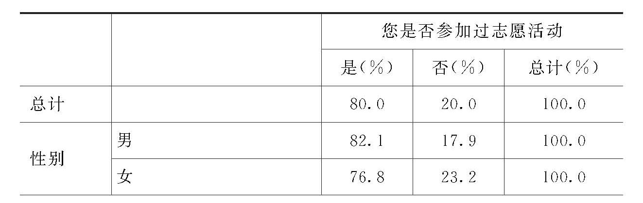 对此问题回答“在学校曾经当过志愿者”的党员比例占100%。年龄在41岁以上的党员曾经当过志愿者的比例比较低。其他自变量与因变量之间关系的差异不明显(男性党员比例略多于女性党员)。在此问题上,没有显著的有正相关的情况。
