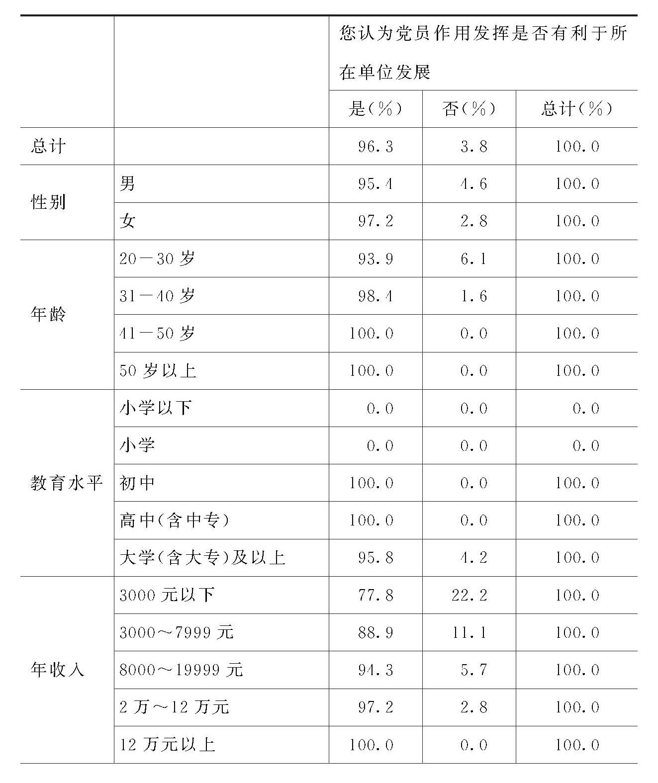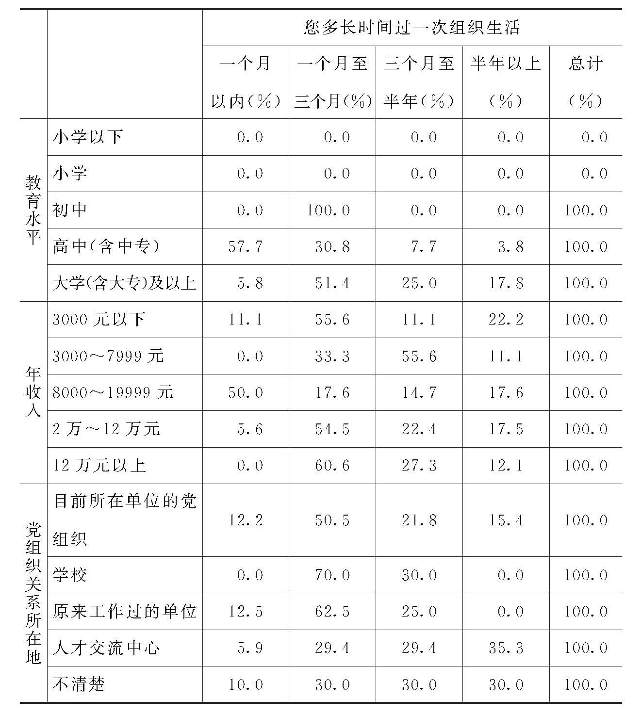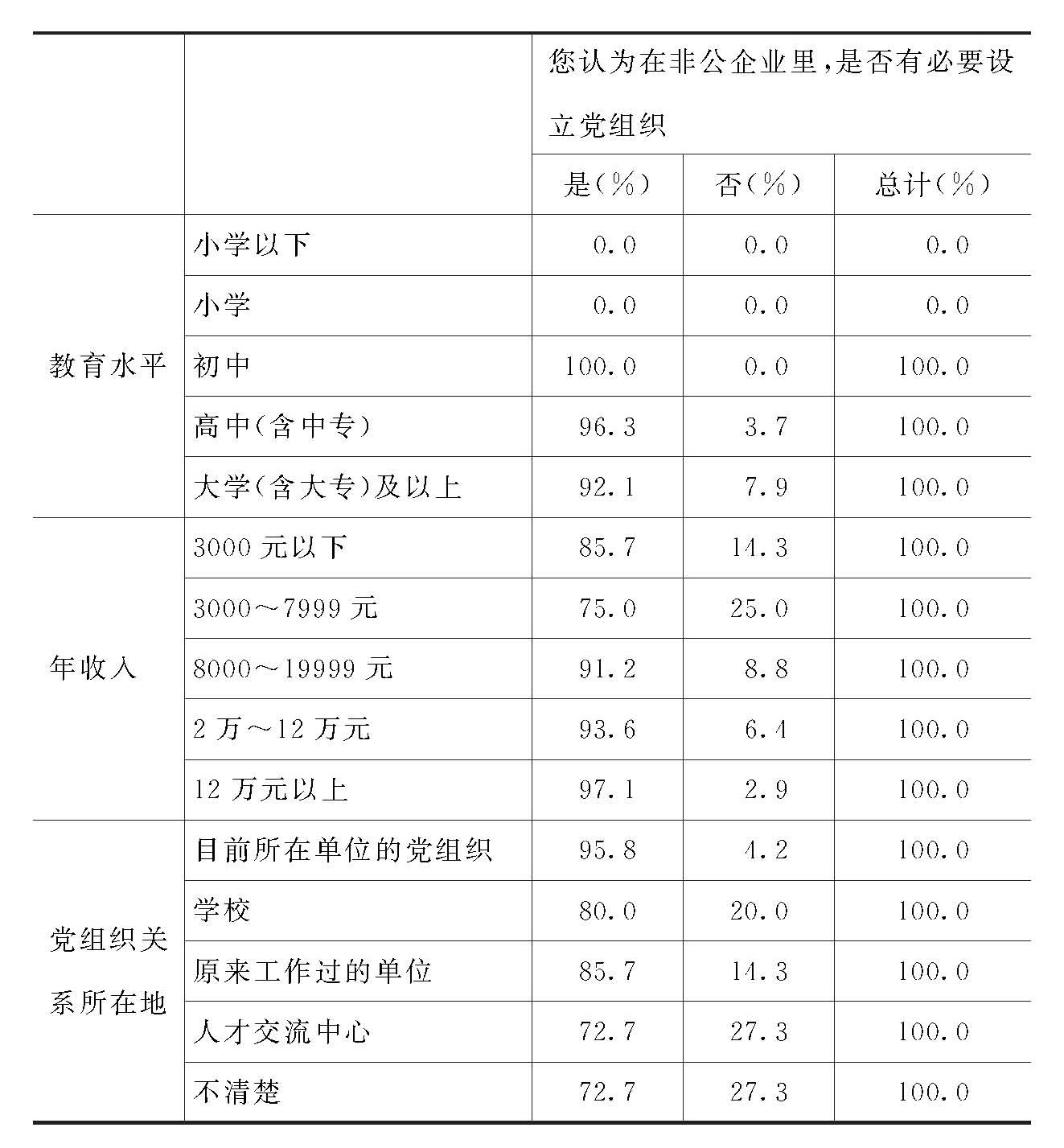 对此问题的回答无性别、年龄、文化程度方面的明显差异。但在组织关系在现在的单位、在原来的单位、在学校和在人才交流中心的党员中,作肯定回答的党员比例依次递减。从3000元年收入的党员开始,收入越高的党员,对此问题作肯定回答的比例也越高。
