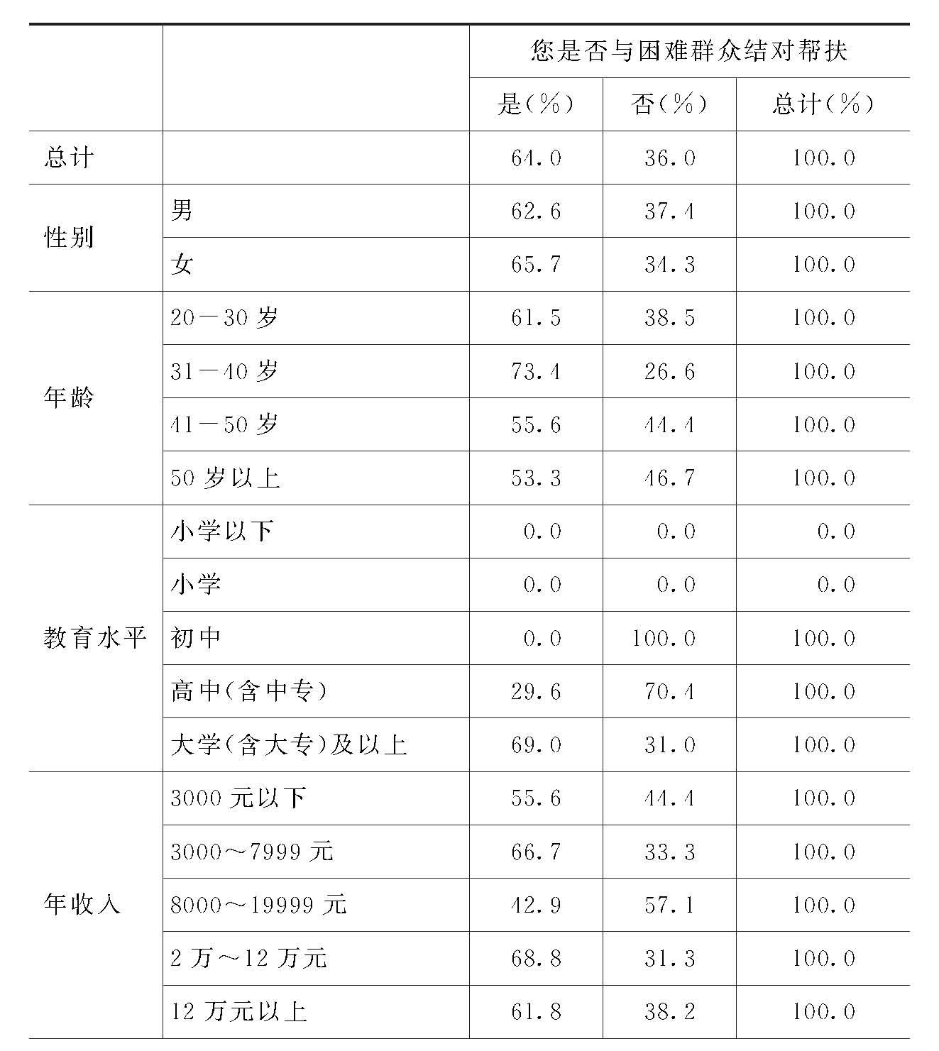 在回答“是否与困难群众结对帮扶的百分比”方面,各变量之间基本无显著差异(女性党员比例略高于男性党员),一般认可的比例在50%-60%之间,但年收入在“8000-19999元”的党员对此问题持肯定回答的比例略低,为42.9%。高中文化程度的党员对此问题持肯定回答的比例偏低,为29.6%。初中文化程度的党员对此问题持否定回答的比例是100%。估计“与困难群众结对帮扶”状况应该和这些党员自身的经济条件有关。在此问题上,没有显著的有正相关的情况。