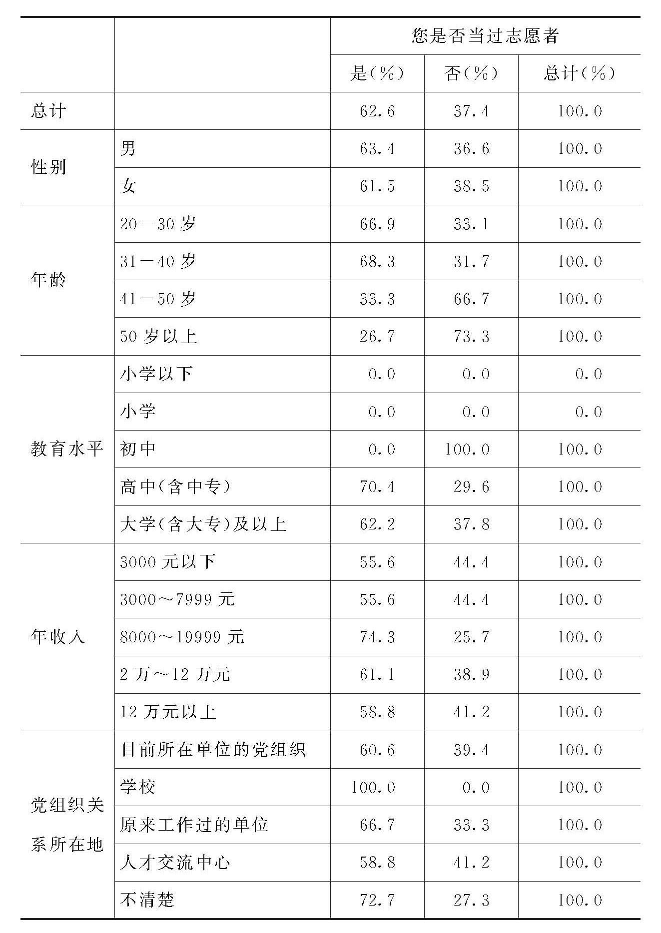 9-2.不同性别、年龄、教育、收入、党组织关系所在地的党员,是否当过志愿者的百分比