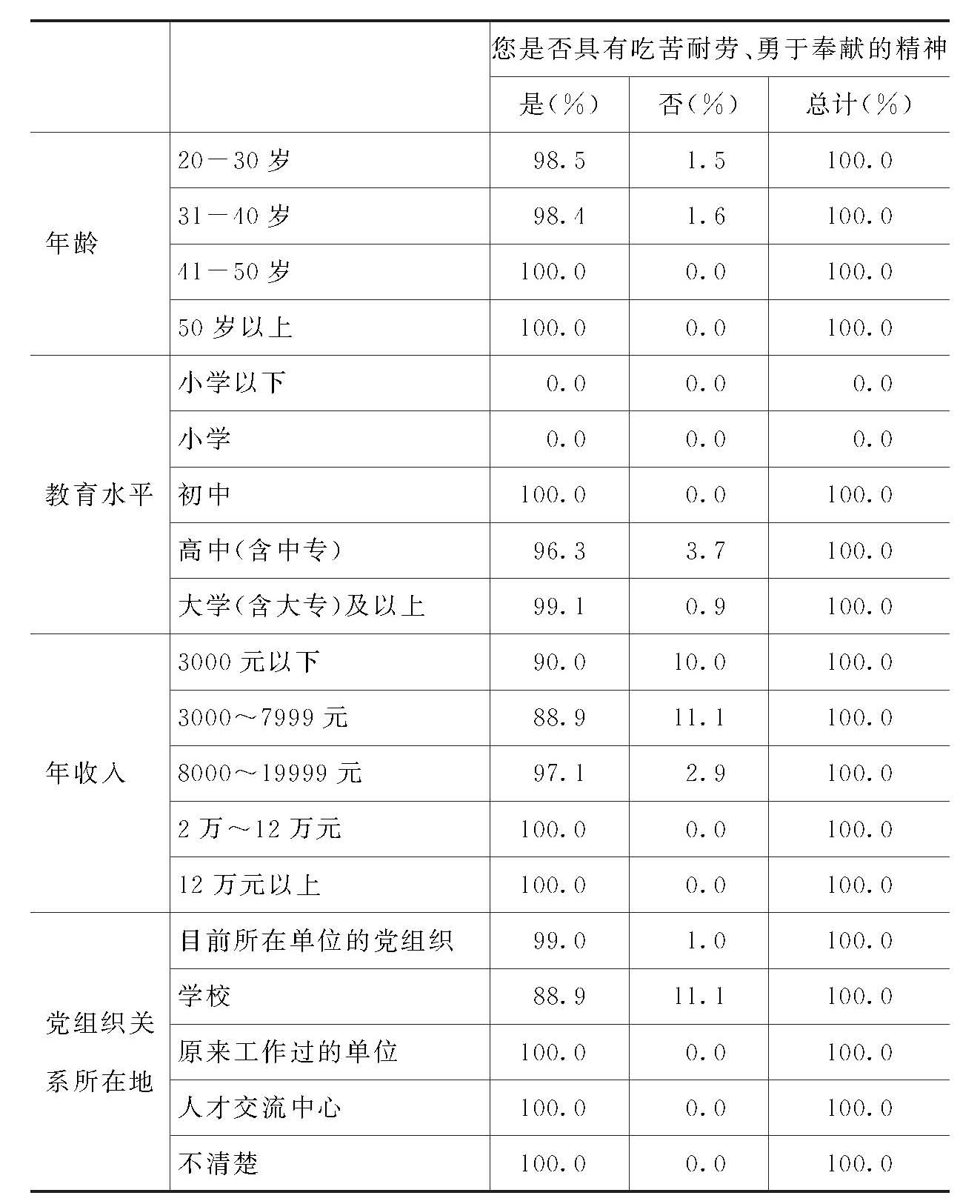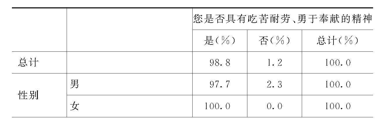 这说明,除年收入在“3000元以下”和“3000-7999元”、党组织关系在原来上学的学校的党员认为自己具有吃苦耐劳、勇于奉献精神的比例略低以外,其他类别的党员认为自己具有吃苦耐劳、勇于奉献精神的比例均很高,达98%以上,但女性党员比例略高于男性党员。在此问题上,没有显著的有正相关的情况。