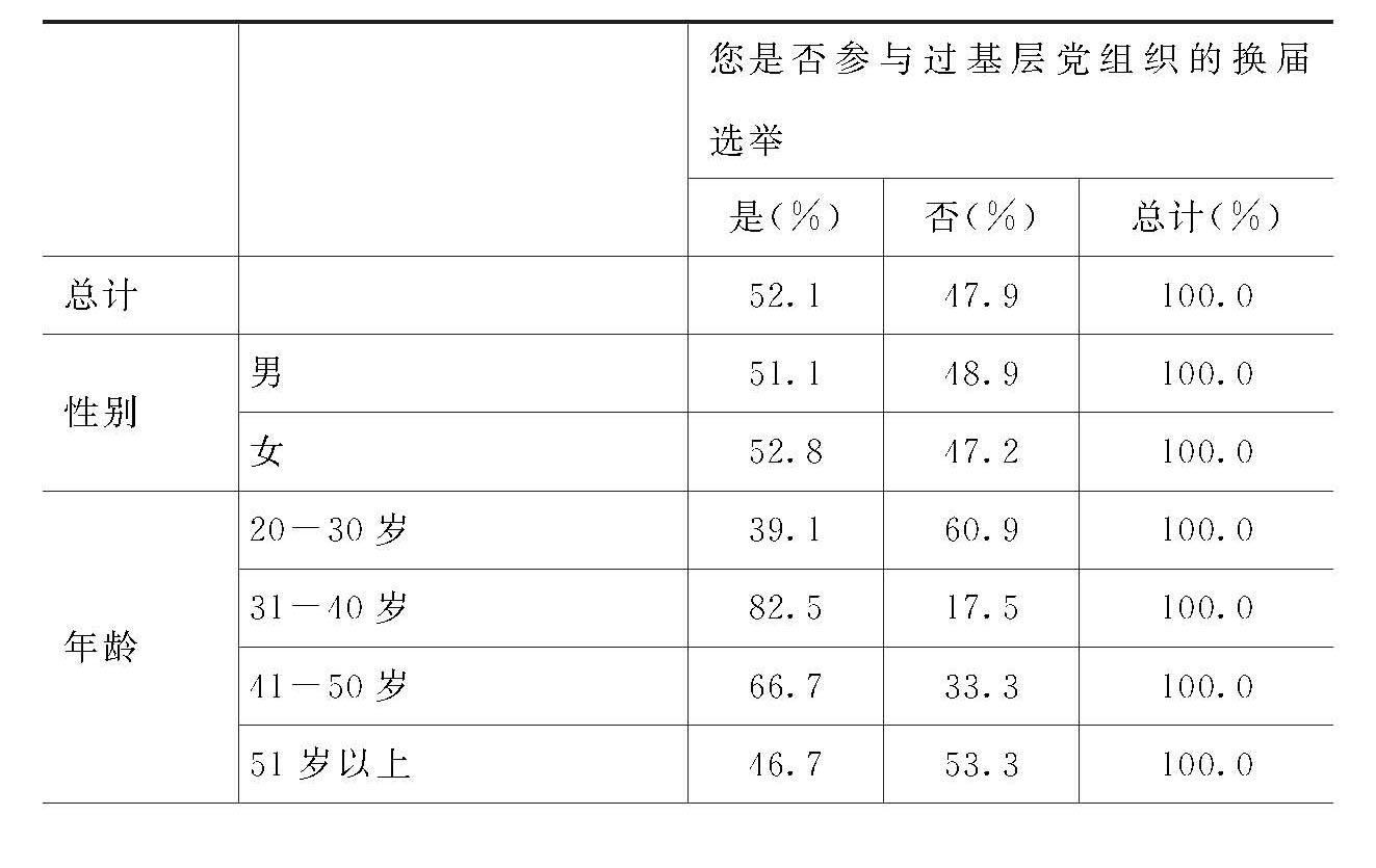 这说明,在“参与基层党组织换届选举”方面,男性党员和女性党员比例大致相当,31-50岁党员的比例高于30岁以下和51岁以上党员的比例,大学以上文化程度党员的比例高于高中、中专文化程度的党员比例,年收入2万元以上党员的比例高于年收入2万元以下党员的比例,党组织关系在目前单位、在原来工作过的单位、所毕业的大学的党员比例大致相当,前者略高。