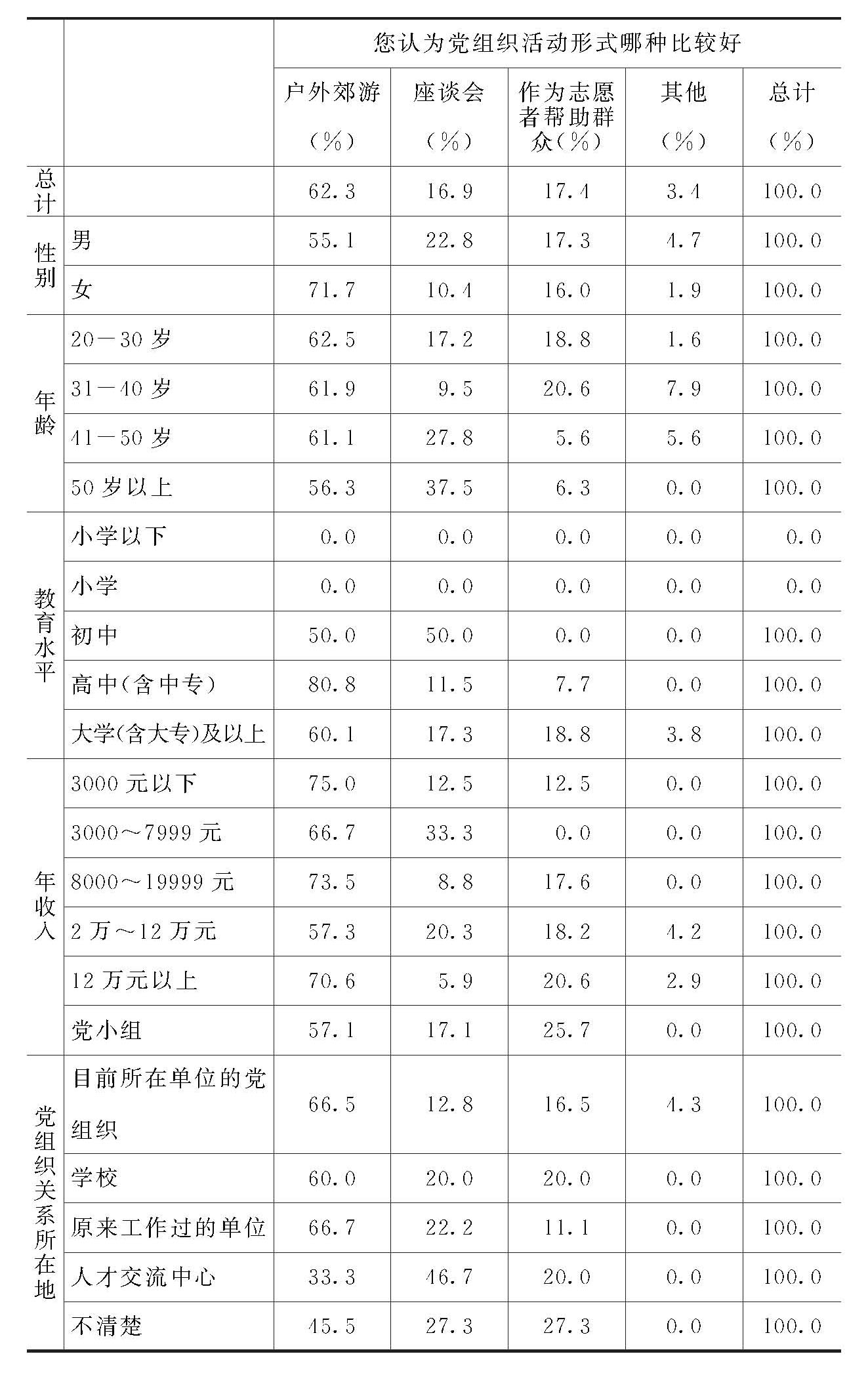 对此问题的回答,多数人认可“户外郊游”的方式,年龄上无显著差异(除50岁以上党员比例略低外),但女性党员比例高于男性党员。文化程度方面,初中文化程度的党员赞成户外郊游的比例与赞成座谈会方式的党员的比例各占50%。高中文化程度的党员赞成户外郊游的比例最高,达80%。大学以上文化程度的党员赞成户外郊游的比例处于中间状态,为60%。年收入、组织关系所在地两个自变量与“户外郊游”之间无显著正相关关系。