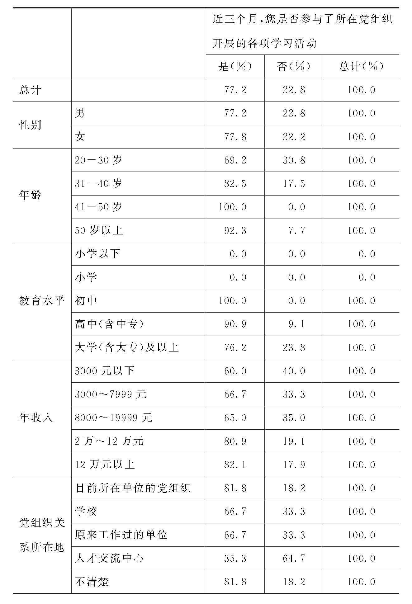 3.不同性别、年龄、教育、收入、党组织关系所在地的党员,近三个月是否参与了所在党组织开展的各项学习活动的百分比