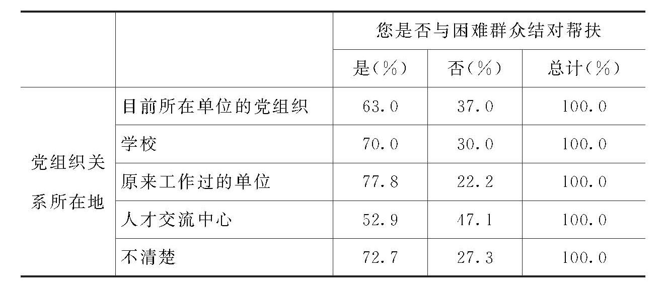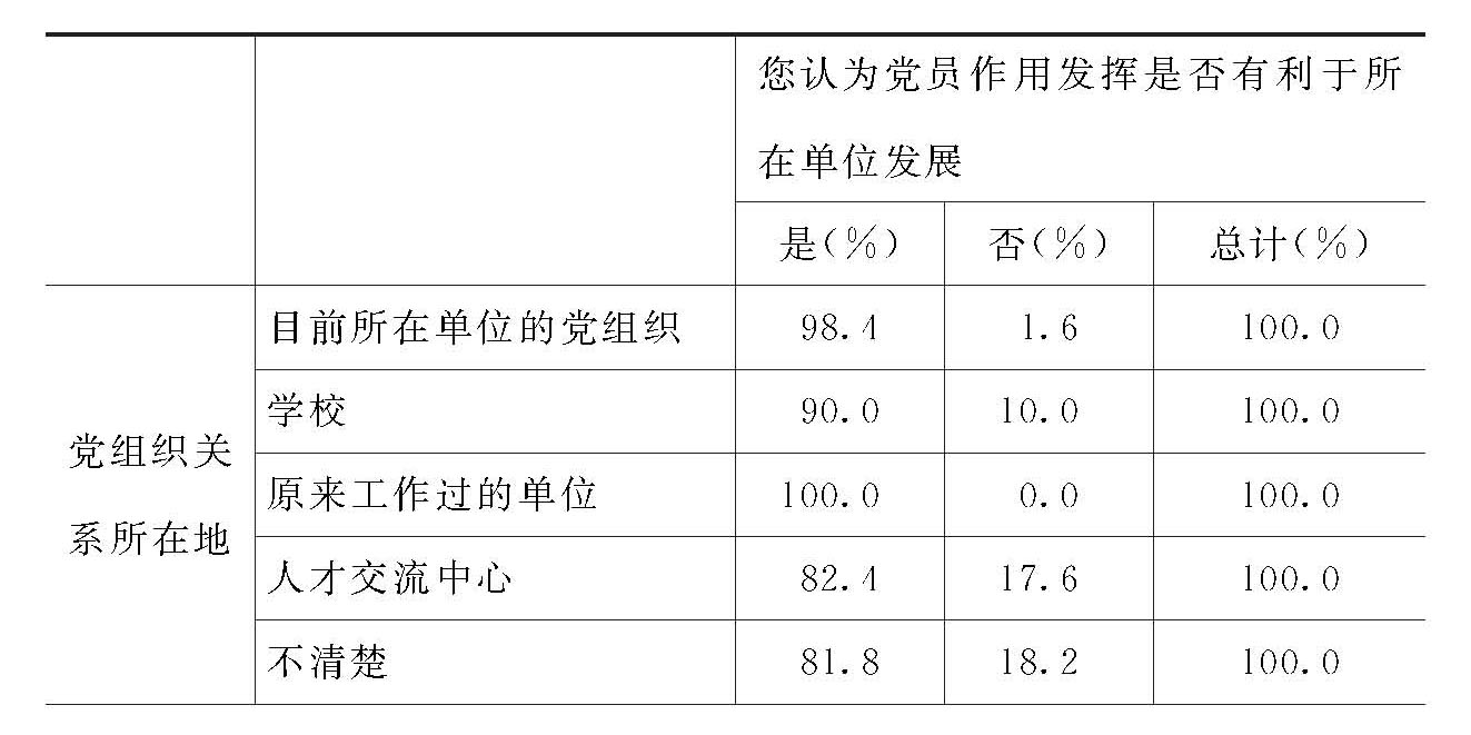 对此问题的回答无性别、年龄、文化程度差异(女性党员比例略高于男性党员比例)。但在组织关系是否在工作过的单位或现在的单位的党员中出现了差异。组织关系在人才交流中心和在学校的党员中,认为党员作用发挥“有利于所在单位发展”的党员的比例偏低。在此问题上,没有显著的有正相关的情况。