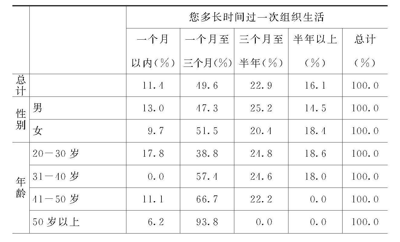 这说明,在“过组织生活”的频率方面,一个月至三个月过一次组织生活的党员居多。男性党员和女性党员比例大致相当,各自约占六成比例。从年龄因素看,状况高低排序依次为50岁以上,41-50岁,40岁以下,呈现出年龄越大,一个月至三个月过组织生活的频率越高的状况。在“教育水平”方面,又呈现出一种负相关的态势,即文化程度越低(如初中,高中),一个月至三个月过一次组织生活的频率越高;文化程度越高(如大学以上),一个月至三个月过一次组织生活的频率越高。其他变量方面,年收入3000-7999元的党员一个月至三个月过一次组织生活的频率比其他收入层次的党员一个月至三个月过一次组织生活的频率低一倍左右。其他收入层次的党员一个月至三个月过一次组织生活的频率大致为60%。党组织关系在目前单位、在原来工作过的单位、在所毕业的大学的党员一个月至三个月过一次组织生活的比例大致相当。在此问题上,没有显著的有正相关的情况。