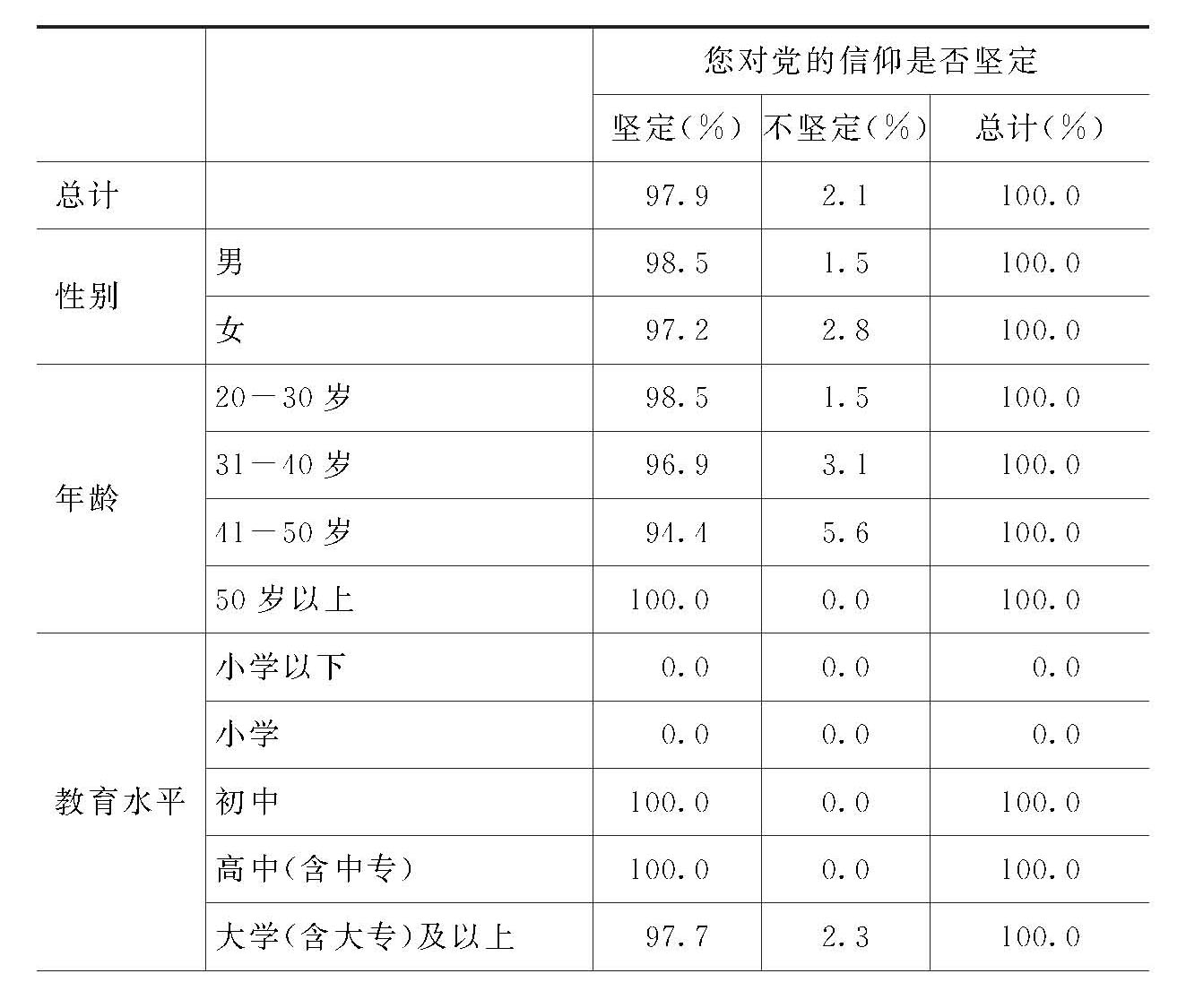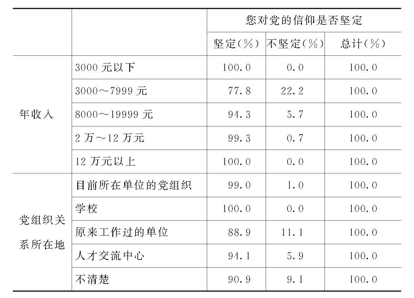 这说明,除年收入在3000-7999元、党组织关系在原来工作过的单位的党员对党的信仰坚定性的回答率略低以外,其他各类别的党员对党的信仰坚定性的回答比例均很高,达94%以上。在此问题上,没有显著的有正相关的情况。