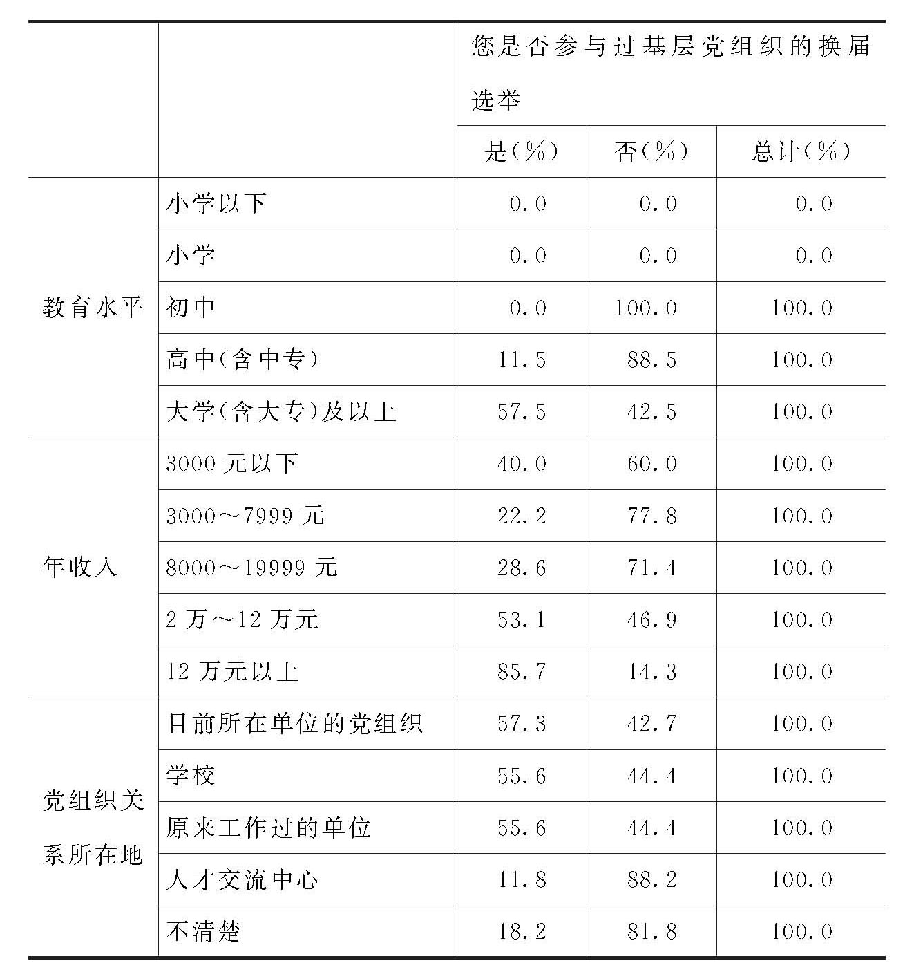 2.不同性别、年龄、教育、收入、党组织关系所在地的党员,是否参与过基层党组织换届选举的百分比