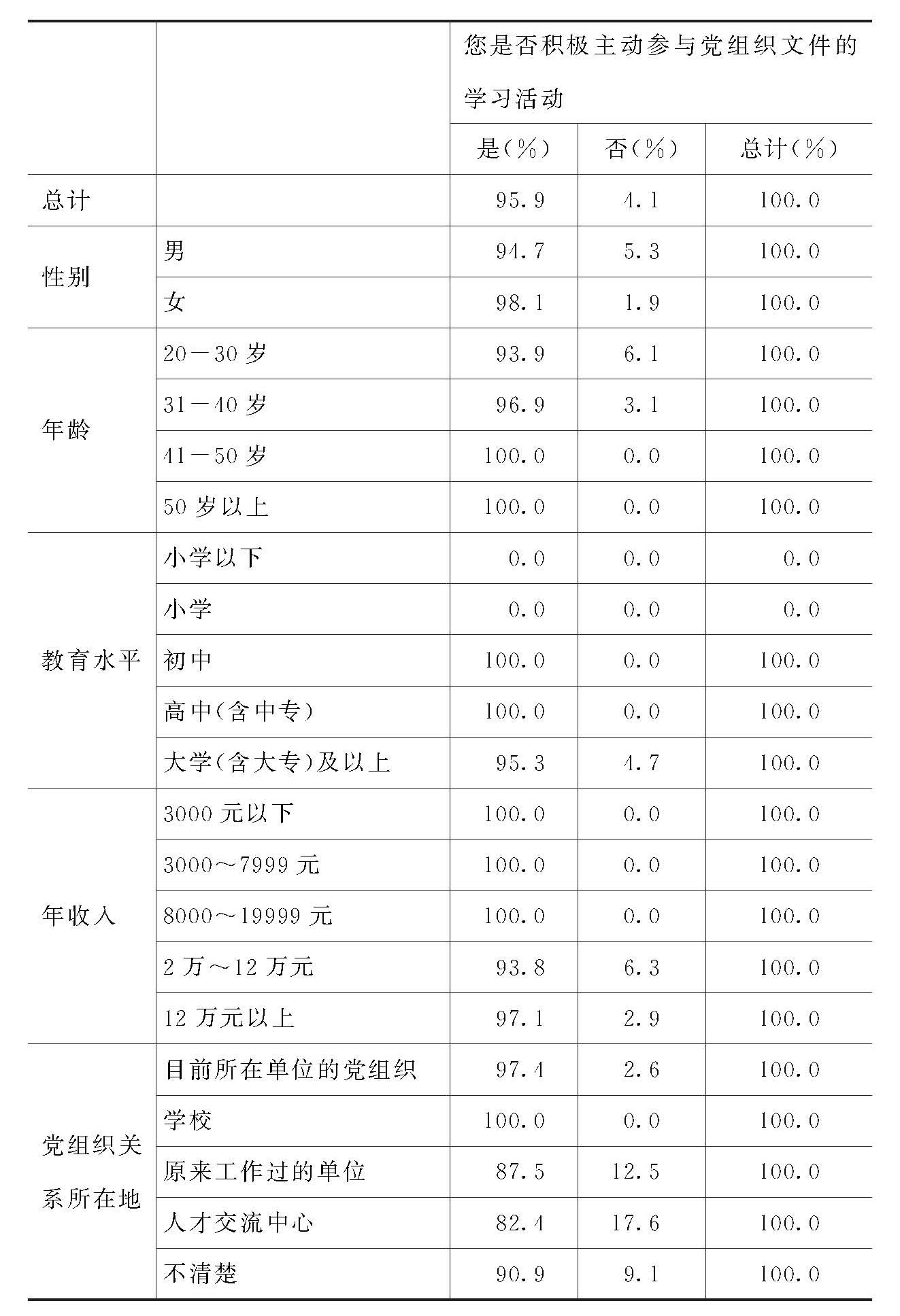7.不同性别、年龄、教育、收入、党组织关系所在地的党员,是否积极主动参与党组织文件学习活动的百分比