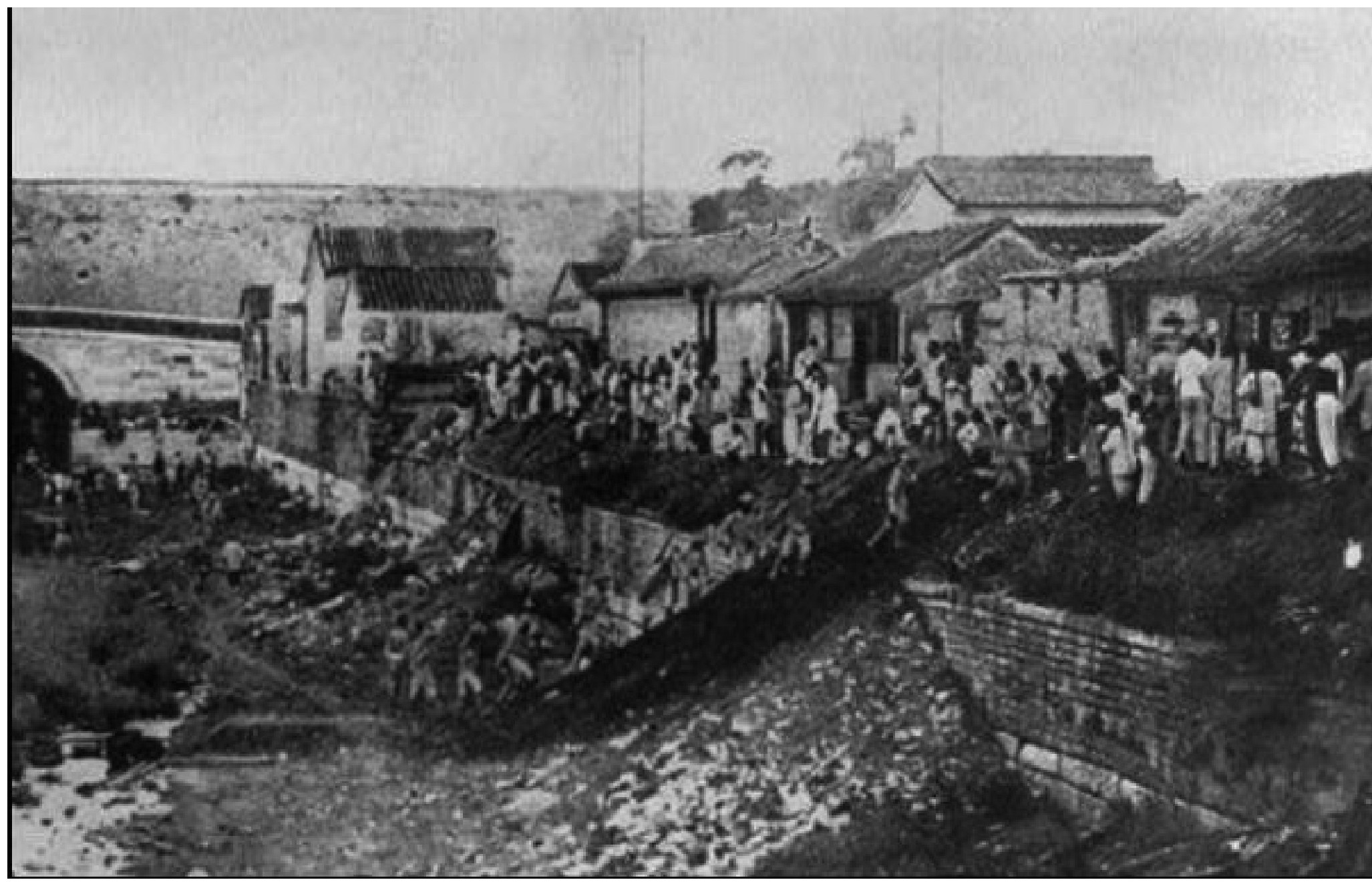 当八国联军部队从广渠门下水口鱼贯而入、一个一个顺土坡往上攀爬时,两侧有一群一群留辫子的中国民众,揣着手站在两旁,事不关己地麻木观看