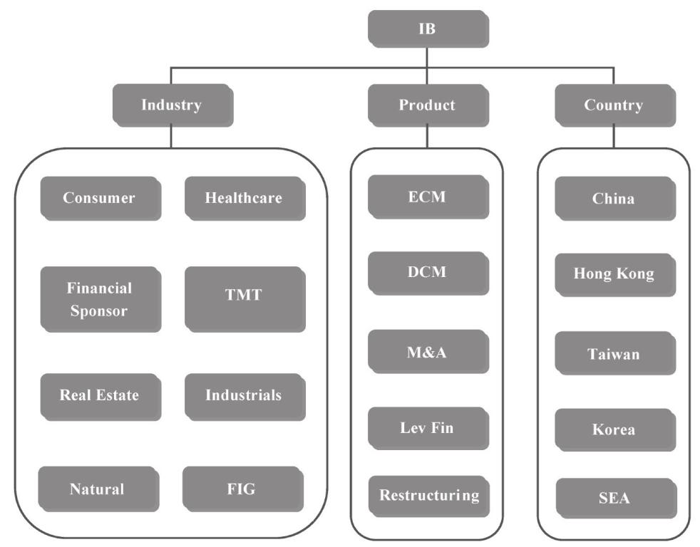 3.投资银行的团队结构: 从主营业务来看,投资银行内部会有如下划分。比如按照行业划分:消费品组、医疗保健组、金融组、房地产组、工业组、TMT(电信媒体科技)组和自然资源组等;同时也会按金融产品种类划分:股票资本市场组(ECM)、债务资本市场组(DCM)、兼并收购组(M&A)、杠杆融资组(Leverage Finance)、业务重组组(Restructuring)、承销组(Syndicate)、金融衍生品组(Derivatives)等。最直观的分类是按照地区划分,比如在亚洲,会有中国组、中国香港组、中国台湾组、韩国组及东南亚组(SEA)等。请见下图:
