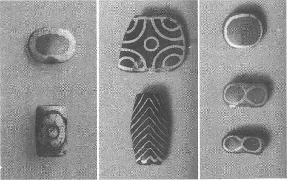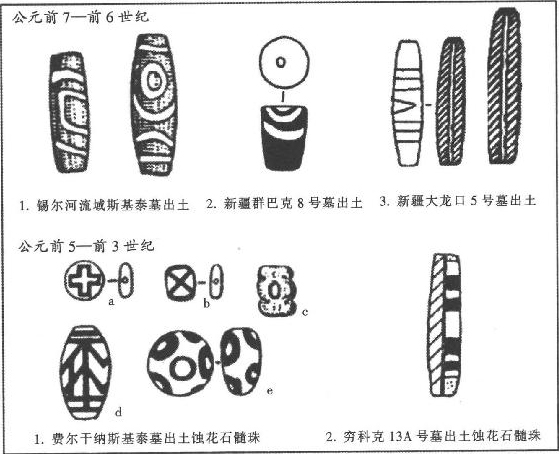 20世纪初,英国考古学家斯坦因在新疆和田发现了几颗古代石珠,上面有白色花纹。正如夏鼐指出的,制作这种石珠的原料是肉红石髓(Carnelian),上面花纹经过一种特殊的化学腐蚀、加热处理后形成,可称“蚀花肉红石髓珠”。这种人造宝石的早期花纹以圆圈纹为主要特征,云南李家山春秋晚期墓发现的就属于此类;中期以十字纹或平行直线纹为特征,斯坦因在和田发现的肉红蚀花石髓珠采用后一种纹样。