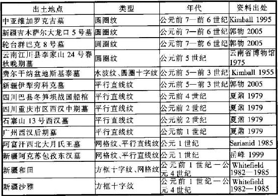 据伦敦大学艺术史系韦陀(R.Whitefield)教授研究,斯坦因收集品的年代大约在公元前1世纪至公元4世纪。不同时代的肉红蚀花石髓珠采用不同花纹,可以进行断代研究。中亚锡尔河斯基泰古墓、新疆群巴克8号墓、新疆大龙口5号墓出土蚀花石髓珠采用圆圈纹,年代在公元前7—前6世纪。费尔干纳盆地斯基泰墓、新疆伊犁穷科克古墓的肉红蚀花石髓采用网格和横线纹样,与古波斯蜻蜓眼玻璃珠共出,时代约在公元前5—前3世纪。阿富汗大月氏王陵、新疆和田和阿克苏包孜东西汉晚期墓随葬肉红蚀花石髓珠,年代在公元1世纪;如下表所示。