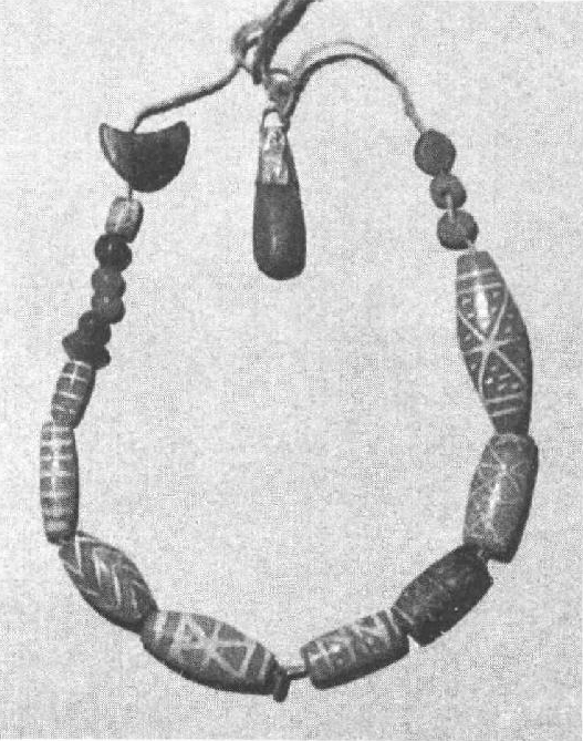 这种工艺起源于古老的印度河文明,它的矿物成分与玛瑙相近,属于玉髓类。它与玛瑙的主要区别在于花纹经过化学处理着色,而玛瑙花纹完全是天然形成的。据英国学者麦凯研究,蚀花肉红石髓珠源于印度哈拉帕文化(前2600—前1500),后来传入美索不达米亚。它们有着同一来源,因为两地的蚀花方法和珠形基本相同,有的甚至连花纹也一样。这种经人工处理的小石髓珠,向西最远分布到罗马时代的埃及,向北最远分布到伊朗西部的泰培希萨。英国考古学家马歇尔在印度河附近发掘昌胡达罗遗址时,发现过制作蚀花石髓珠的古作坊,尤其以巴基斯坦塔克西拉发现的蚀花石髓最多,近代巴基斯坦仍有工匠能够制造这种人造宝石珠。