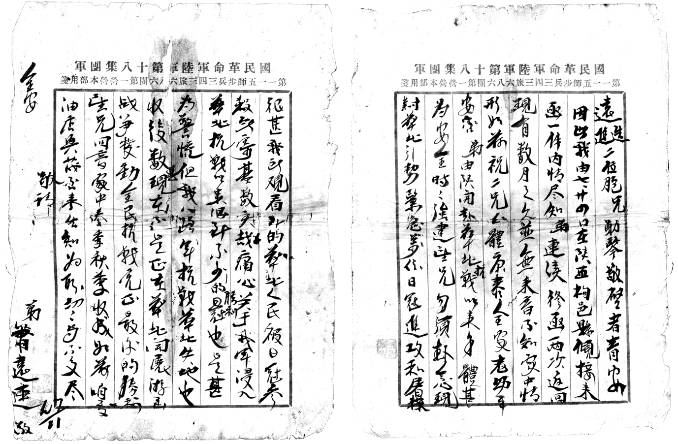 因此我由七、廿四日在陕西栒邑县,倾接来函一件,内情尽知。弟连续修函两次返回,现有数月之久,并无来音,不知家中情形如荷〔何〕?祝二兄玉体康泰!全家老幼平安否?弟由陕开赴华北抗战以来,身体甚为安全,时时强建〔健〕,望兄勿须卦〔挂〕念。现对华北形势紧急万份,日寇进攻和屠杀很甚,我所观看到的华北人民被日寇参〔惨〕杀无寄〔计〕基〔其〕数,实哉痛心。关于我军浸〔深〕入华北抗战以来,得到不少的胜利,日寇也是甚为警〔惊〕慌。但我八路军抗战华北,失地也收复数县,现在还是正在华北开展游击战争,发动全民抗战,完正〔成〕最后的胜利。望兄回音,家中春季秋季收成如荷〔何〕?咱处油店兴茂否?来告知为要,切切。□不多尽。
