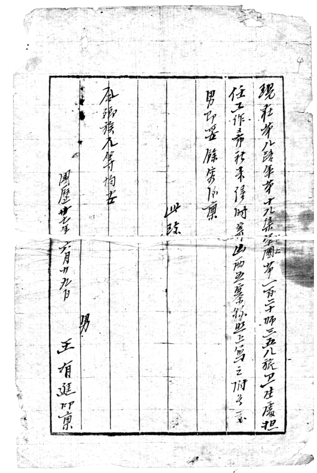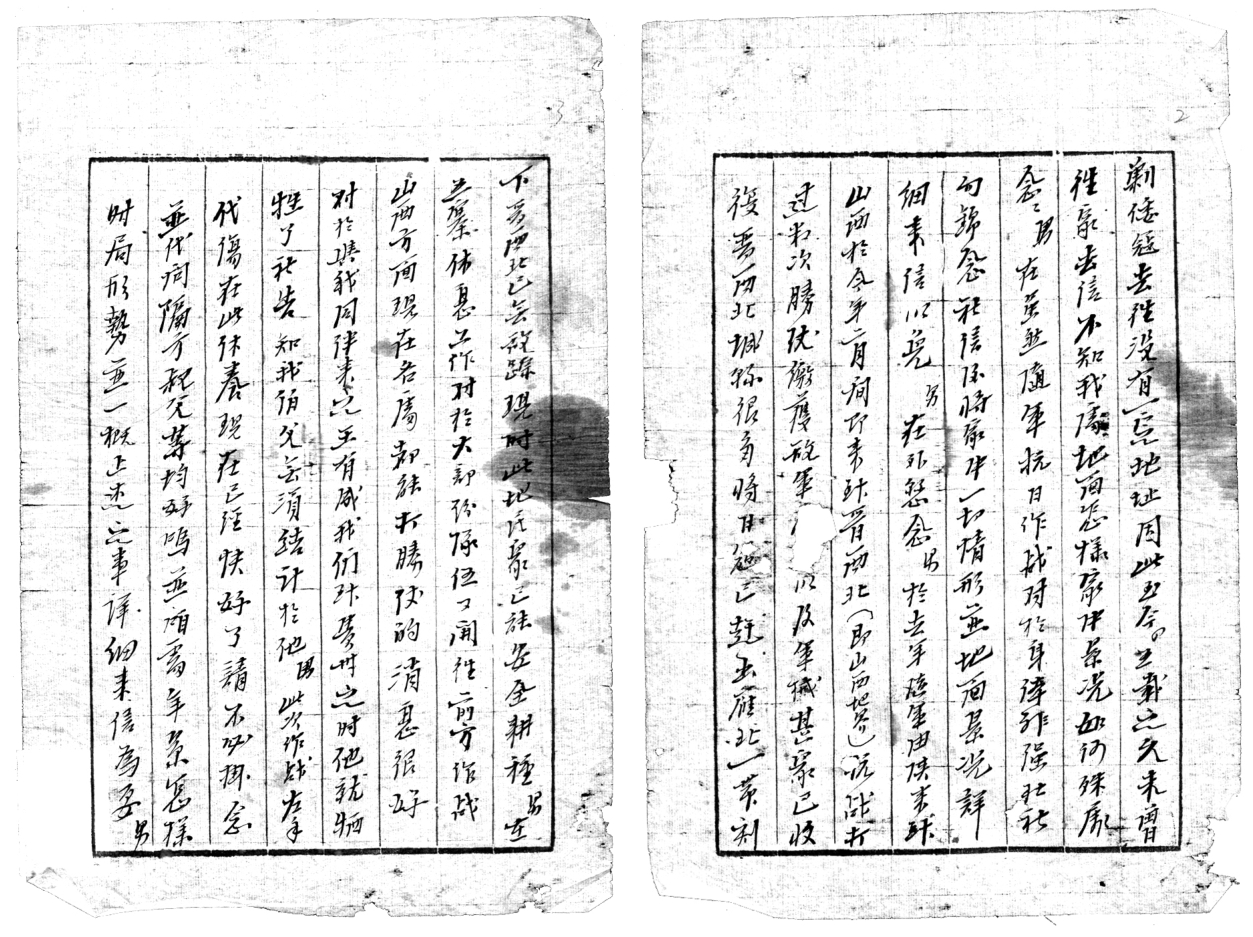 剿倭寇去往没有一定的地址,因此,至今四五载之久未曾往家去信,不知我处地面怎样?家中景况如何?殊属念念。男在虽然随军抗日作战,对于身体非〈常〉强壮,祈勿锦念。祈信后将家中一切情形并地面景况详细来信,以免男在外悬念。男于去年随军由陕来到山西,于今年二月间即来到晋西北(即山西地界)抗战,打过数次胜仗,缴获敌军□□以及军械甚众,已收复晋西北城县很多,将日寇已赶出雁北一带,刻下晋西北已无敌踪,现时此地民众已能安全耕种。男在五寨休息工作,对于大部份队伍又开往前方作战,山西方面现在各处都能打胜仗的消息很好。对于与我同伴来之王有成,我们到贵州之时他就牺牲了,祈告知我伯父无须结计于他。男此次作战左手代〔带〕伤在此休养,现在已经快好了,请不必挂念,并代问隔方叔父等均好吗,并咱处年景怎样?时局形势,并一概上述之事详细来信为要。男现在第八路军第十八集团军第一百二十师三五八旅卫生处担任工作,希祈来信时寄山西五寨县照上写之附号交男即妥。余容后禀。
