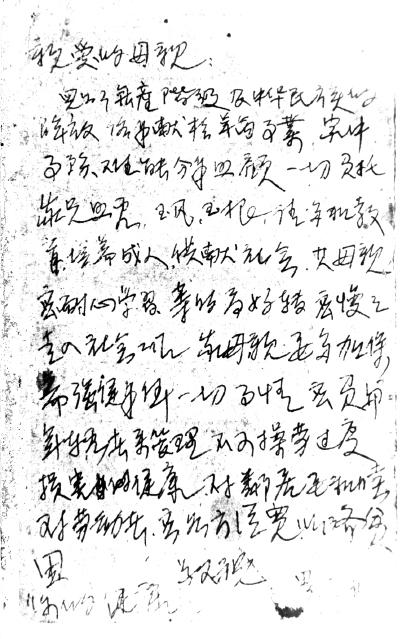 ,请多加教育,培养成人,供〔贡〕献社会。其母亲应耐心学习,等时局好转应慢慢走入社会工作。家母亲要多加保养,强健身体,一切事情应负〔付〕与年轻者来管理,不可操劳过度,损害健康。对邻居要和睦,对劳动者应各方从宽,以济贫困。