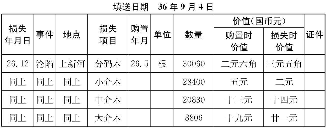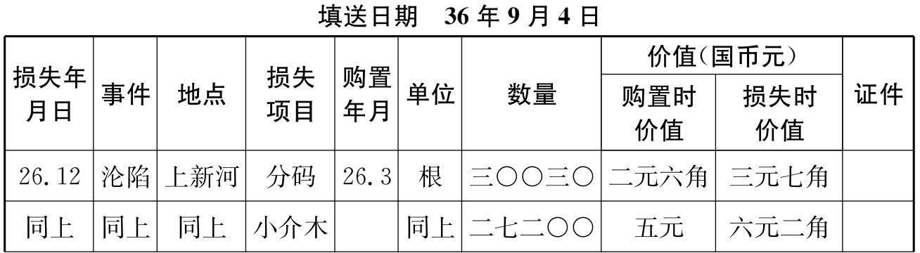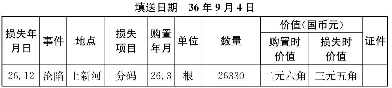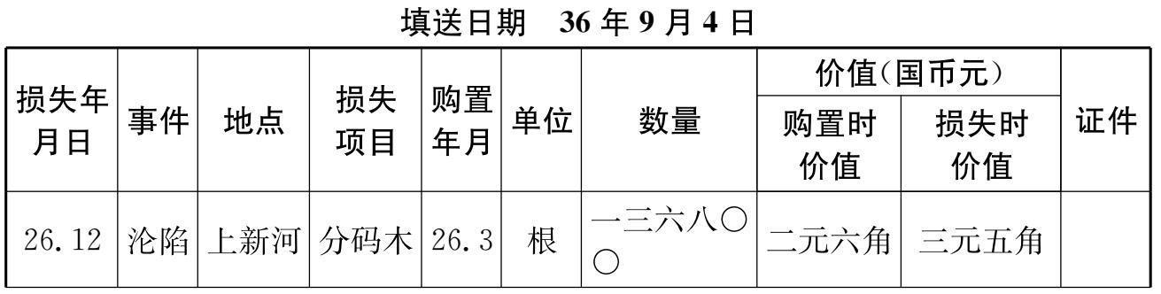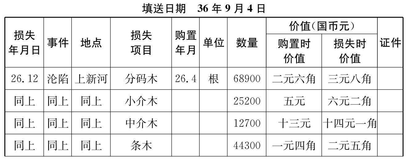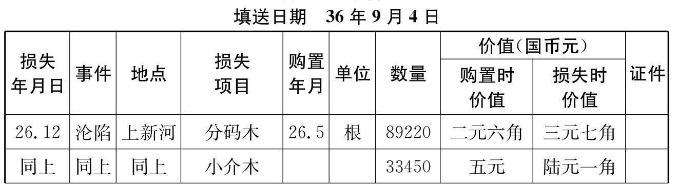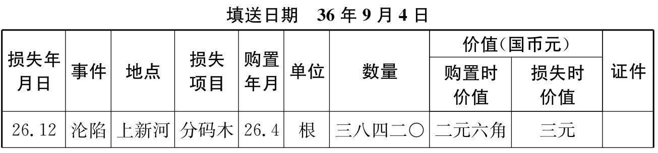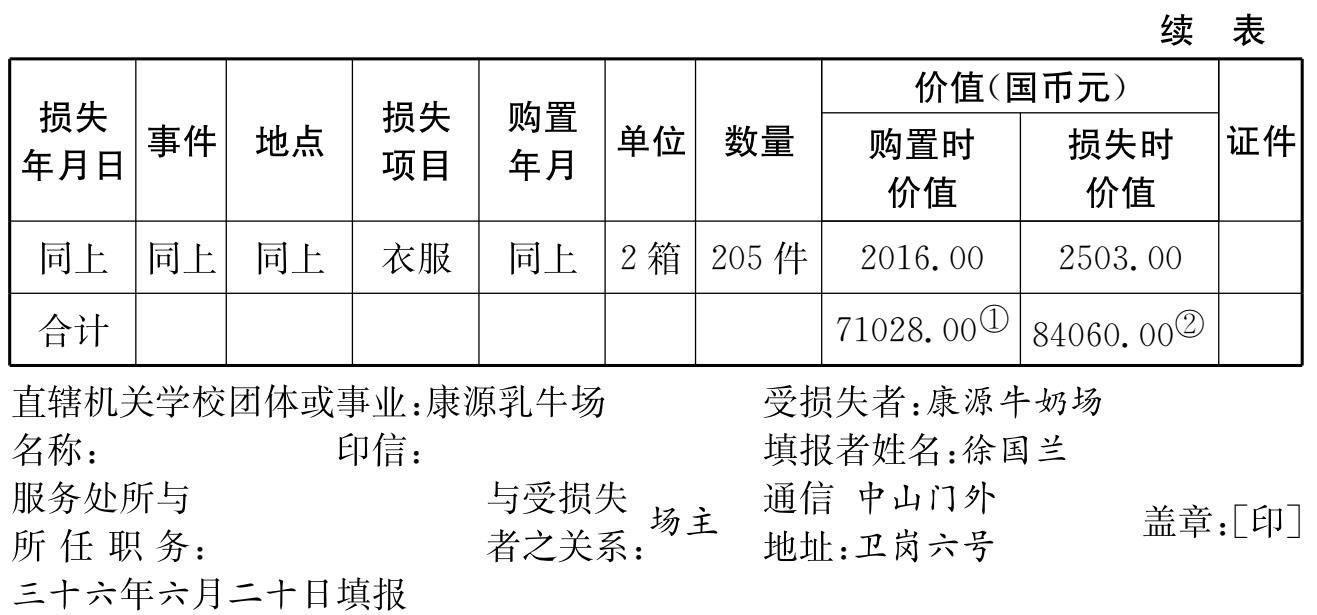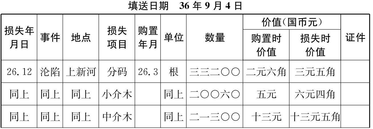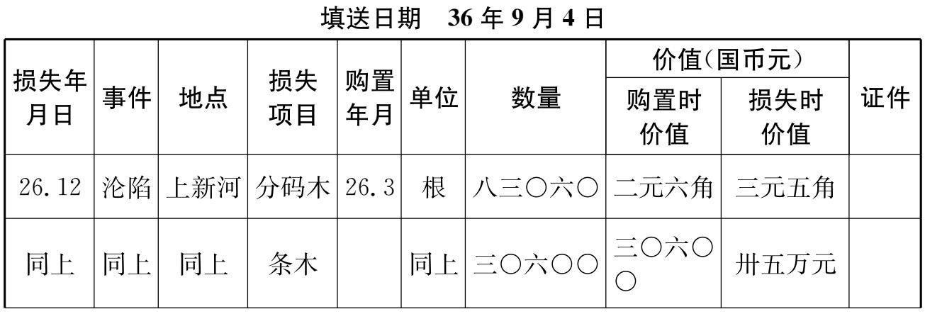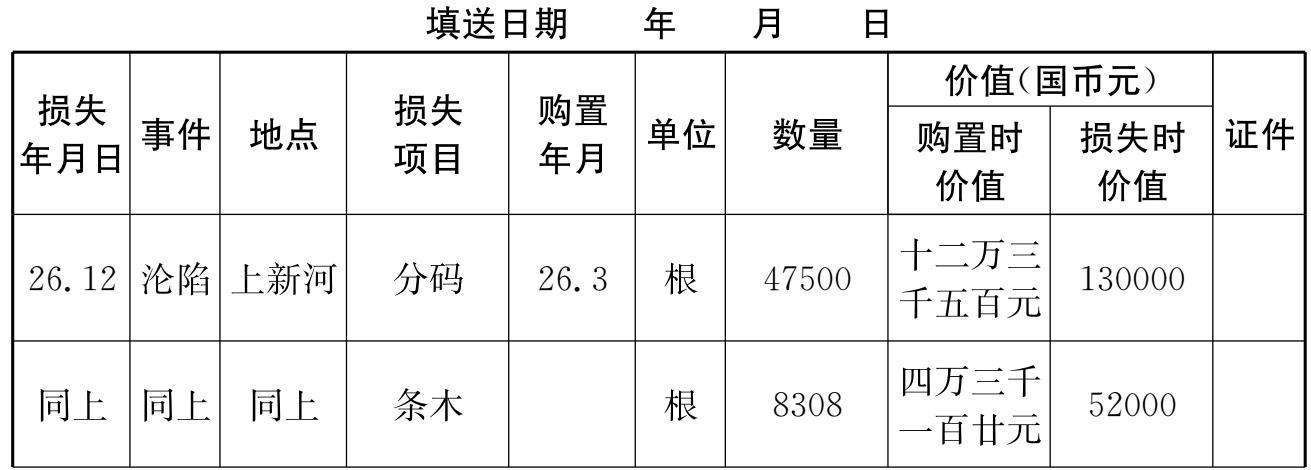 ② 本格及其上面几格填写位置可能有误,疑为“损失时价值”。原档如此。