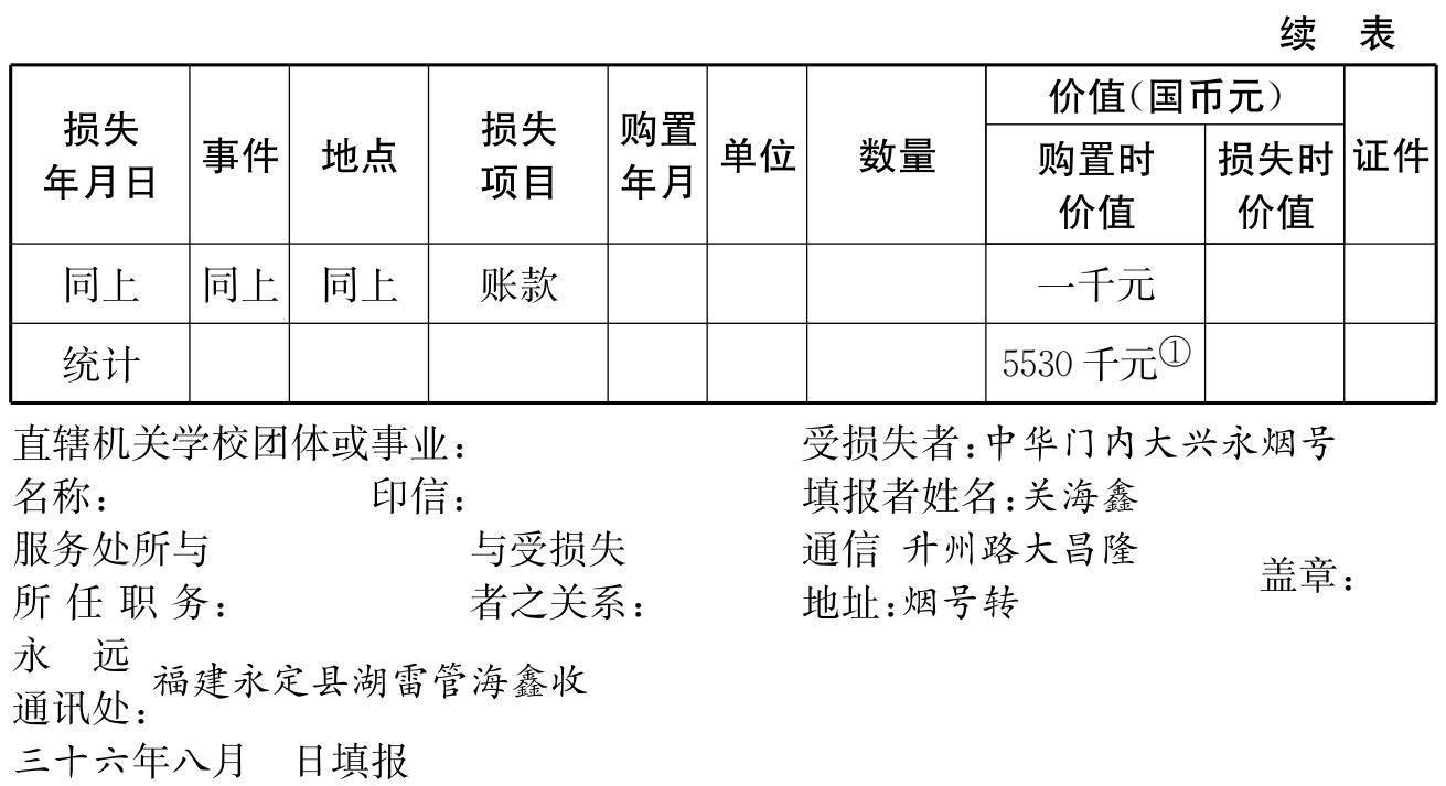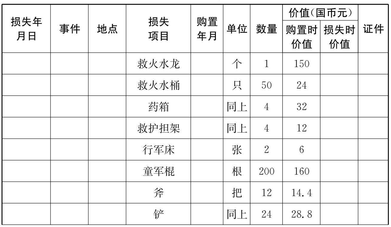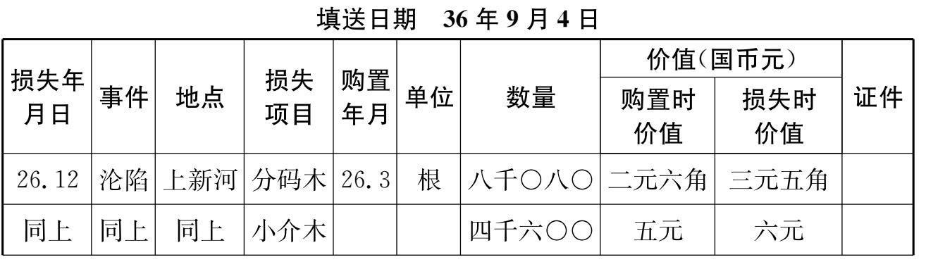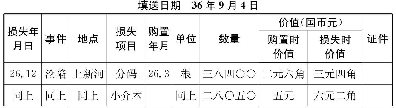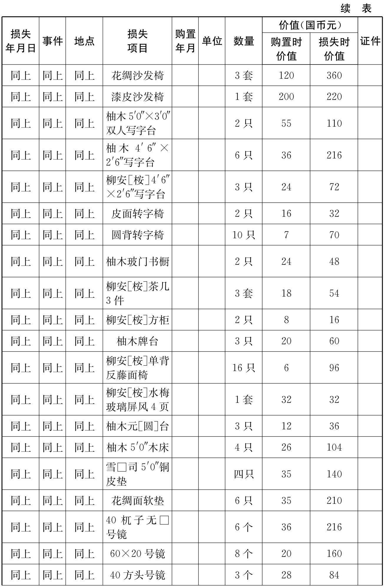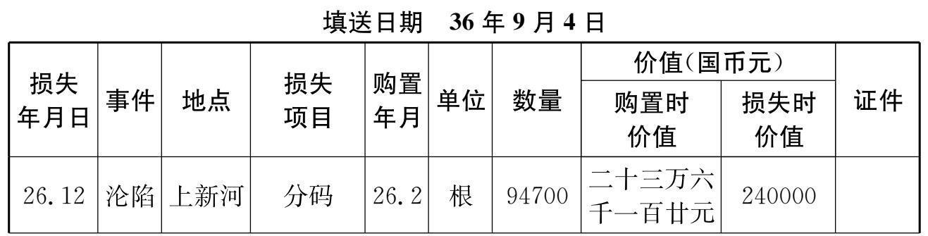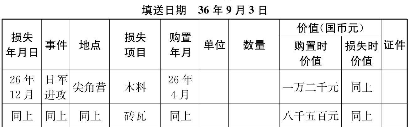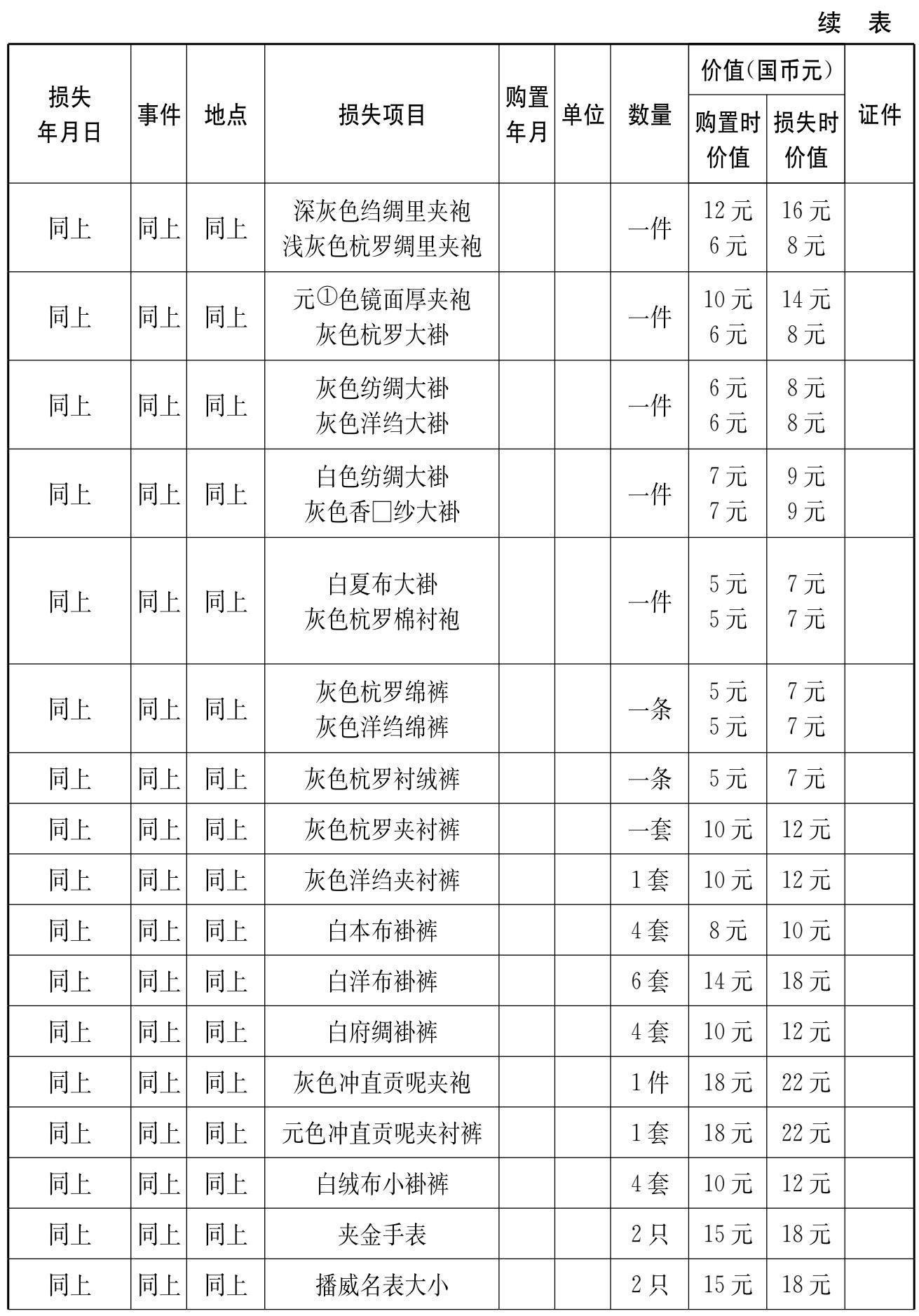 ② 本格及其上面几格填写位置可能有误,疑为“损失时价值”。原档如此。