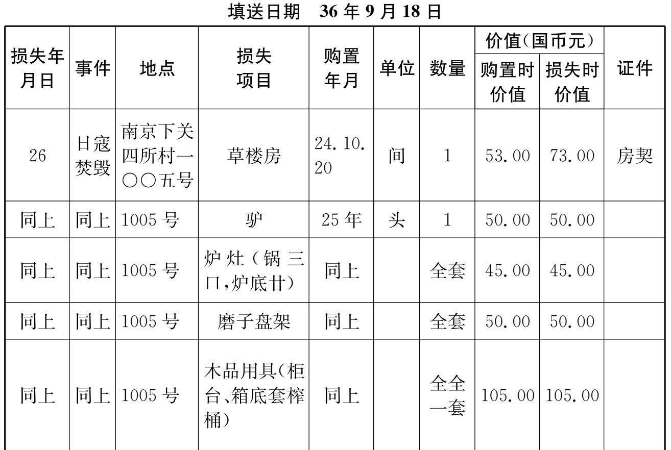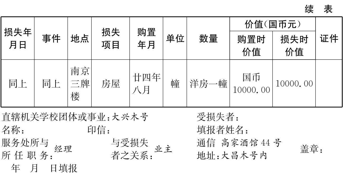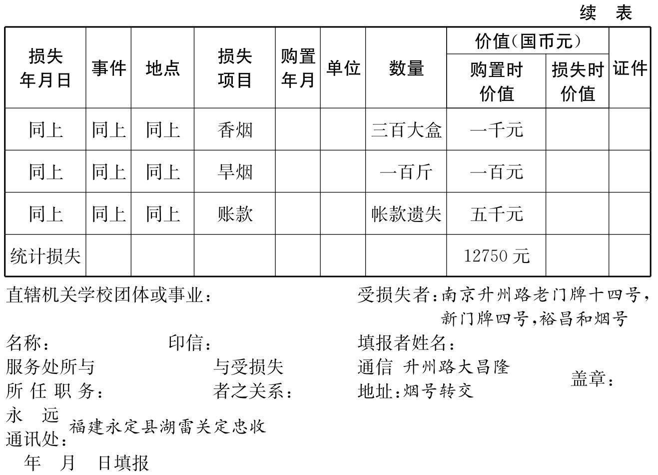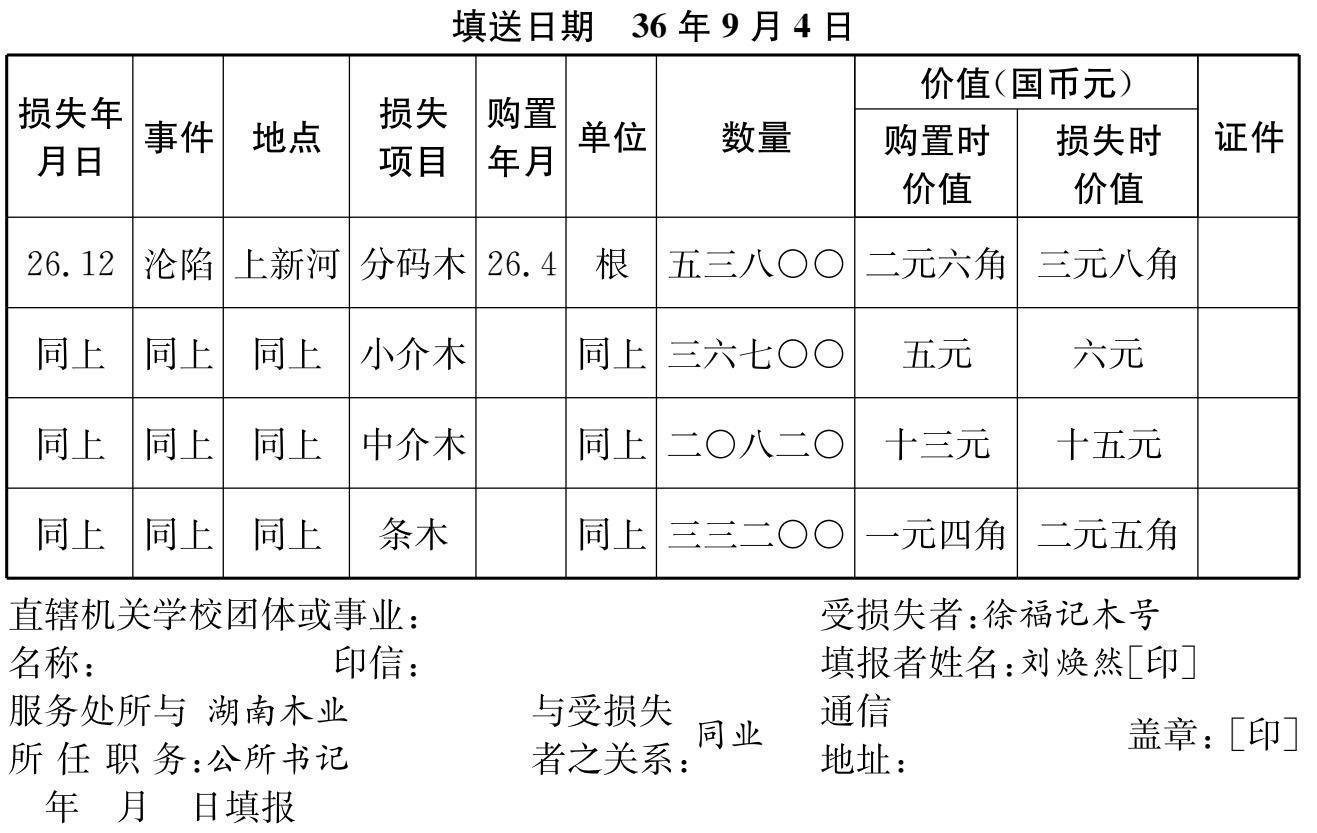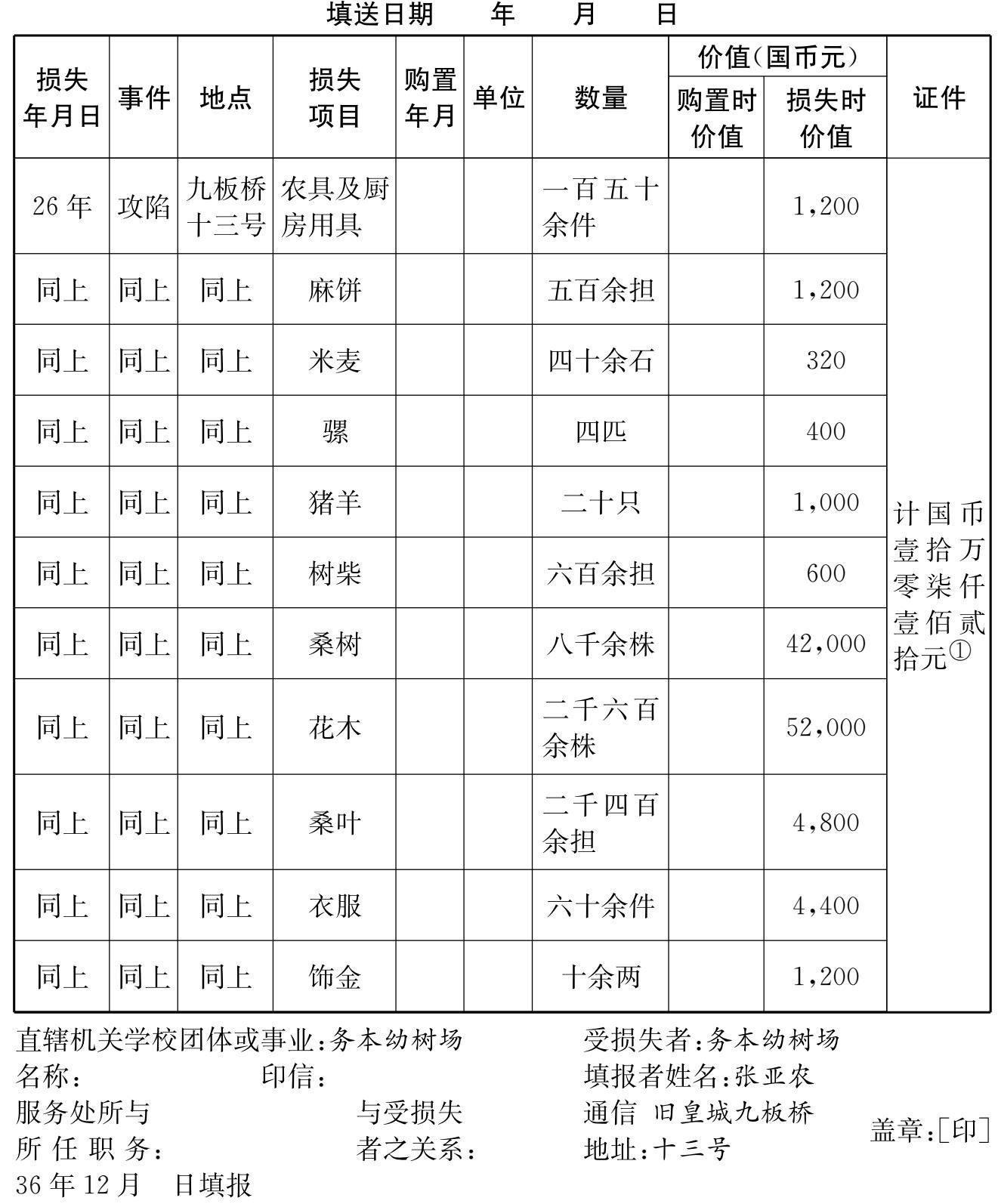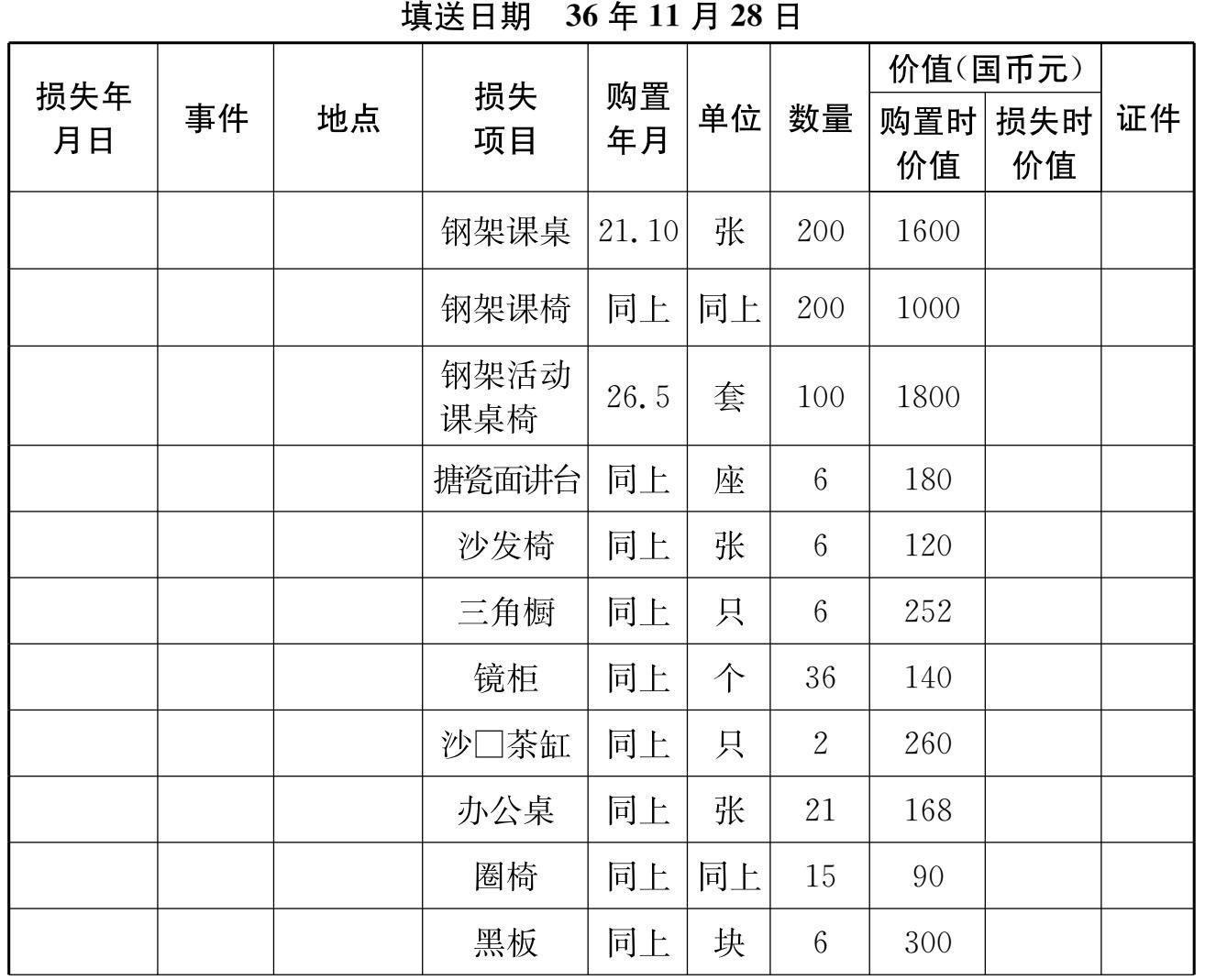 ② 本格及其上面几格填写位置可能有误,疑为“损失时价值”。原档如此。