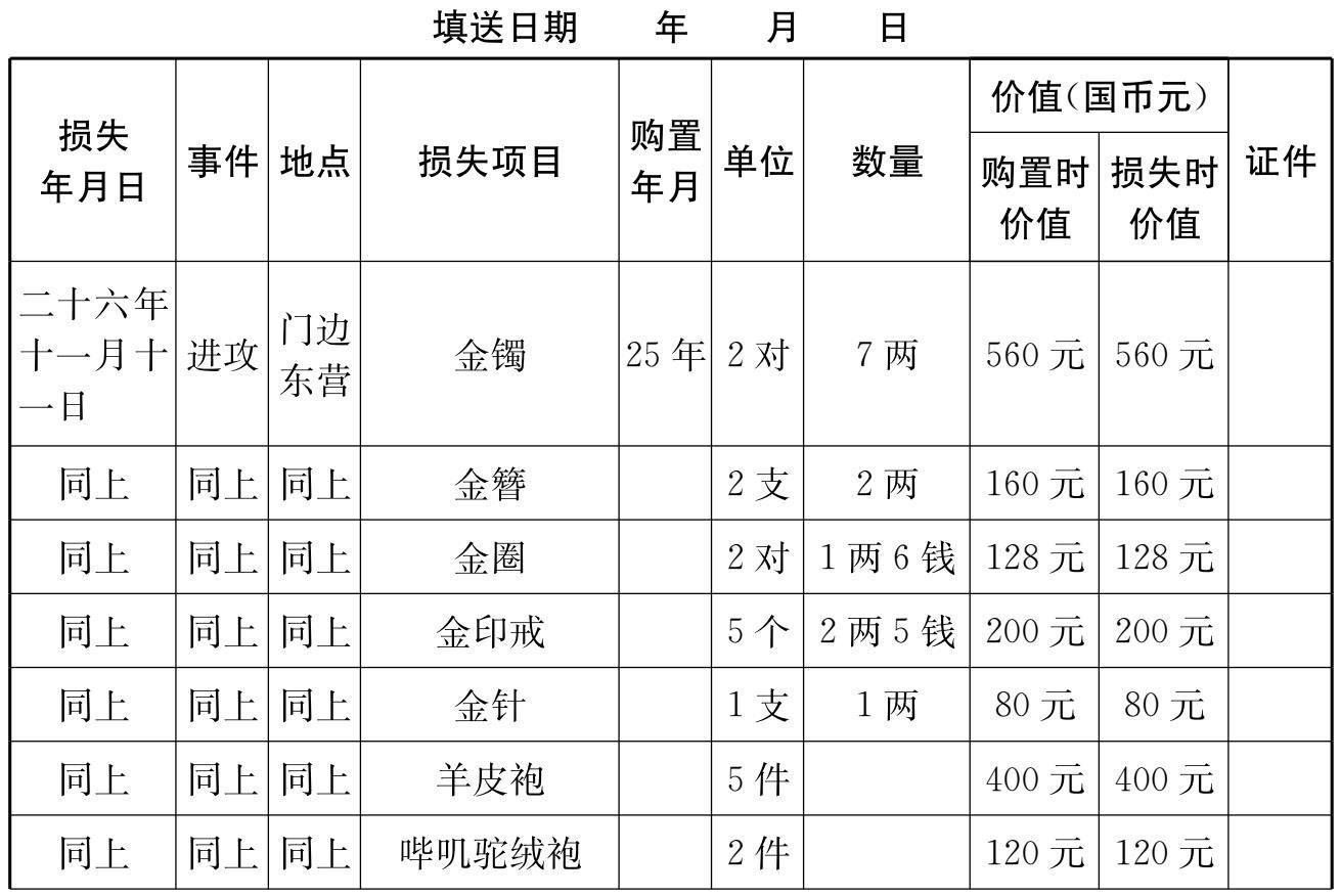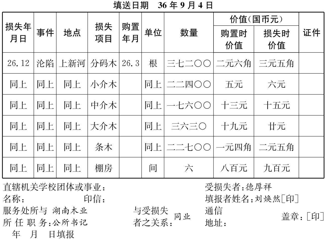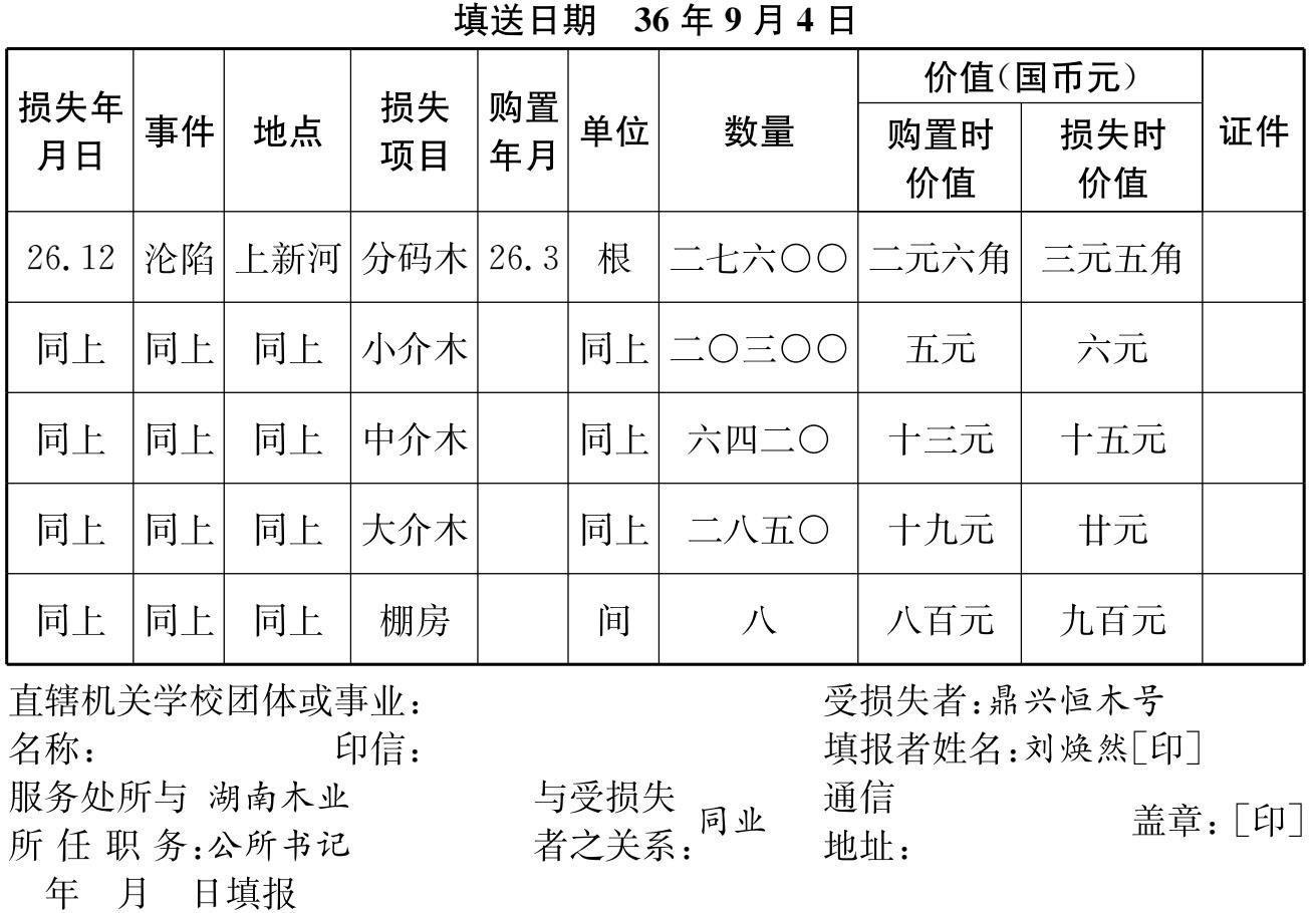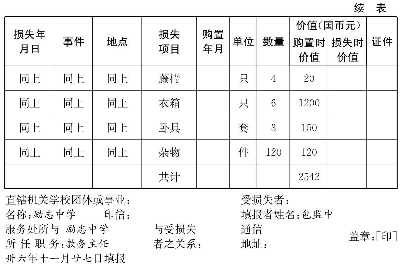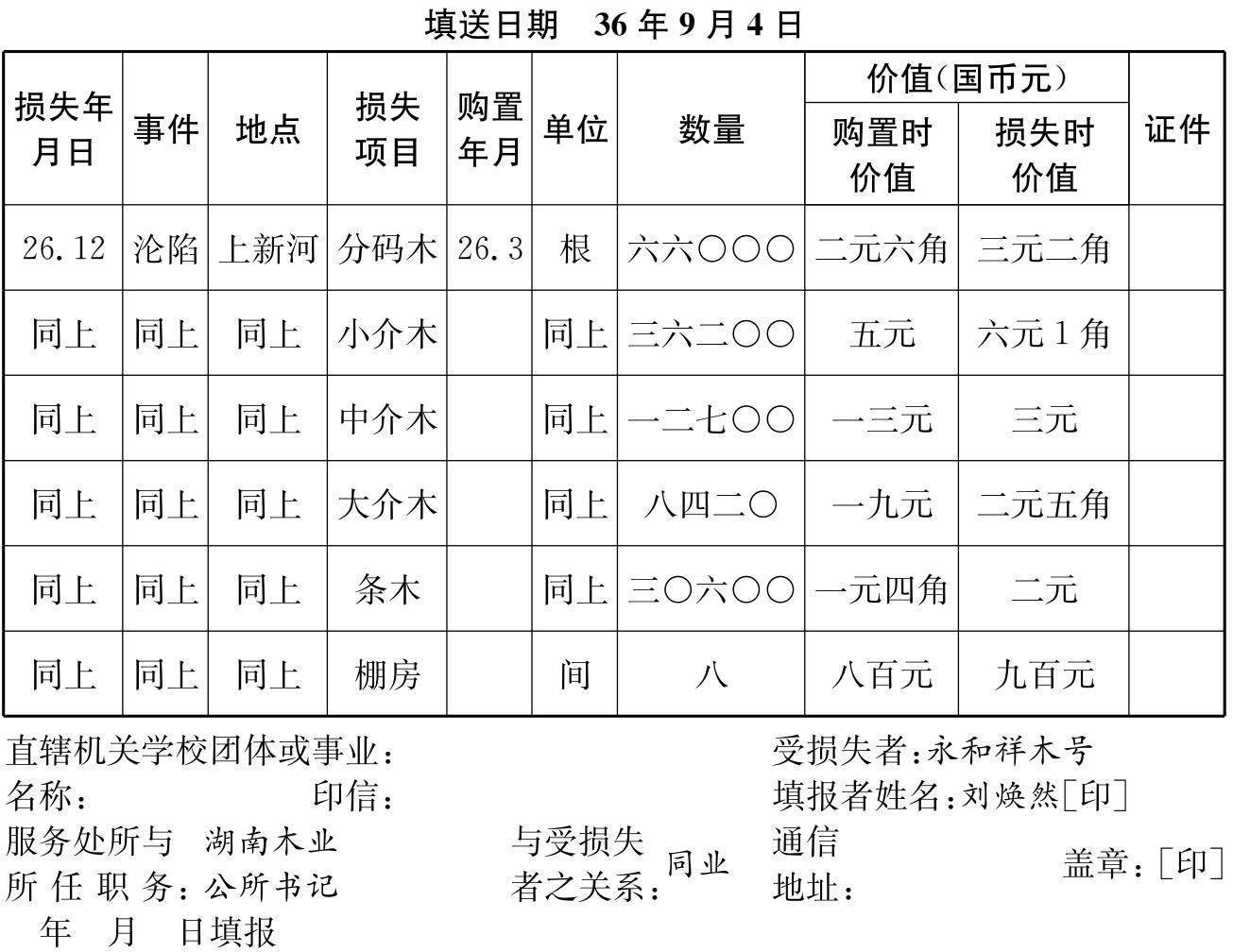 ② 本格及其上面几格填写位置可能有误,疑为“损失时价值”。原档如此。