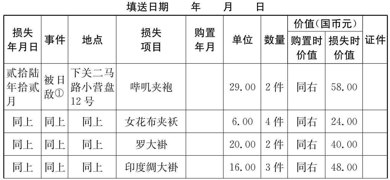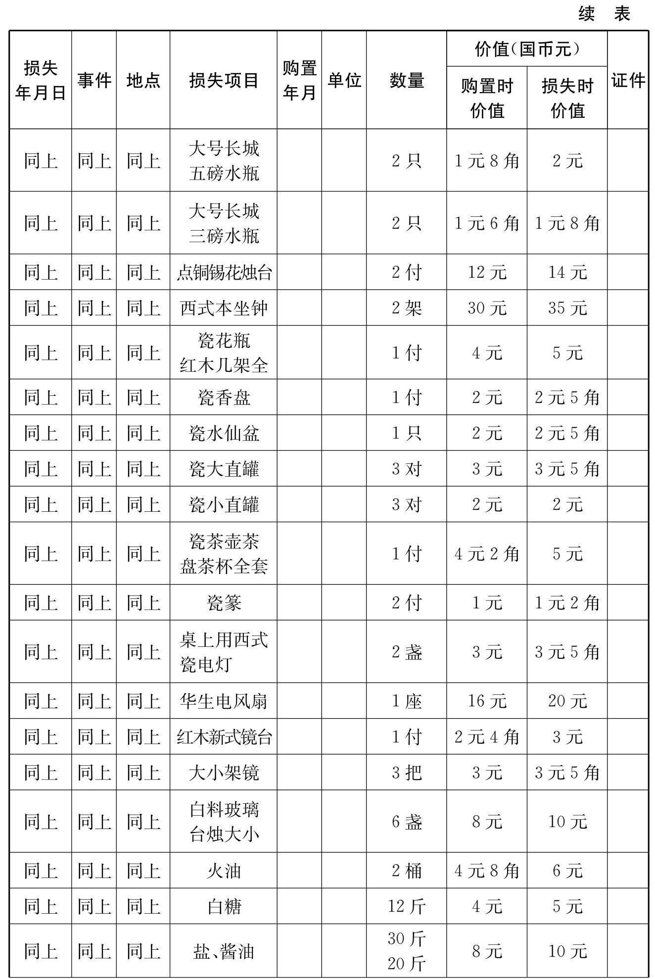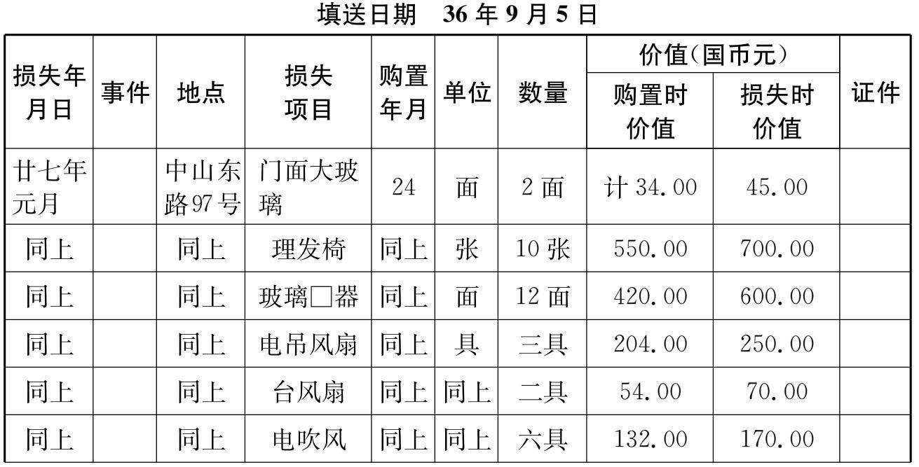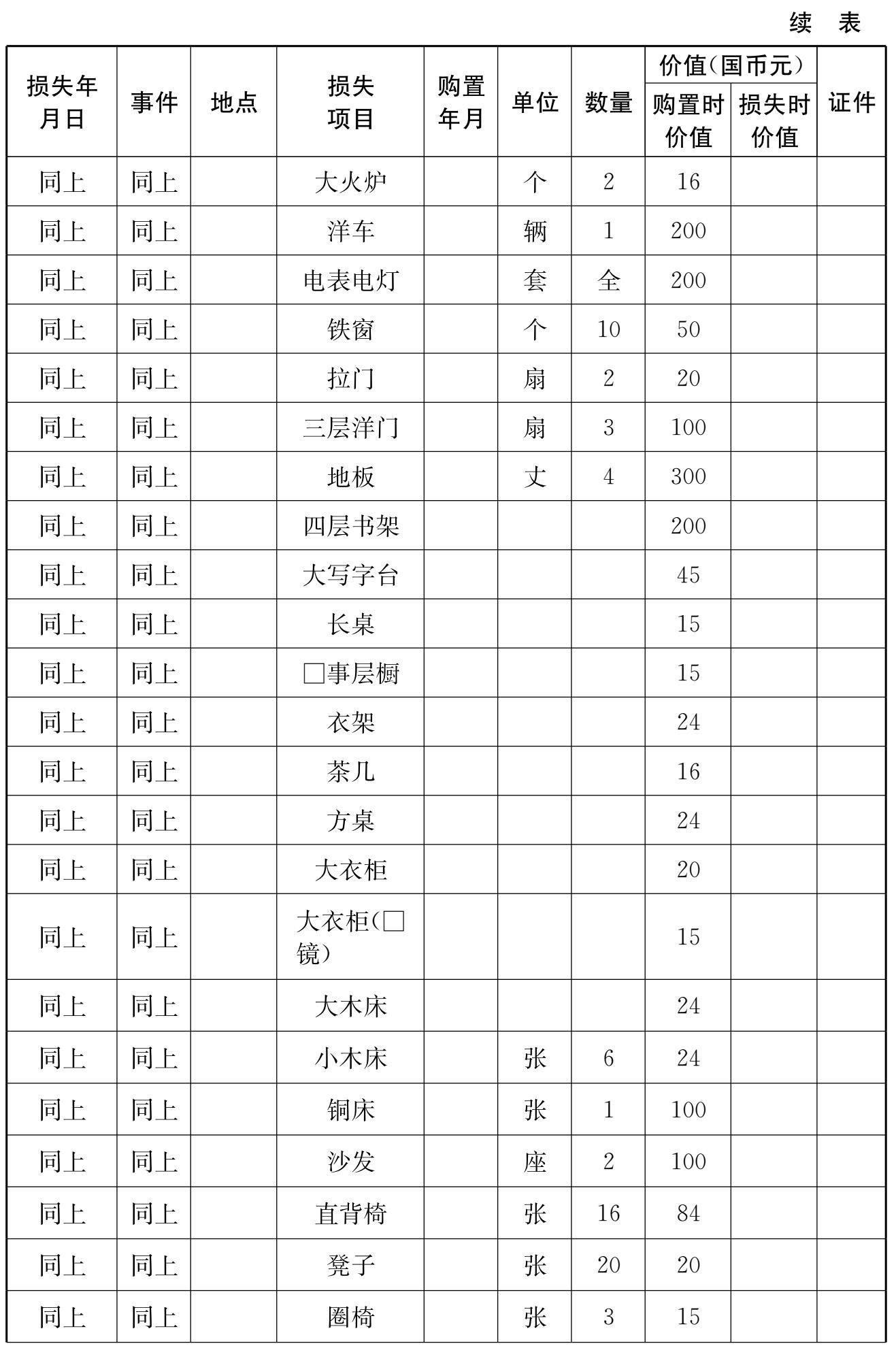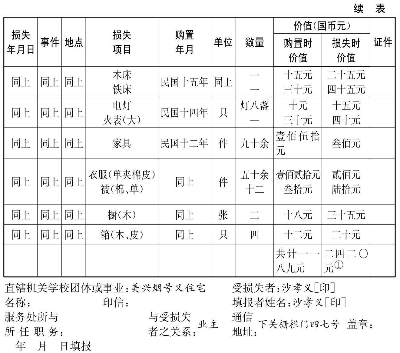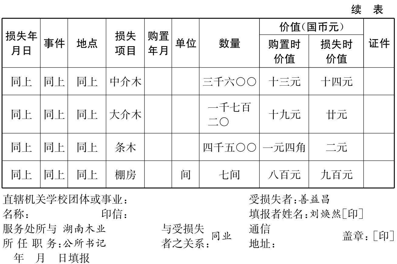 ② 本格及其上面几格填写位置可能有误,疑为“损失时价值”。原档如此。