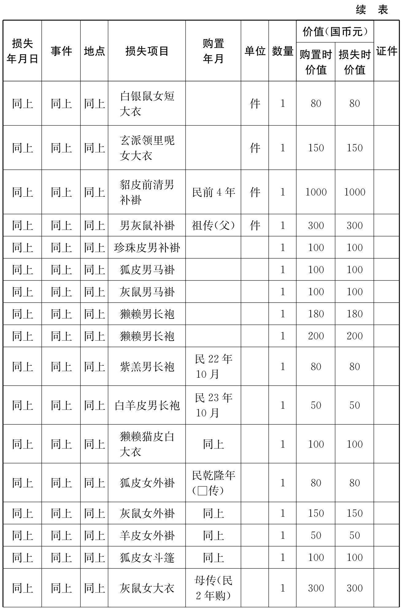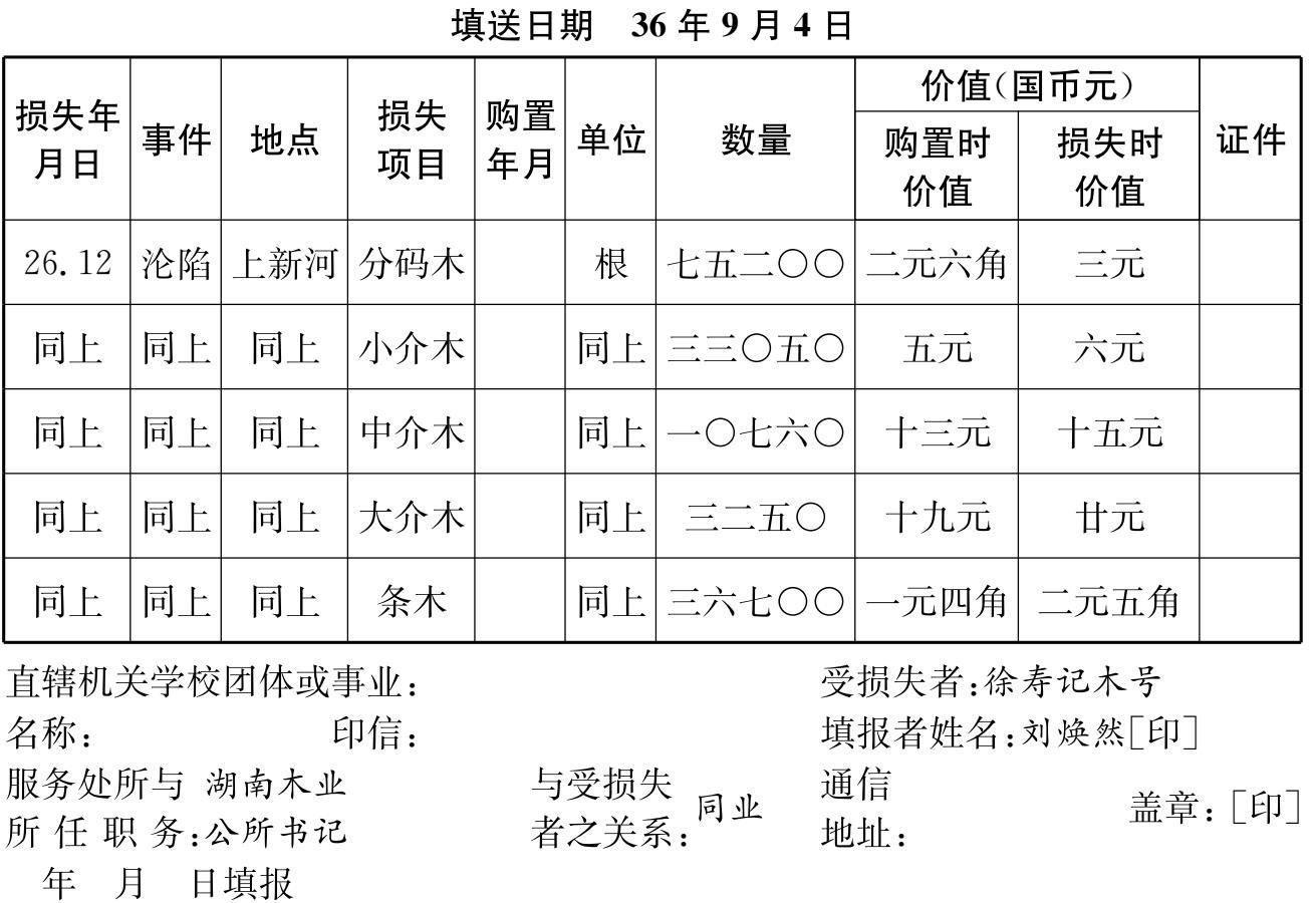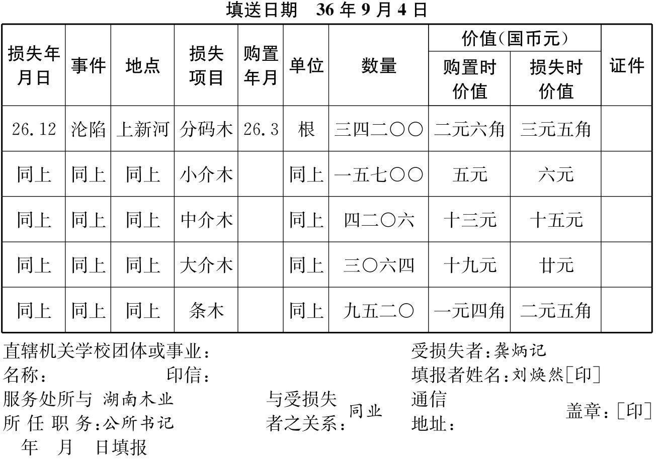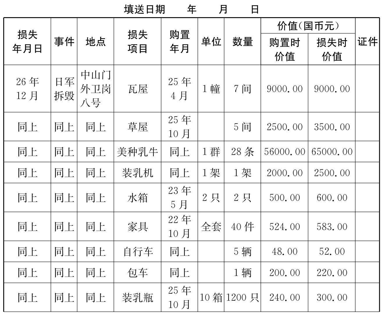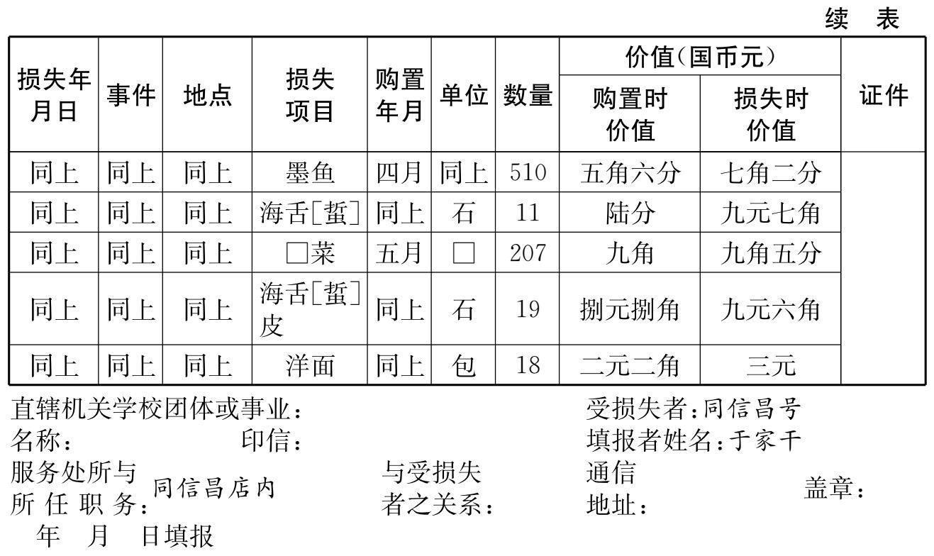 ② 本格及其上面几格填写位置可能有误,疑为“损失时价值”。原档如此。