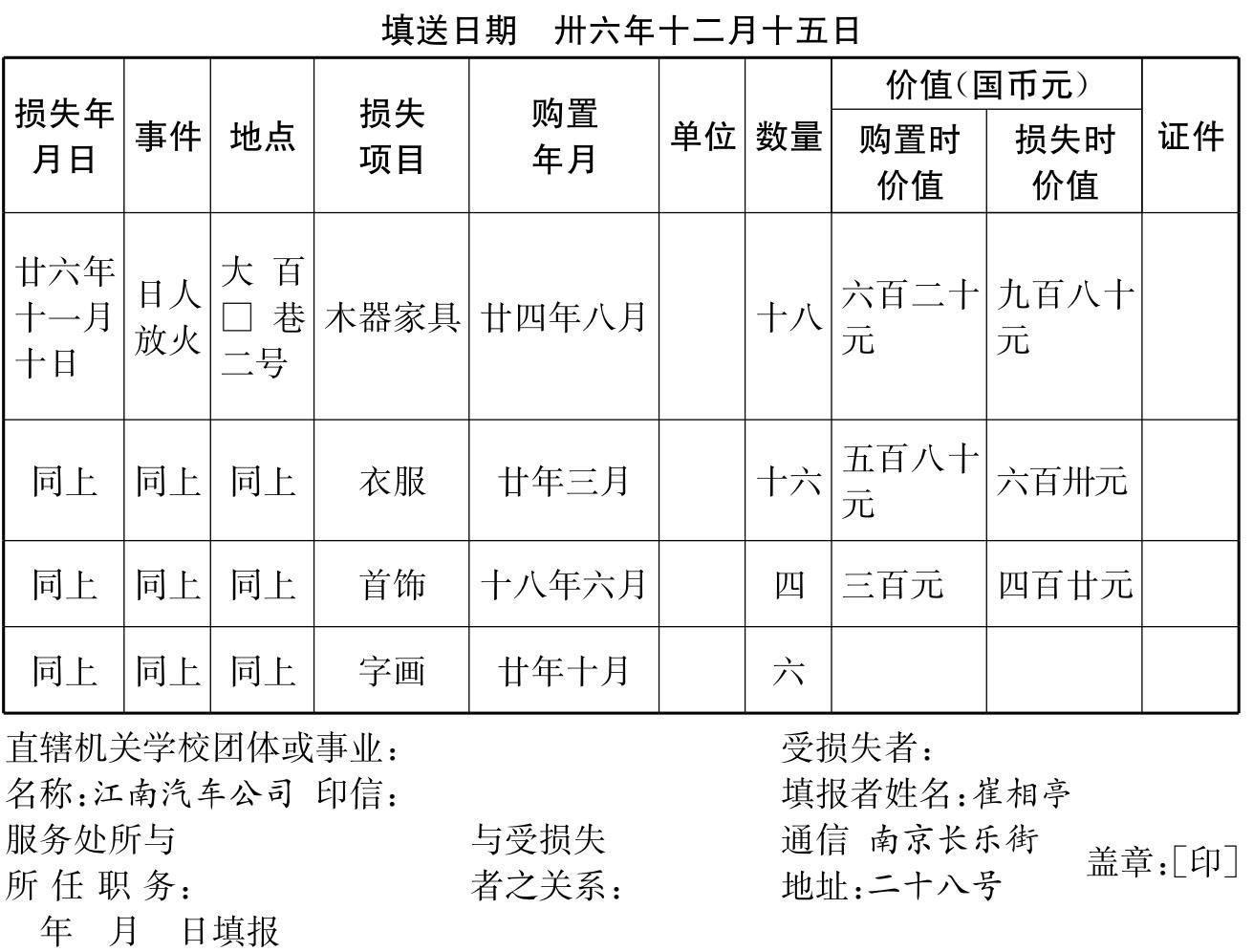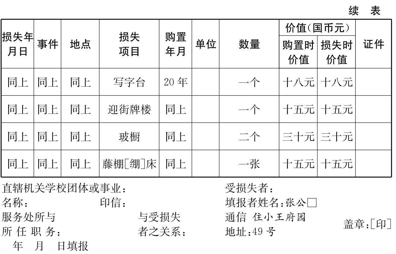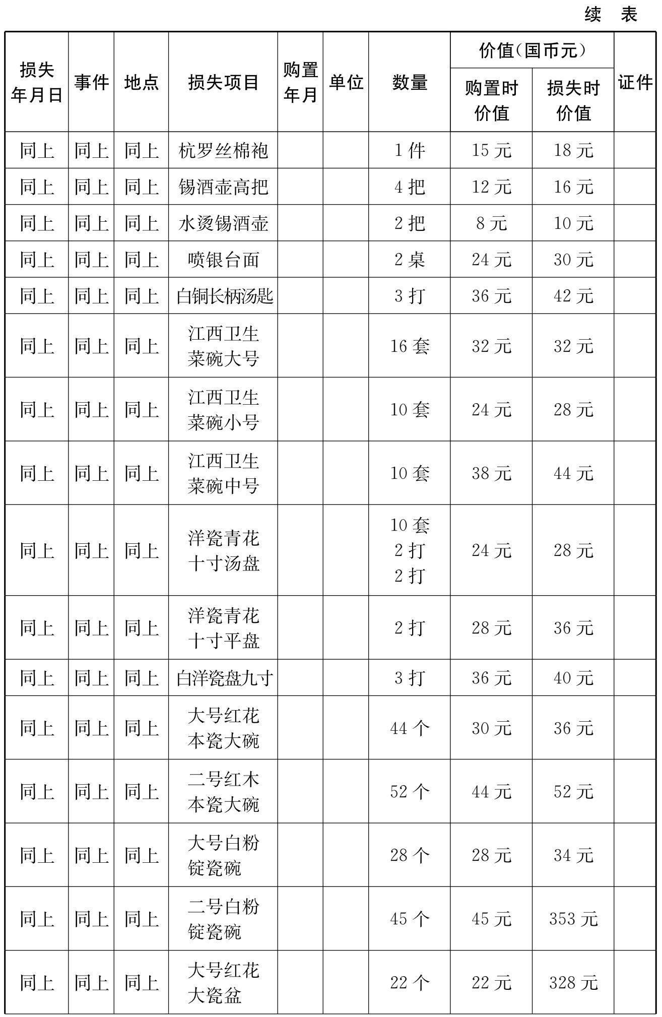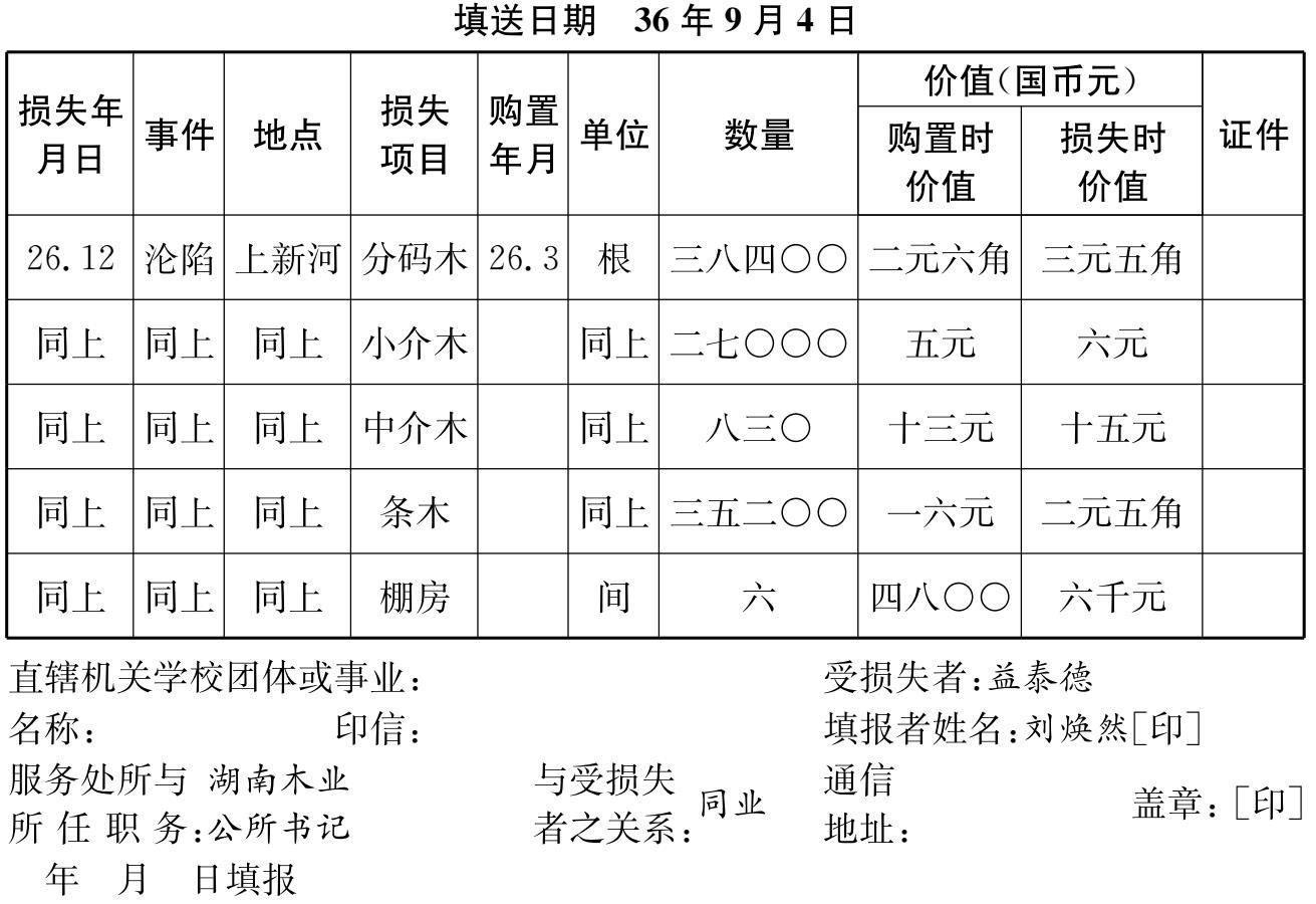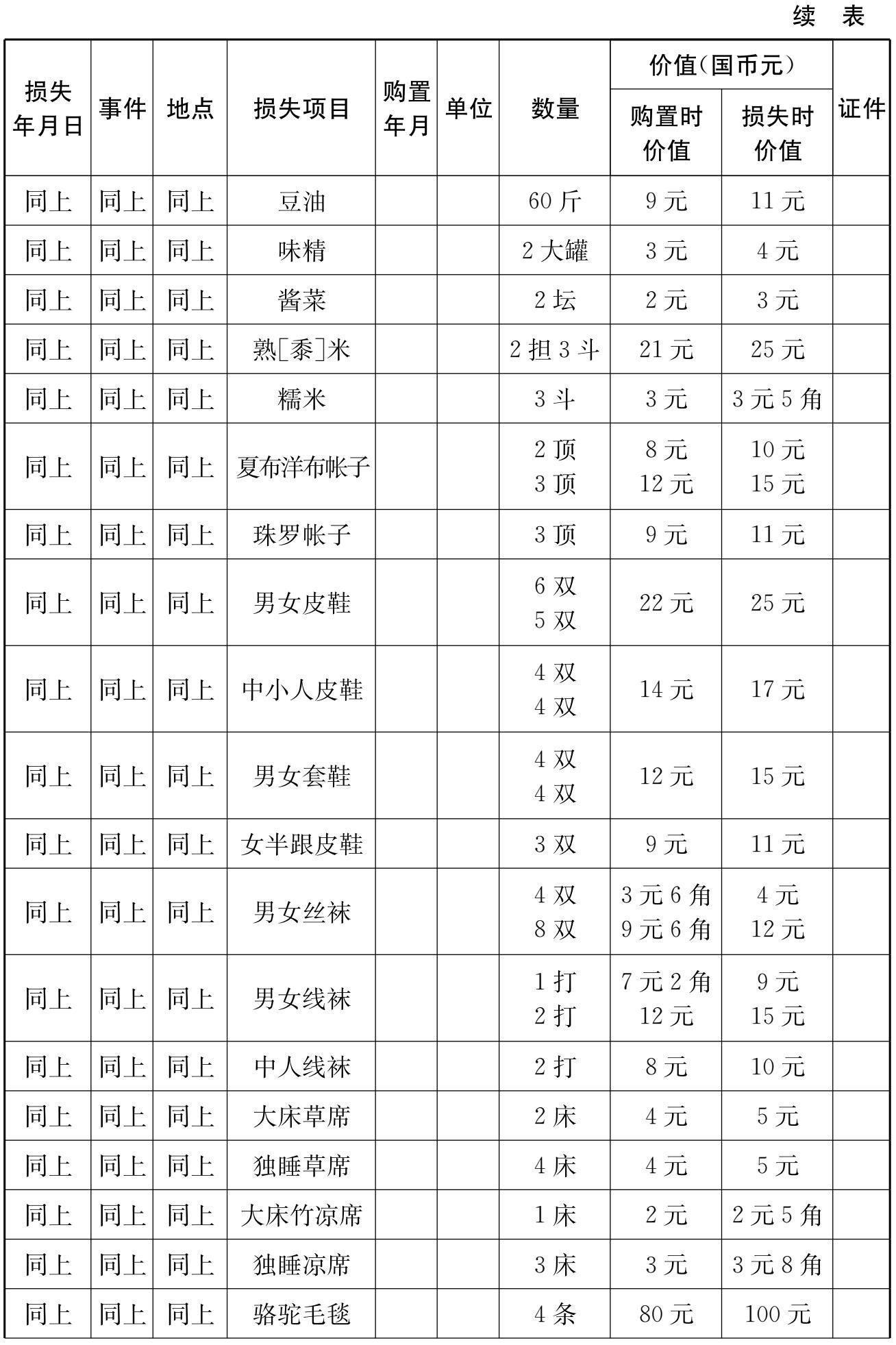 ② 本格及其上面几格填写位置可能有误,疑为“损失时价值”。原档如此。