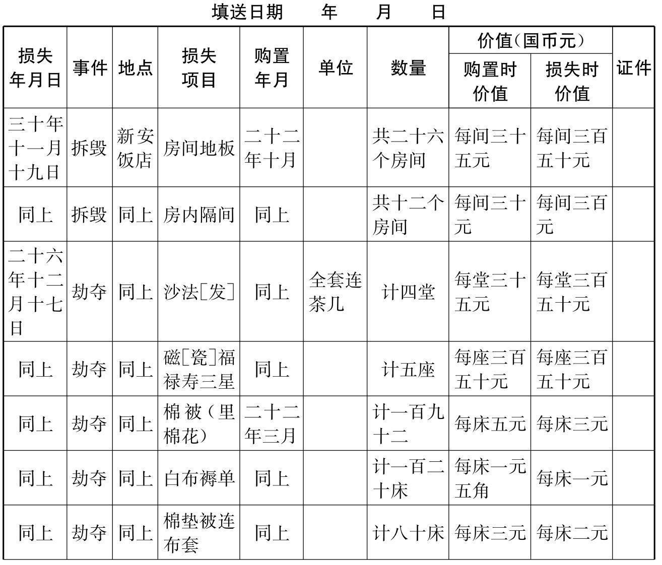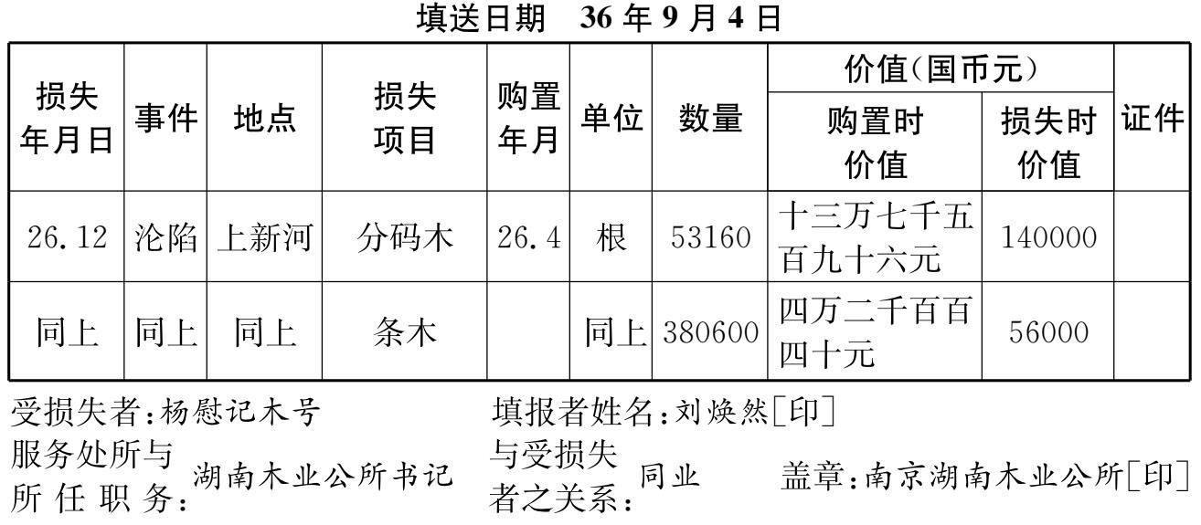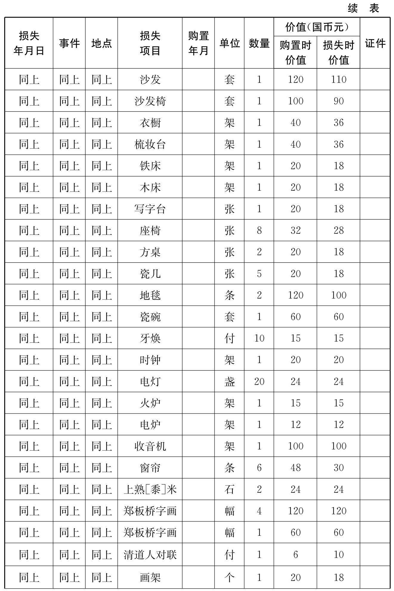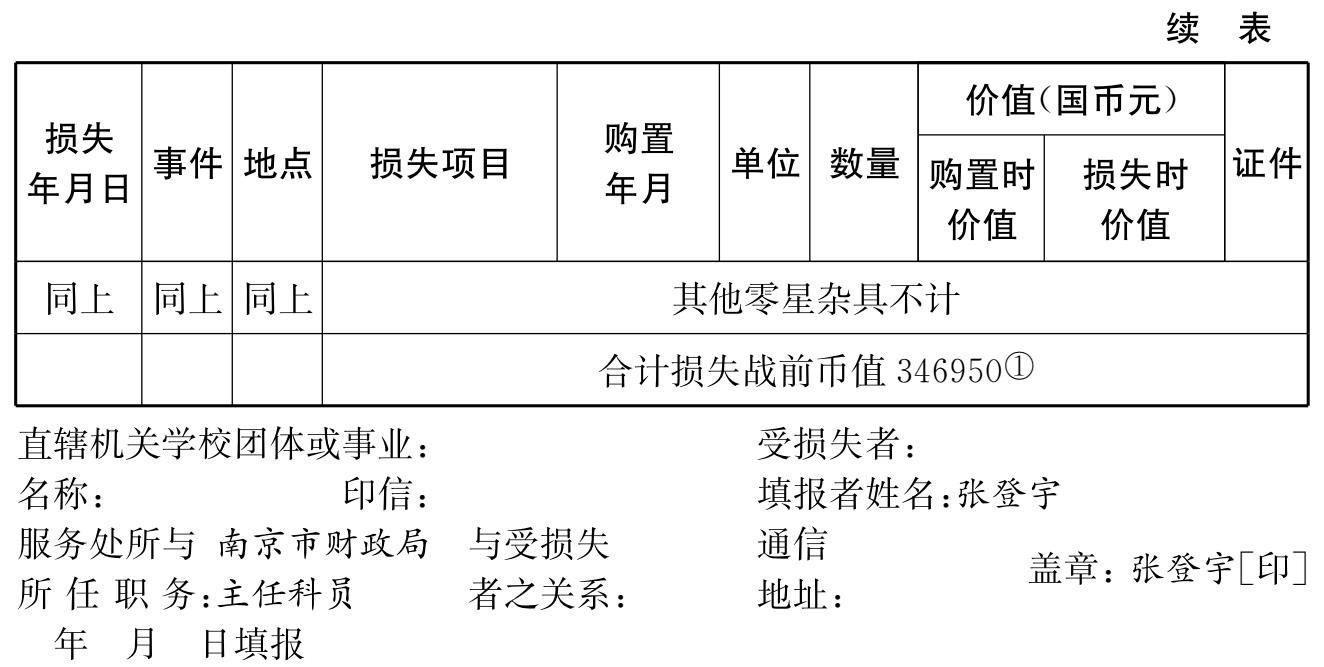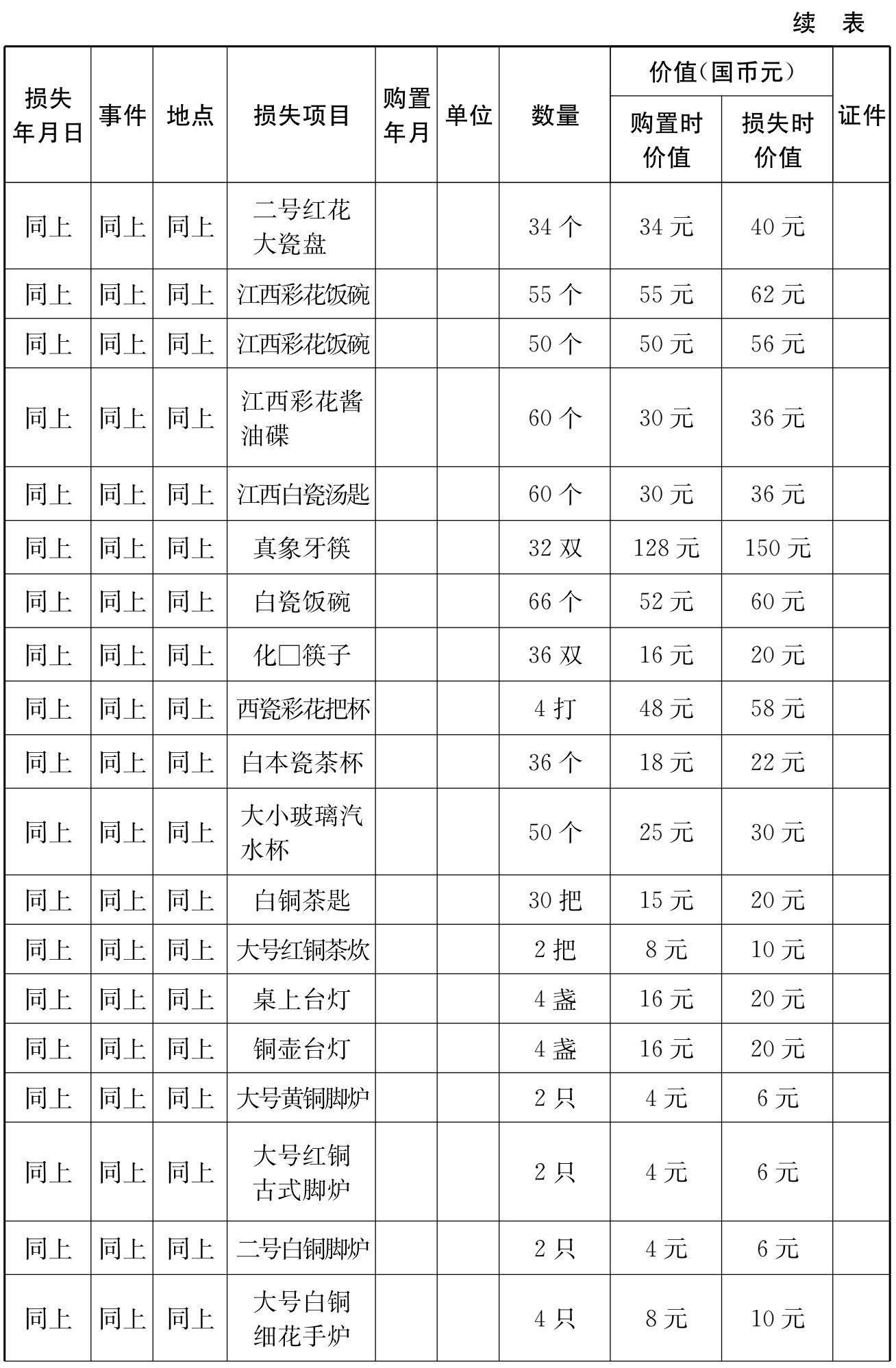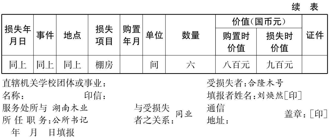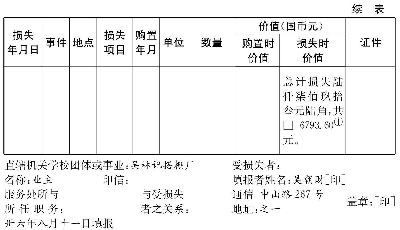 ② 本格及其上面几格填写位置可能有误,疑为“损失时价值”。原档如此。