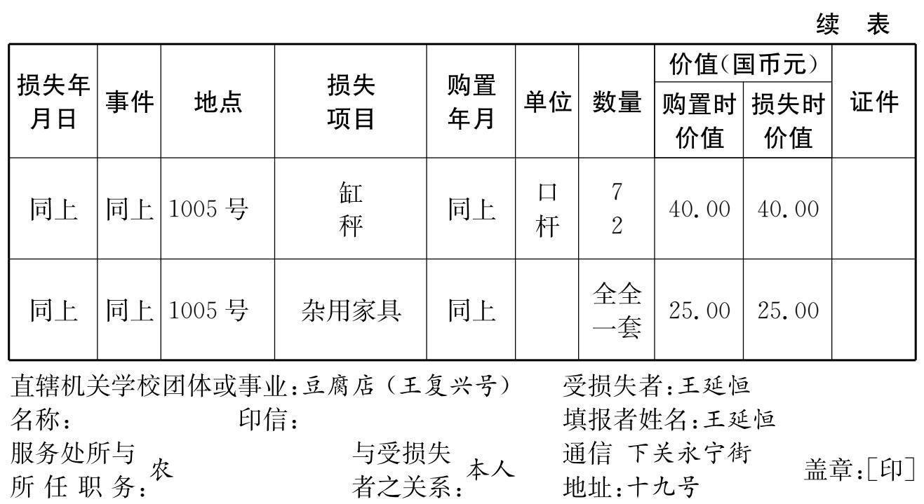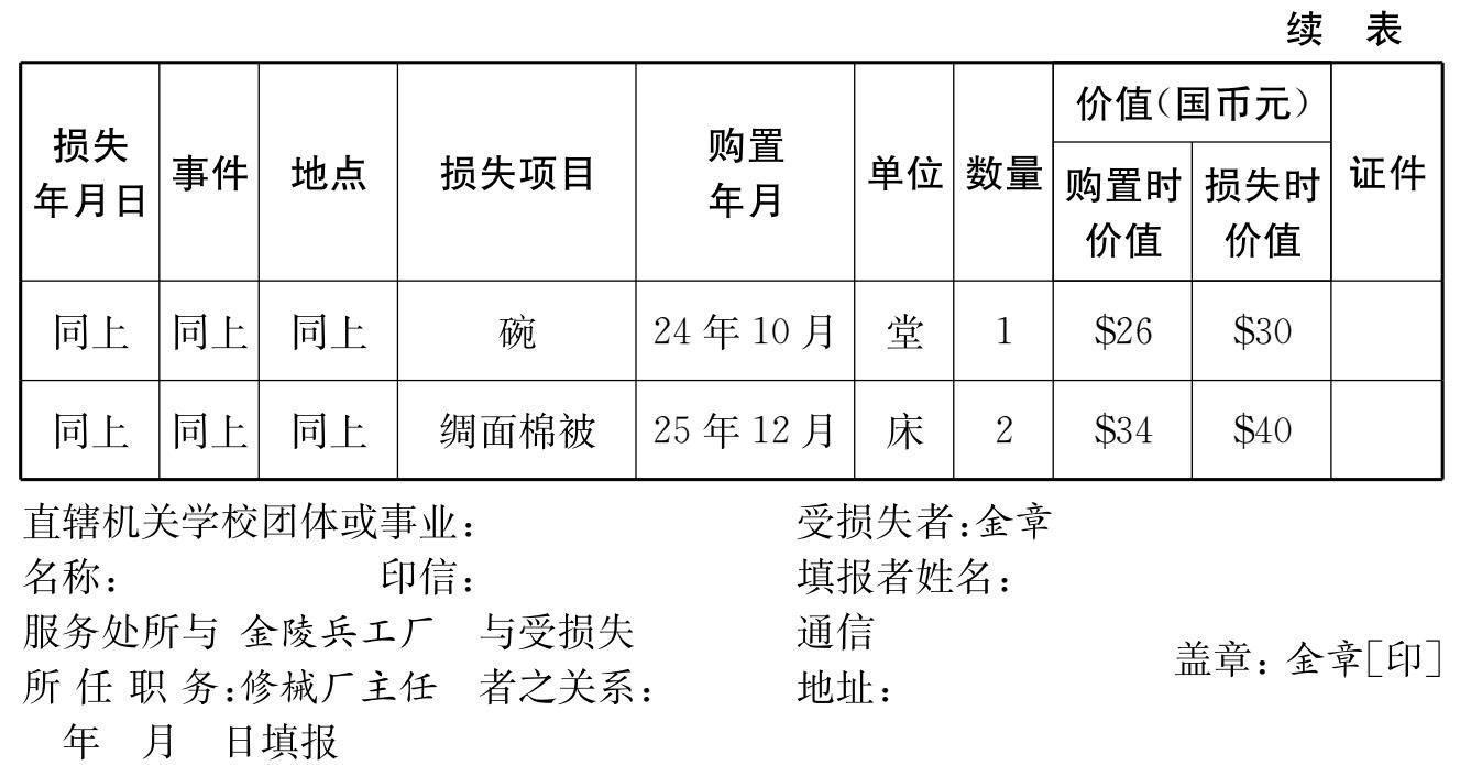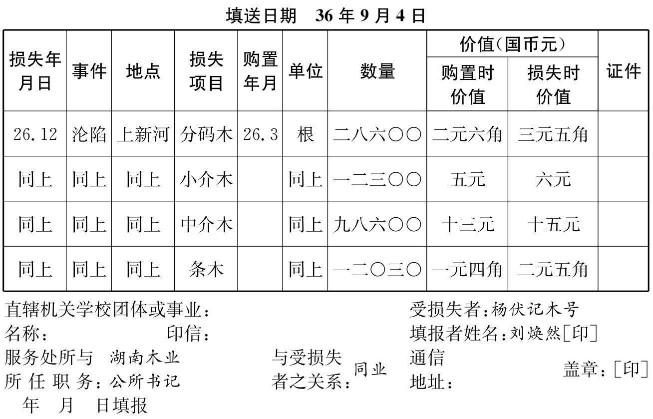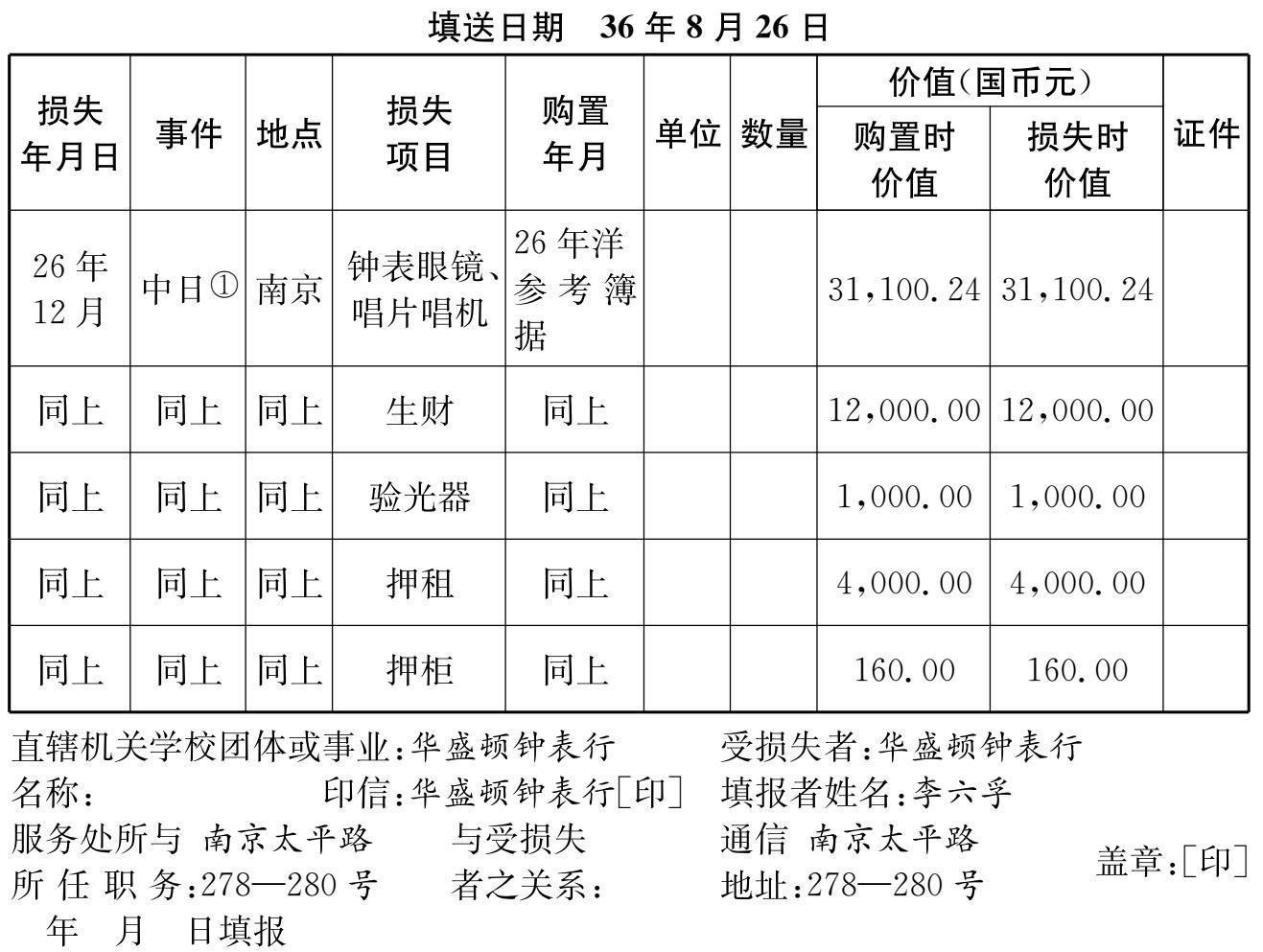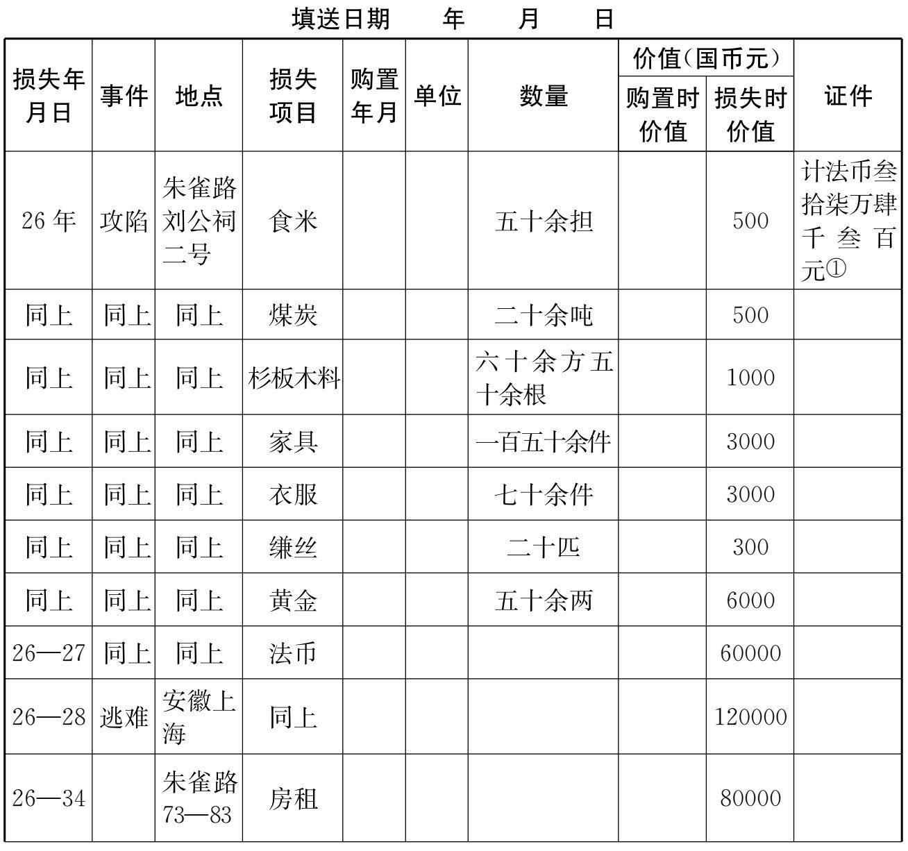 ② 本格及其上面几格填写位置可能有误,疑为“损失时价值”。原档如此。