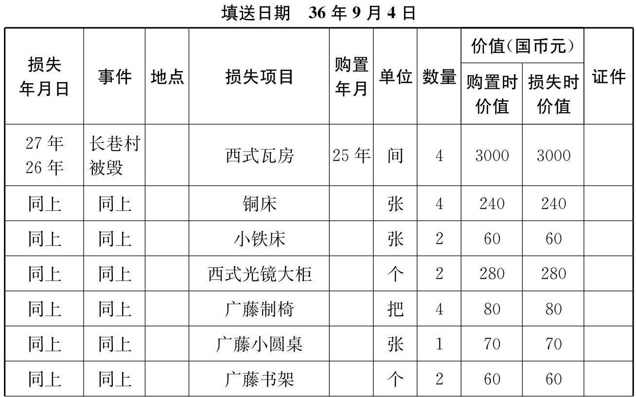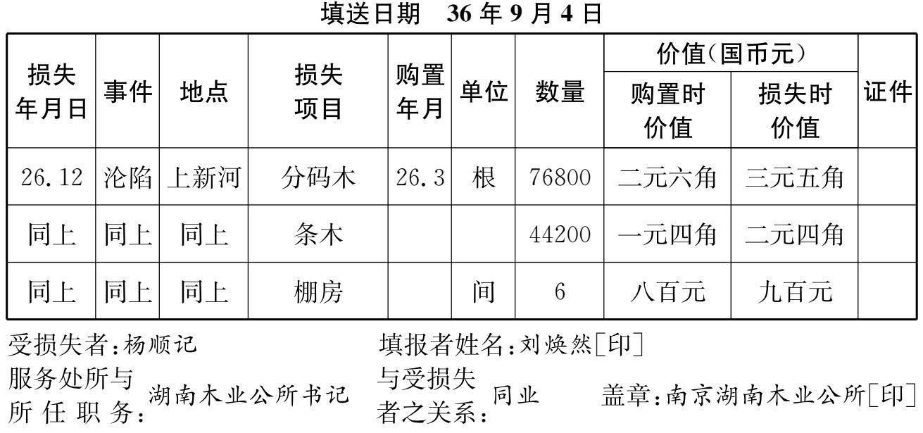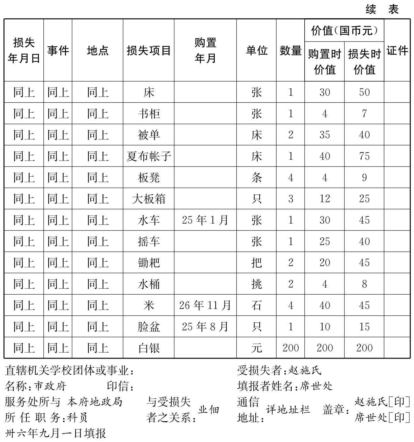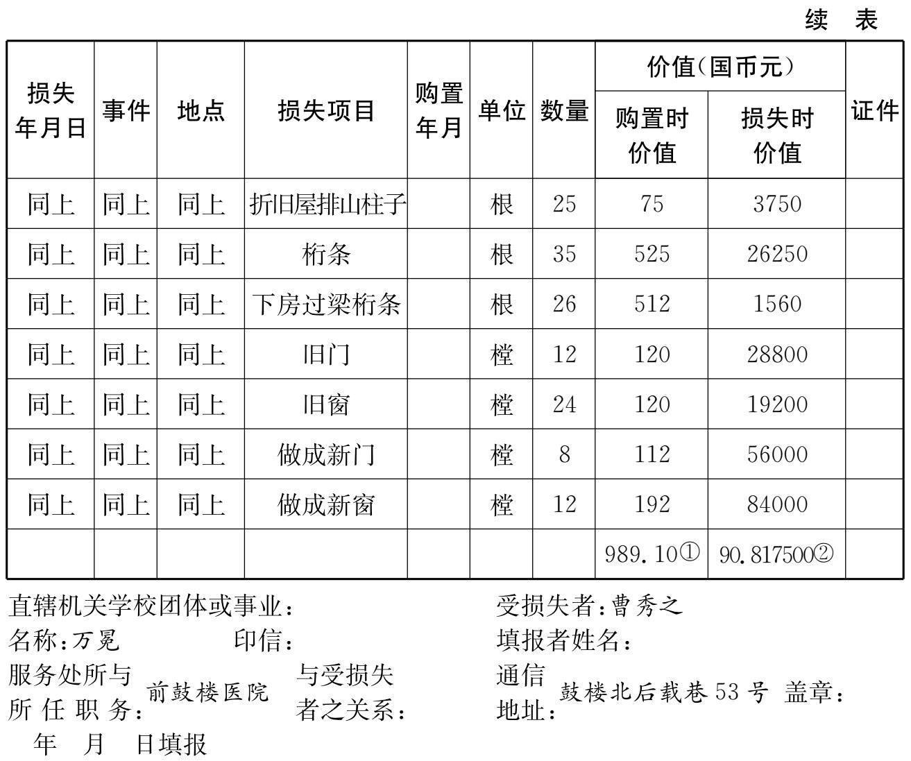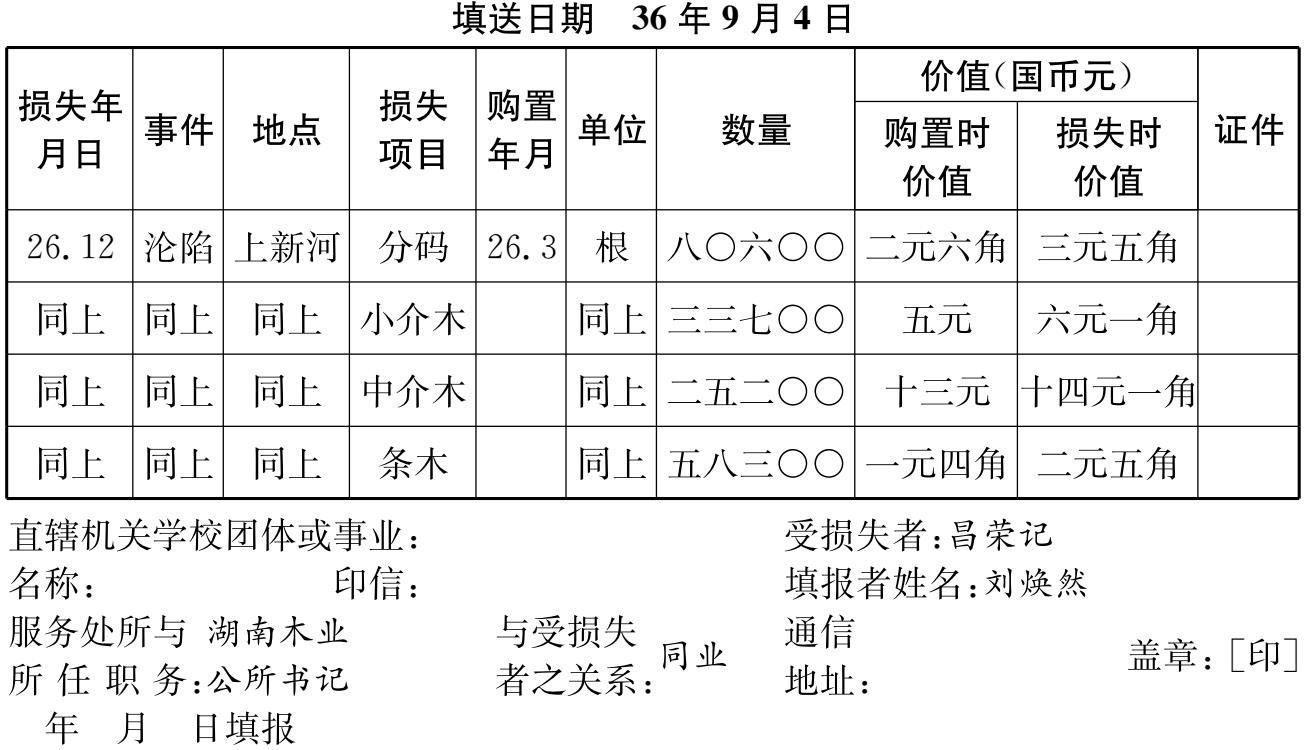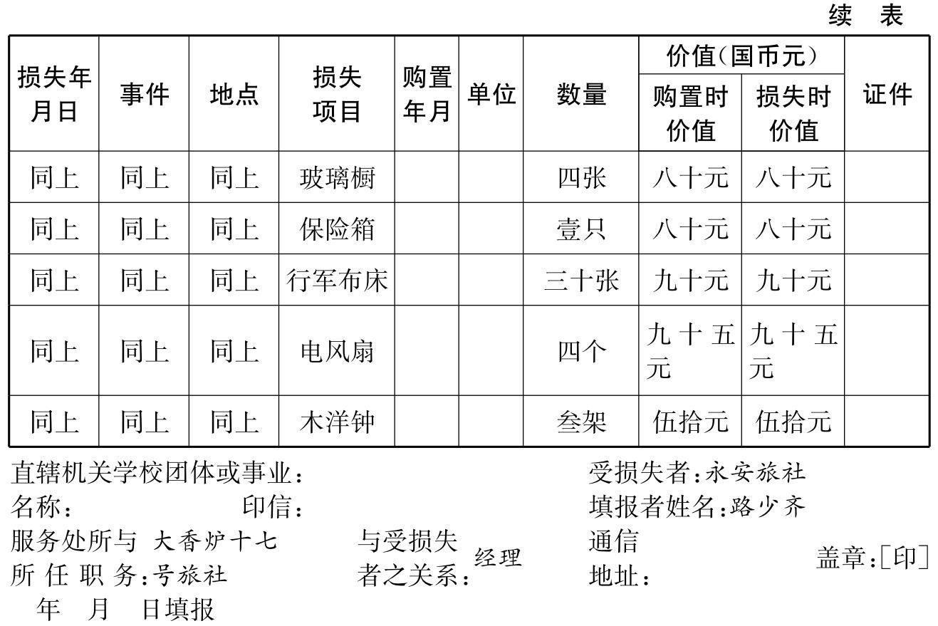 ② 本格及其上面几格填写位置可能有误,疑为“损失时价值”。原档如此。