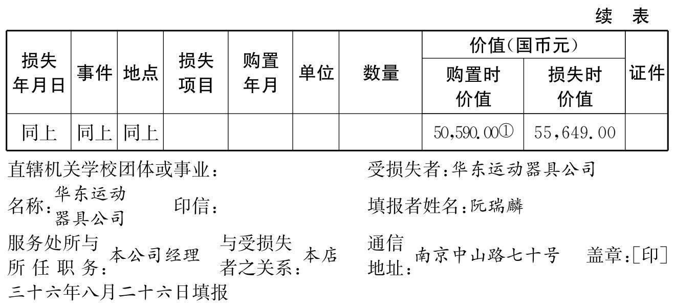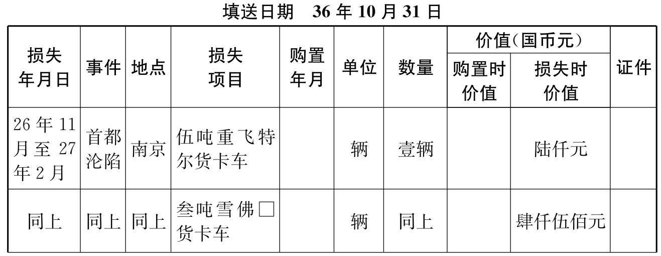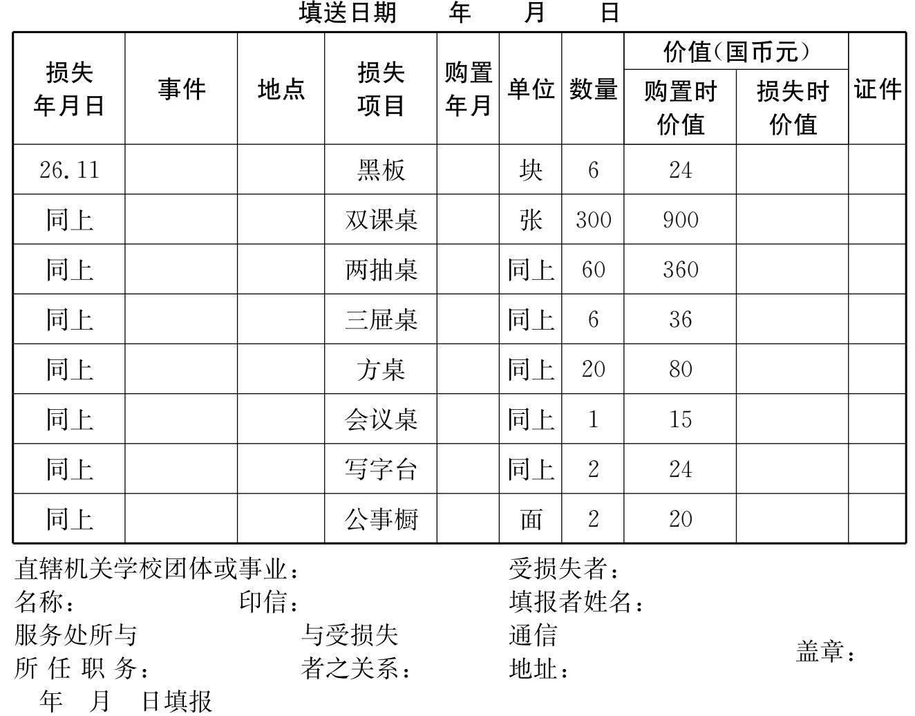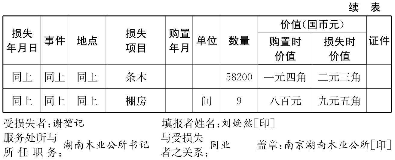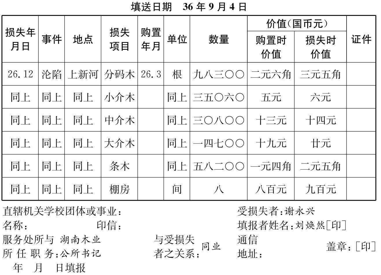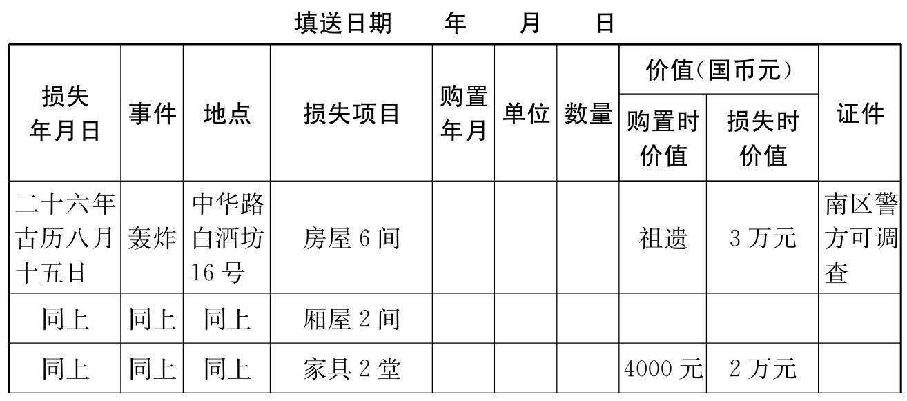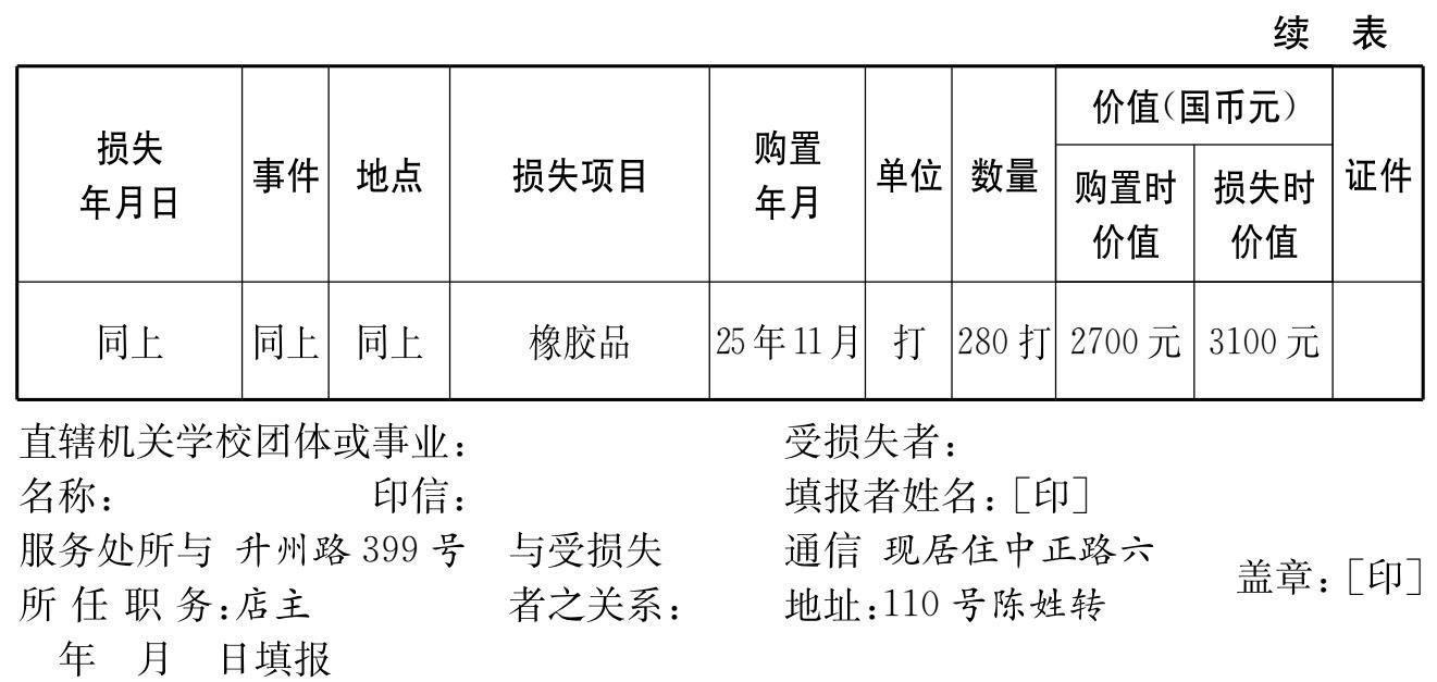 ② 本格及其上面几格填写位置可能有误,疑为“损失时价值”。原档如此。
