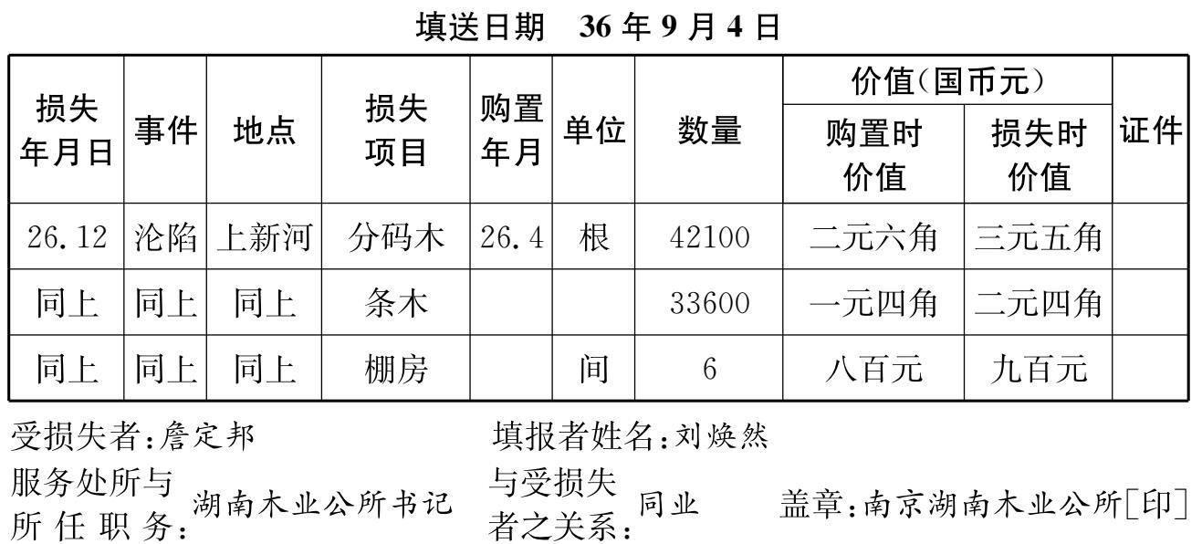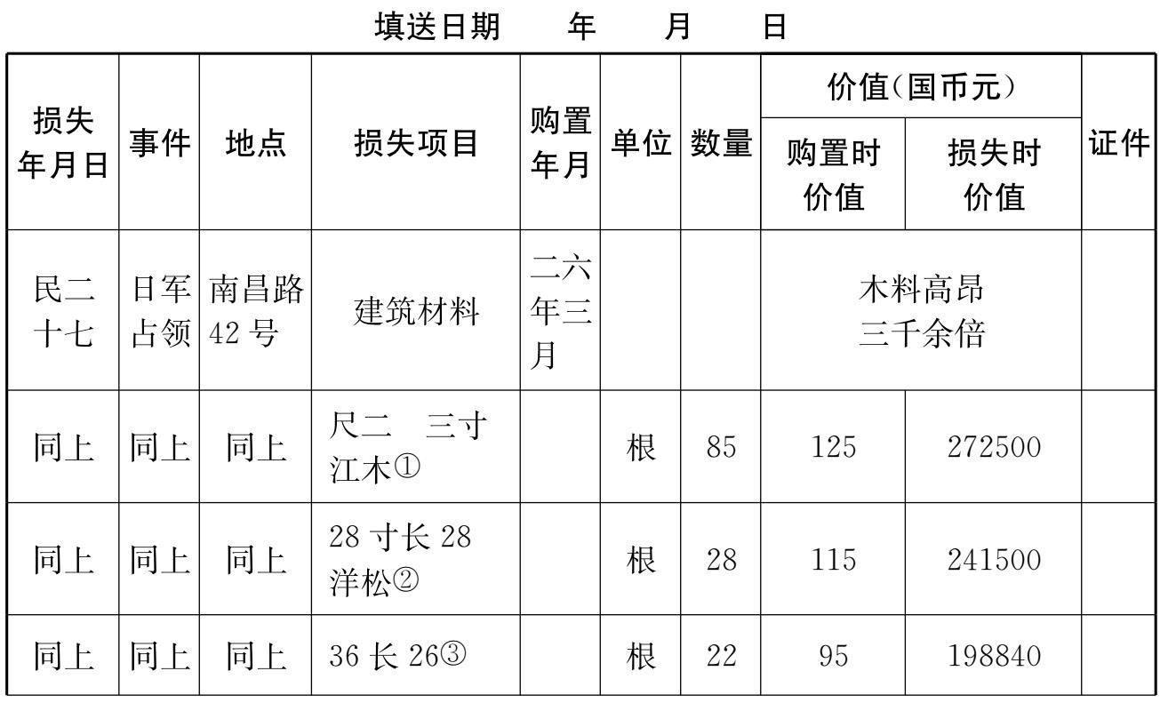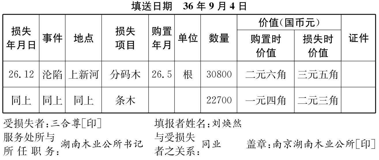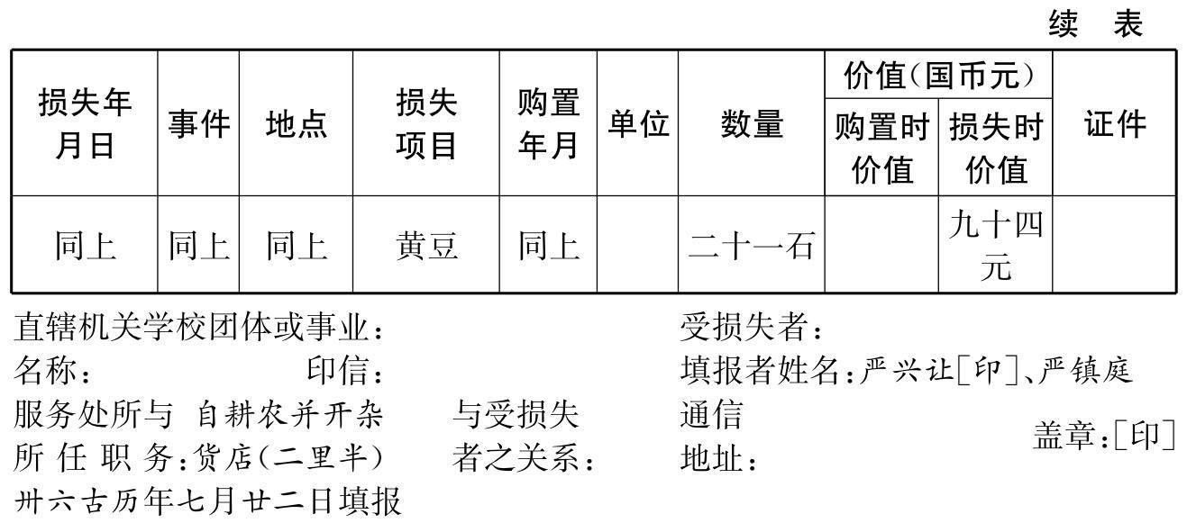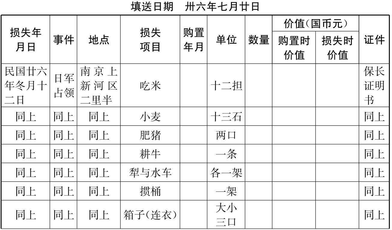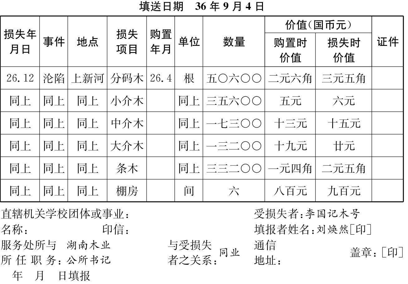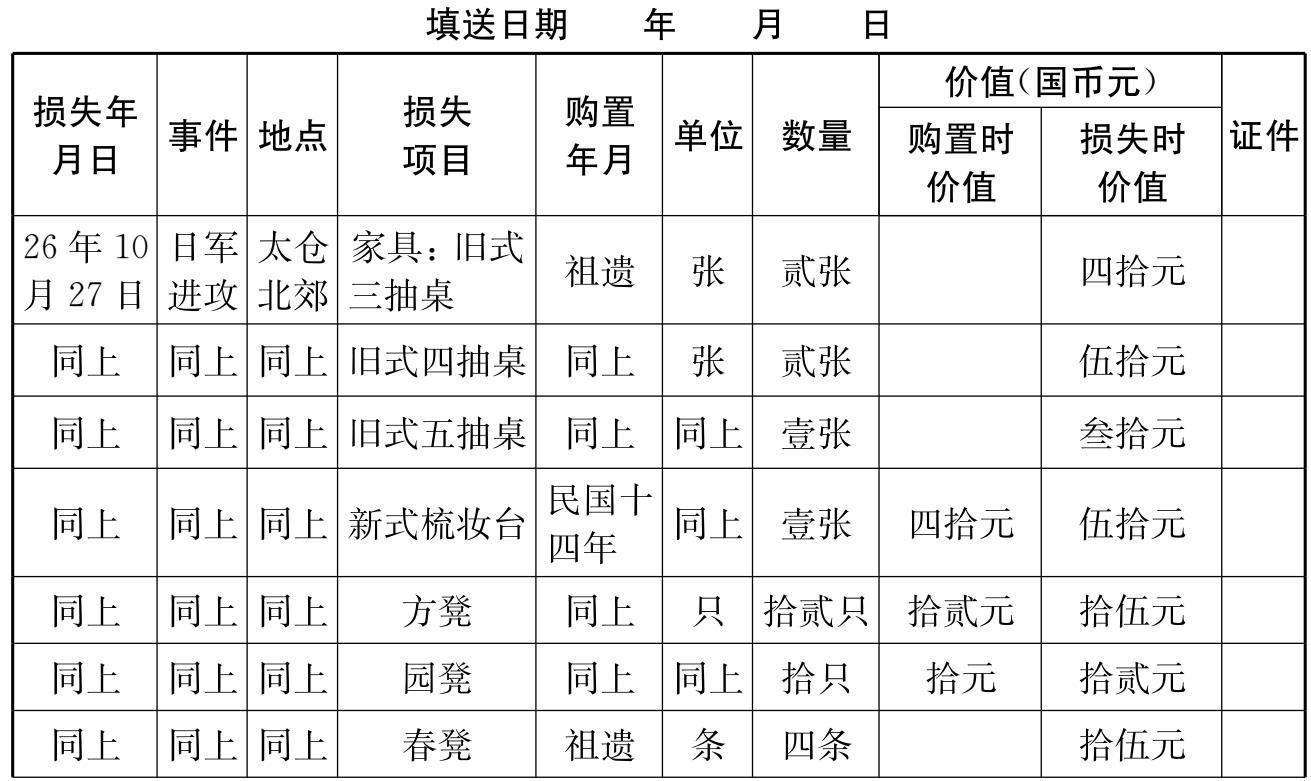 ② 本格及其上面几格填写位置可能有误,疑为“损失时价值”。原档如此。