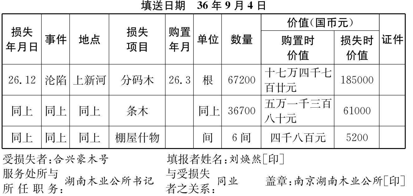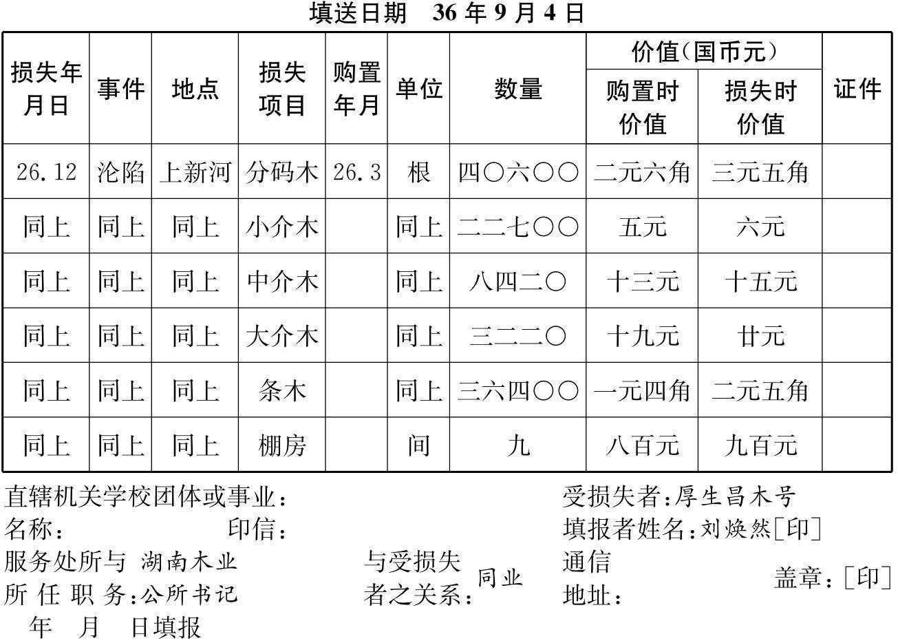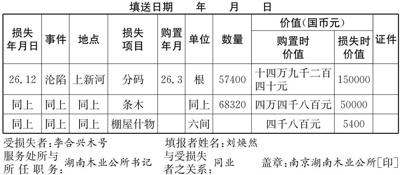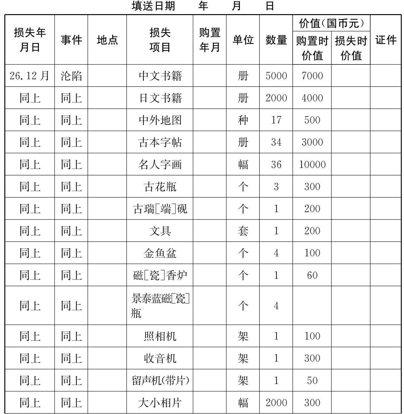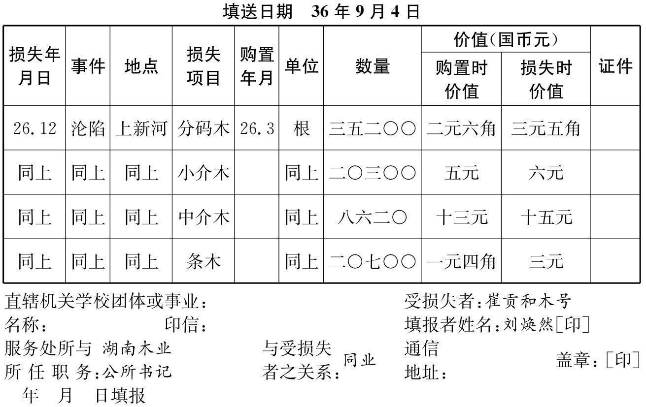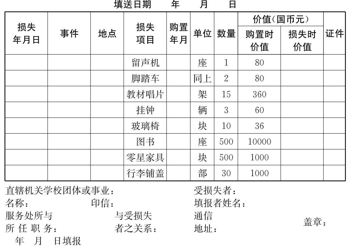 ② 本格及其上面几格填写位置可能有误,疑为“损失时价值”。原档如此。