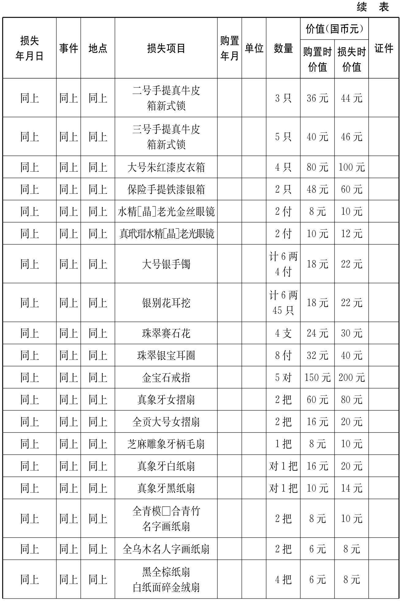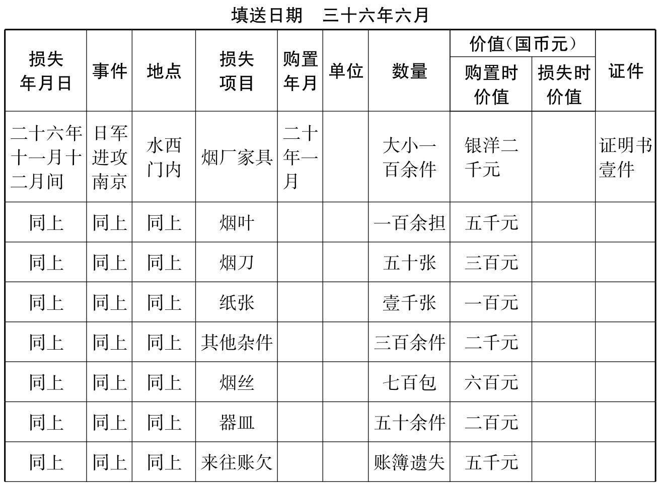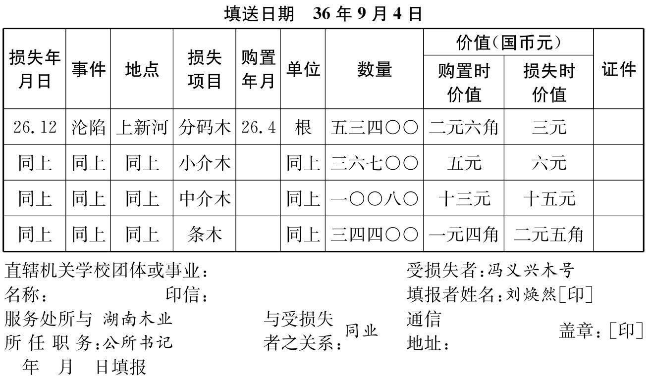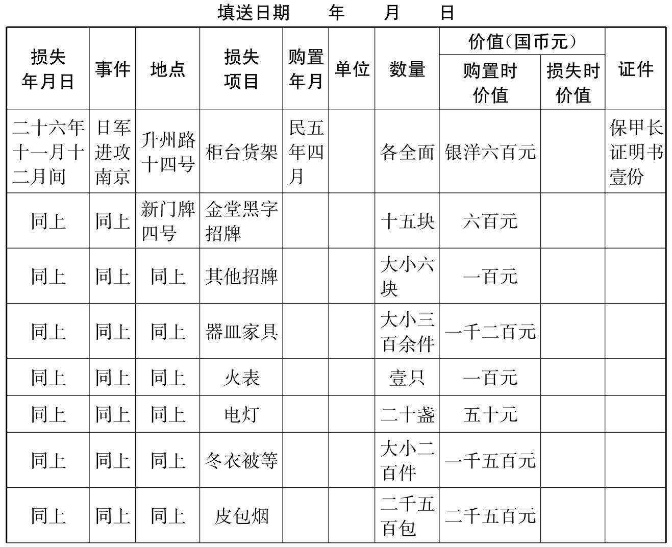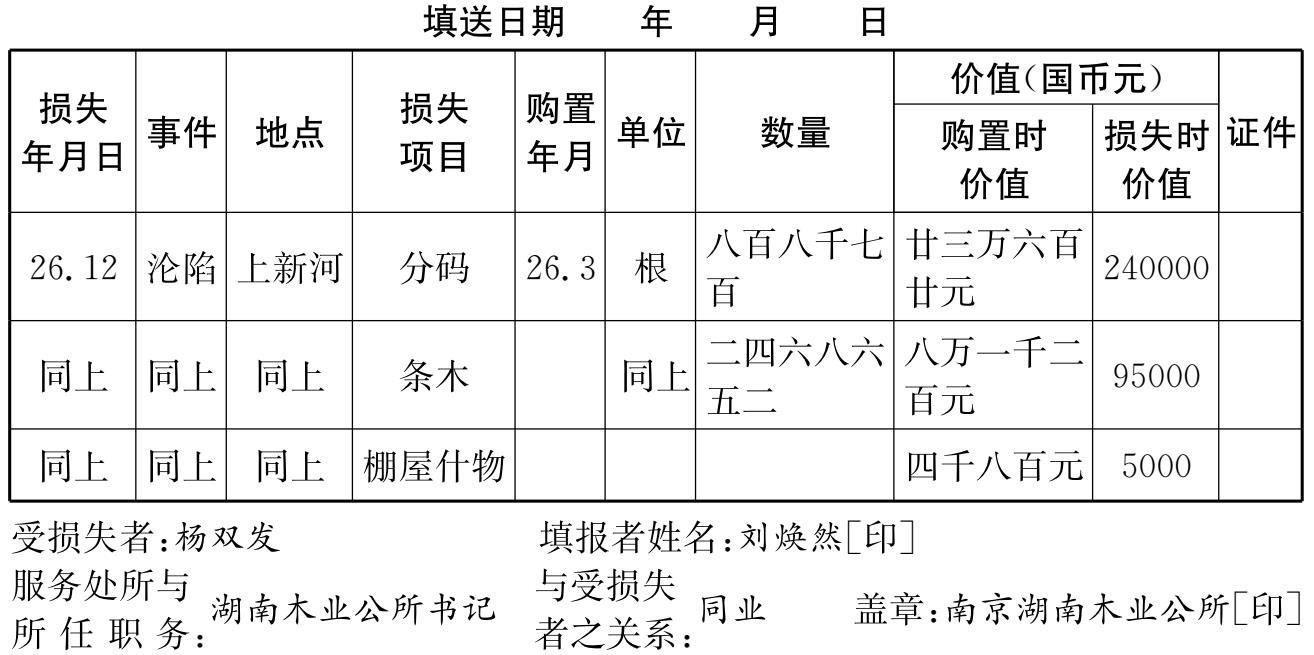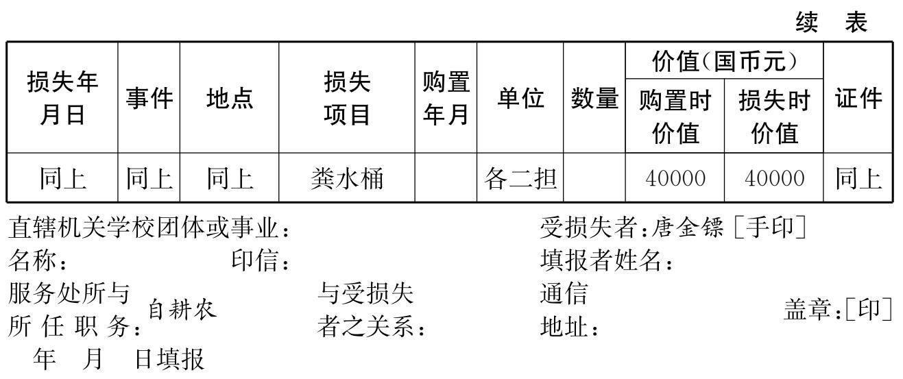 ② 本格及其上面几格填写位置可能有误,疑为“损失时价值”。原档如此。