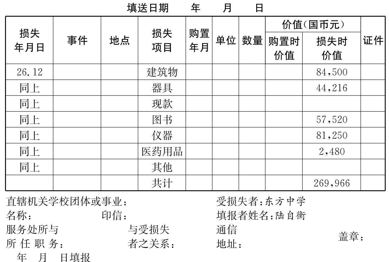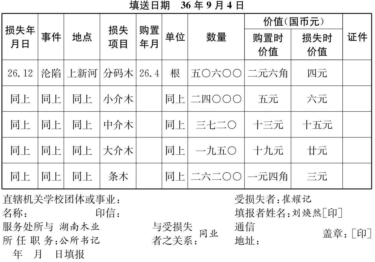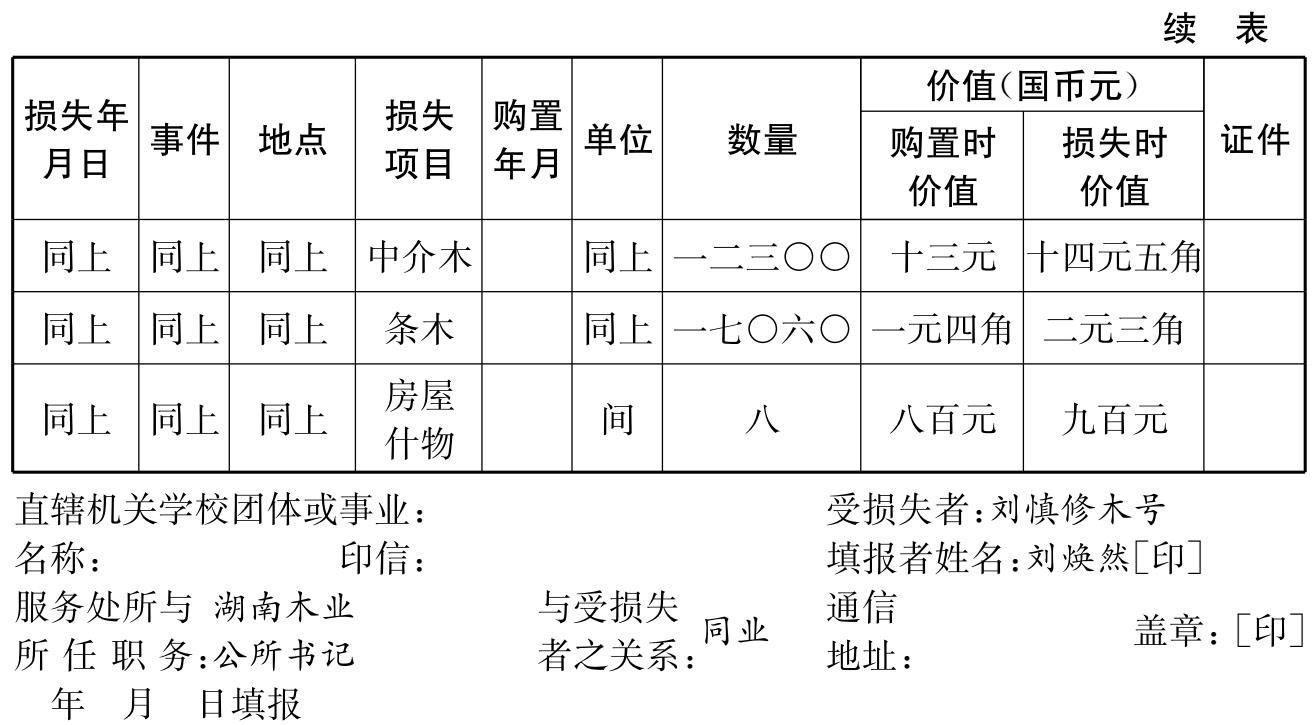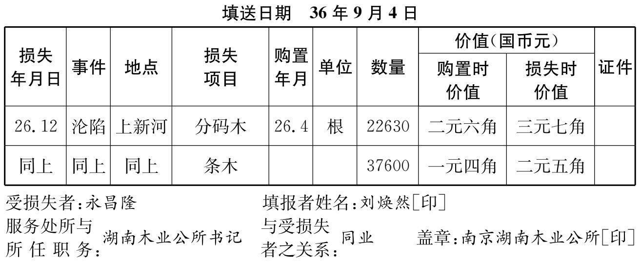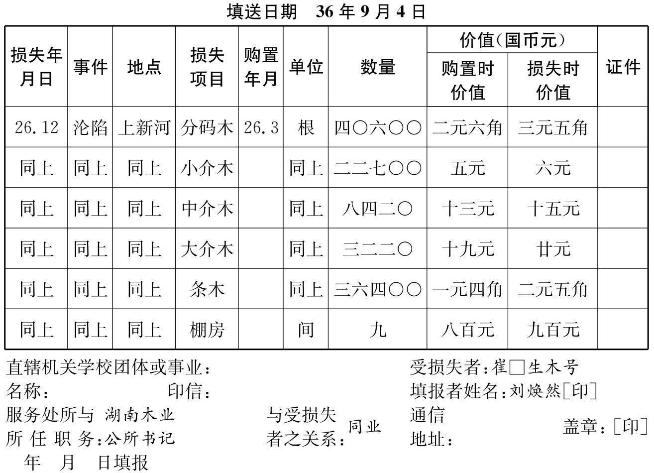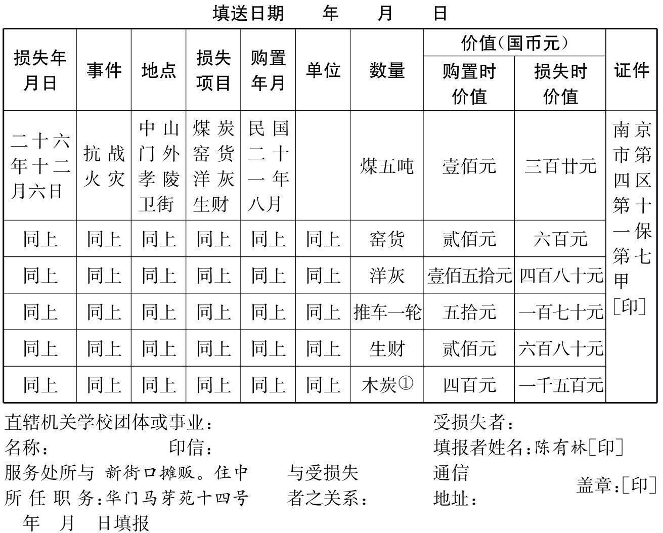 ② 本格及其上面几格填写位置可能有误,疑为“损失时价值”。原档如此。
