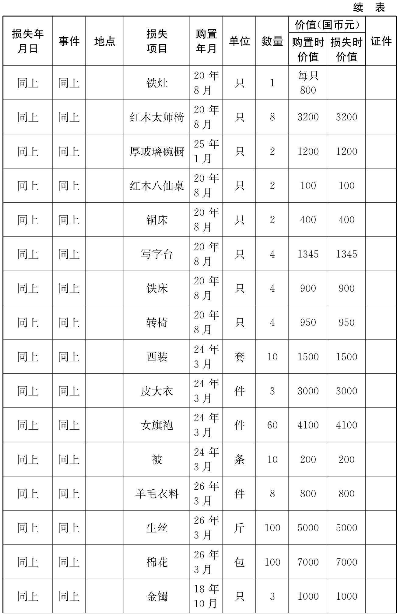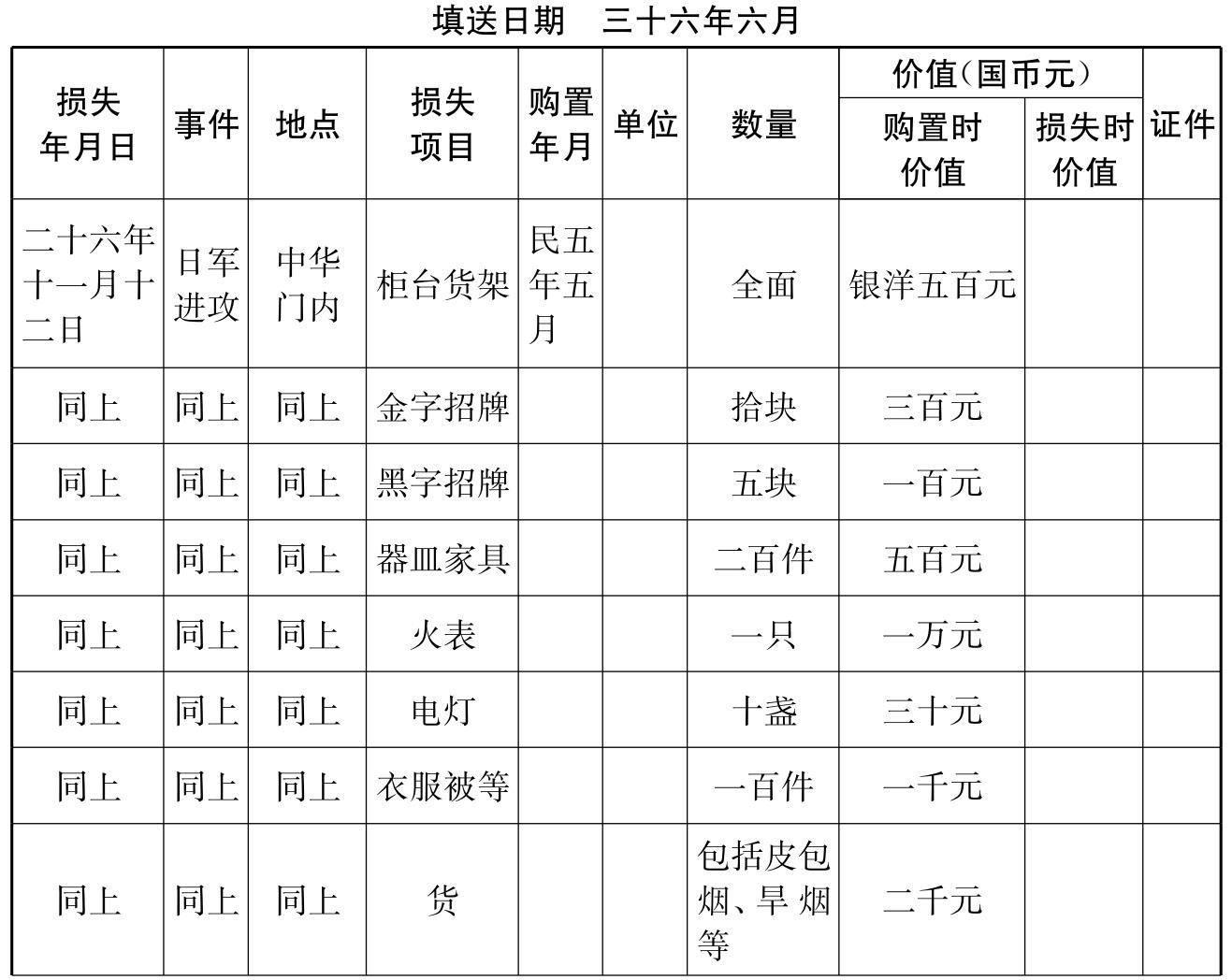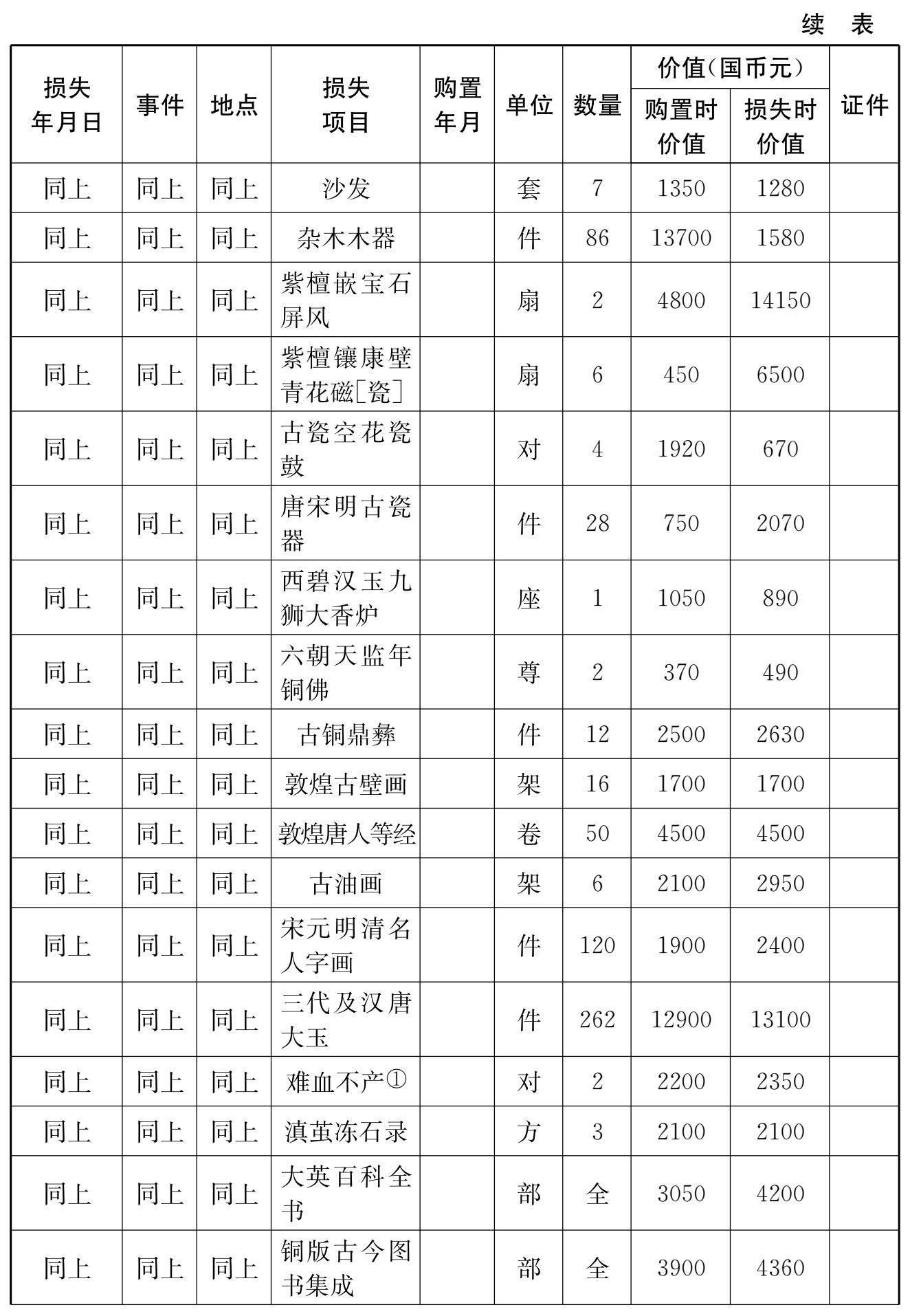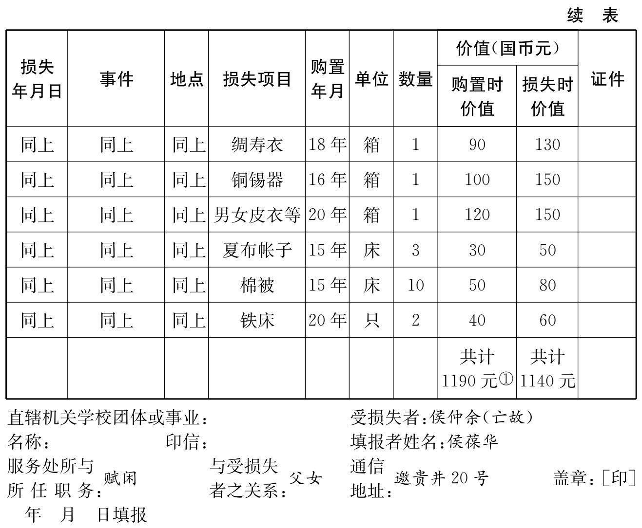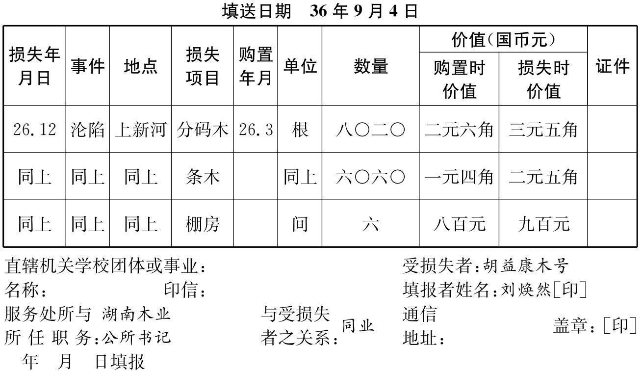② 本格及其上面几格填写位置可能有误,疑为“损失时价值”。原档如此。